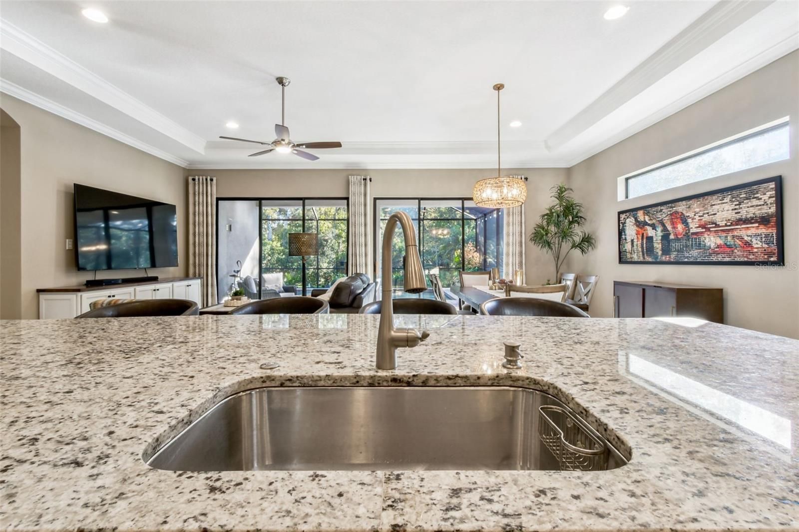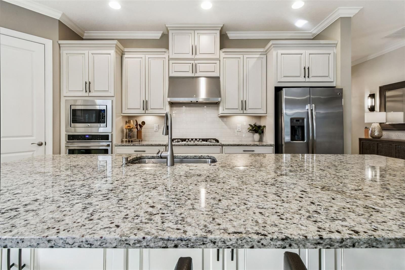 Presenting an exceptional, better than new POOL Home highly sought-after gated Esplanade at Tampa community. This low-maintenance property showcases a private courtyard entry with wrought-iron gate, natural stone accents, and a tile roof, providing impressive curb appeal. The home features an expansive foyer and a spacious great room layout that seamlessly integrates the gourmet kitchen, dining area, and living room with direct views of the pool and adjacent conservation land. The home offers three bedrooms, two full bathrooms, an inside utility room, and an oversized four-foot extended two-car garage. Notable kitchen features include white wood cabinetry, granite countertops, brushed nickel hardware, subway tile backsplash, and GE stainless steel appliances, comprising a five-burner gas range, vent hood, wall oven, microwave, and dishwasher. Additional enhancements include a coffee and dry bar with wine refrigerator and a counter-height breakfast bar open to the dining and living areas. The primary suite is privately positioned at the rear of the home, highlighted by three large windows overlooking the pool, tray ceilings with crown molding, dual walk-in closets, and an en-suite bathroom featuring a dual vanity, wood cabinetry, granite counters, sizable soaking tub, separate walk-in shower with mosaic tile accents, and a private water closet. Two secondary bedrooms, located at the front of the home, share a full bath. The inside laundry room is equipped with extra cabinetry, and washer/dryer, which convey with the property. Outdoor amenities include a large covered lanai with Chicago-style brick pavers and a heated private pool with sun shelf, and PebbleTec finish overlooking tranquil conservation. The property has many upgrades, such as pool salt system and heater, 20x20 ceramic tile flooring, luxury wood-look laminate in all bedrooms, crown molding, tray ceilings, tankless hot water heater, and exterior TV pre-wiring. The garage is extended for added flexibility, and landscaping is included in the low-maintenance community. Residents enjoy no CDD fees and access to resort-style amenities including a clubhouse, fitness center, pool, spa, pickleball courts, and numerous social activities.
