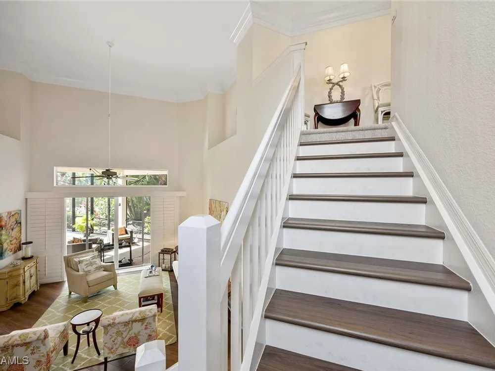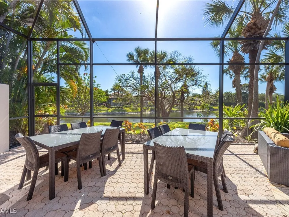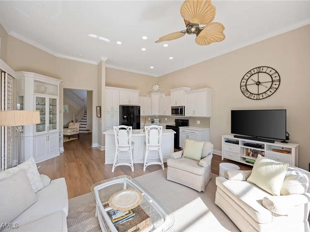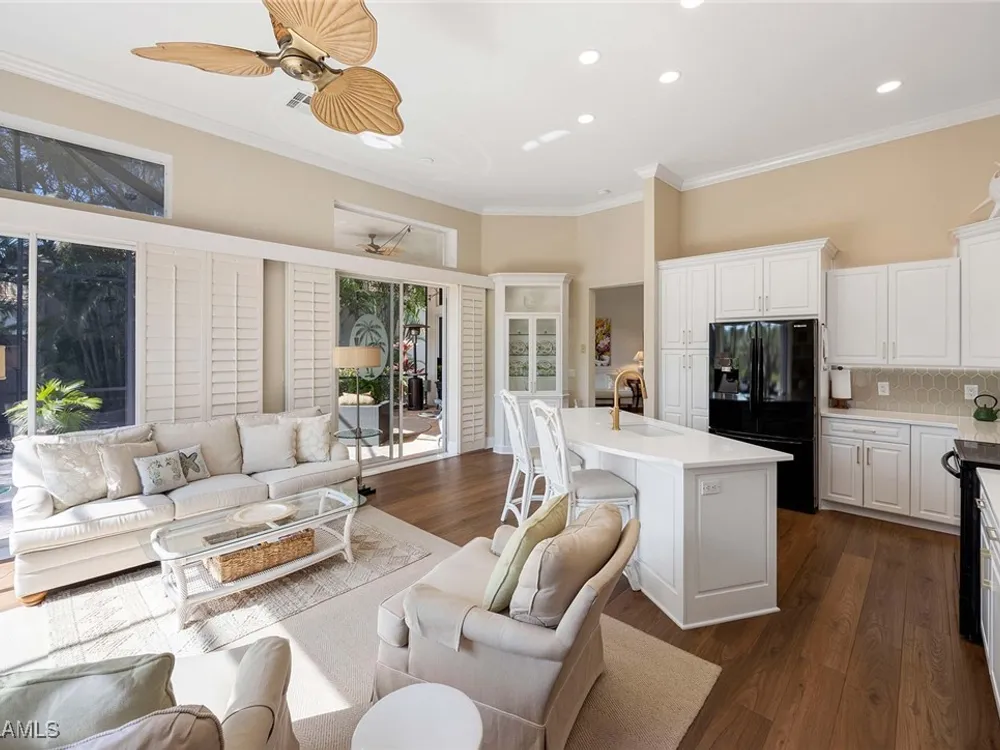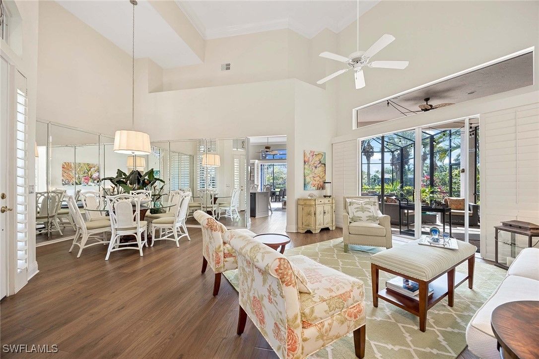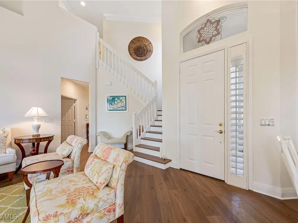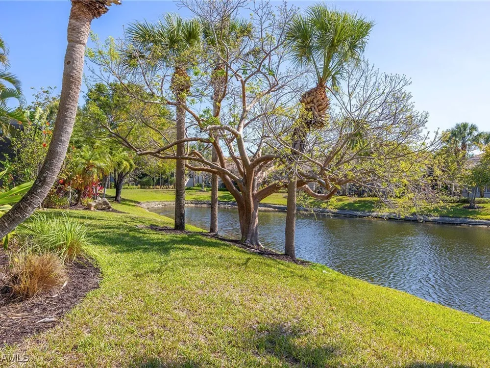 Great location in Fiddler's Creek, this charming single-family home in Pepper Tree is minutes from the main entrance as well as the world-class club, spa and fitness center. Ideally with a stunning lake view, this exceptional two-story home includes four bedrooms, three baths and the warm feeling that embraces the essence of South Florida living. The expansive combination living and dining area is roomy and open, drawing you into the open vaulted ceilings and the additional Jack and Jill guest bedrooms of the second floor. A spacious family room and an open kitchen create a bright environment that rivals only the sun-drenched patio of the back lanai. Two-story high ceilings with crown moldings enhance this newly painted, delightful home. The recently remodeled kitchen and lighting throughout are also special features. The extra-large outdoor space is fully screened with room for a full-sized pool and spa. The fourth bedroom, on the main level with a full bath, can efficiently serve as an office or den. Across the hall, the primary bedroom suite opens to the rear lanai and includes two walk-in closets. The master bath with dual sink, separate shower, and garden bath is roomy and bright. Stunning new wood flooring adds to the home's comfortable and sophisticated feel. Additional features of this exceptional home include a remodeled laundry room, central vacuum system and a 10-year transferable warranty for the air conditioner. The refinished garage floor, overhead enclosed cabinetry, extra-wide driveway and plantation shutter window treatments show attention to detail. Fiddler's Creek is an amenity-rich country club environment with a full-service spa, fitness and wellness center with pickleball, bocce ball, tennis and more. A full-time recreation director and two exceptional restaurants complete the picture of luxurious living, close to everything South Florida has to offer.