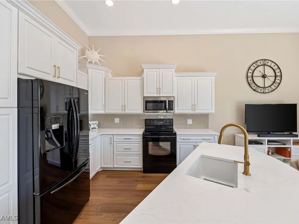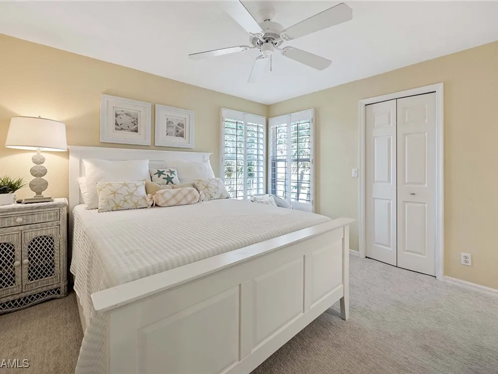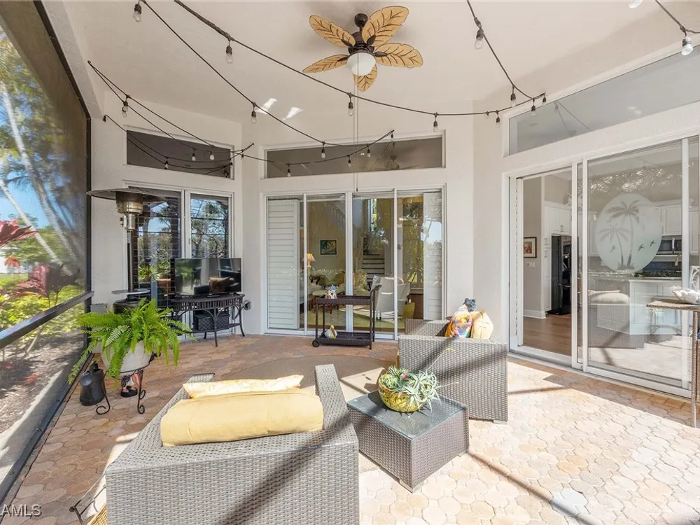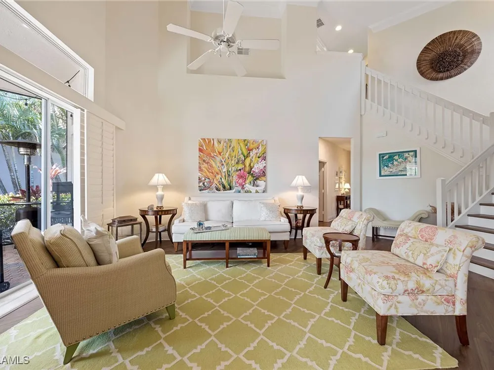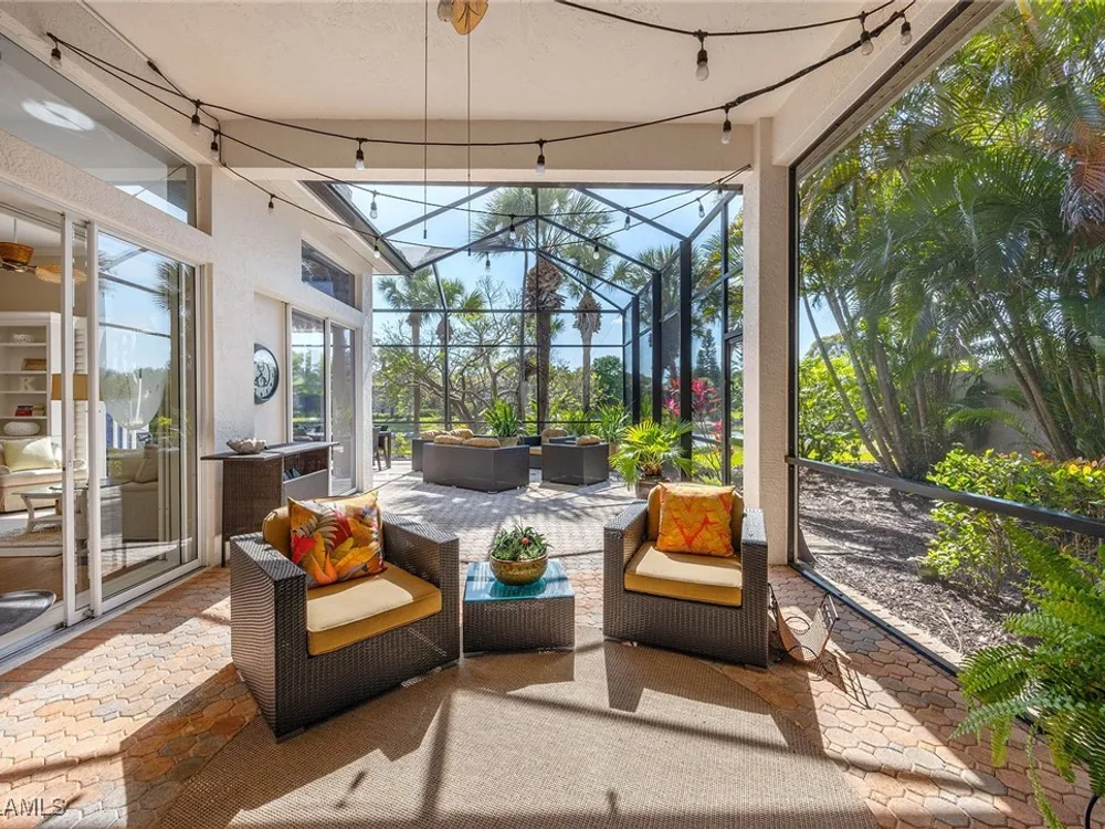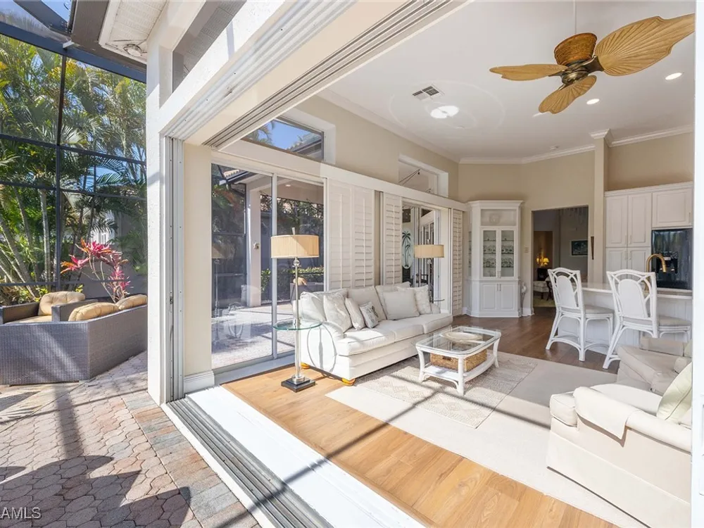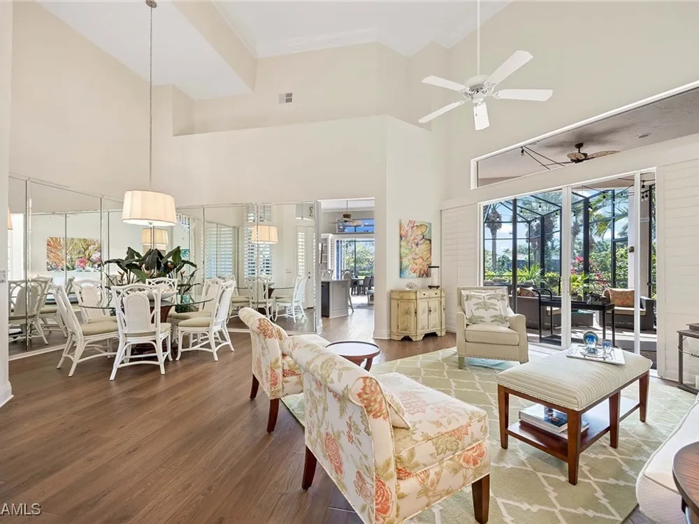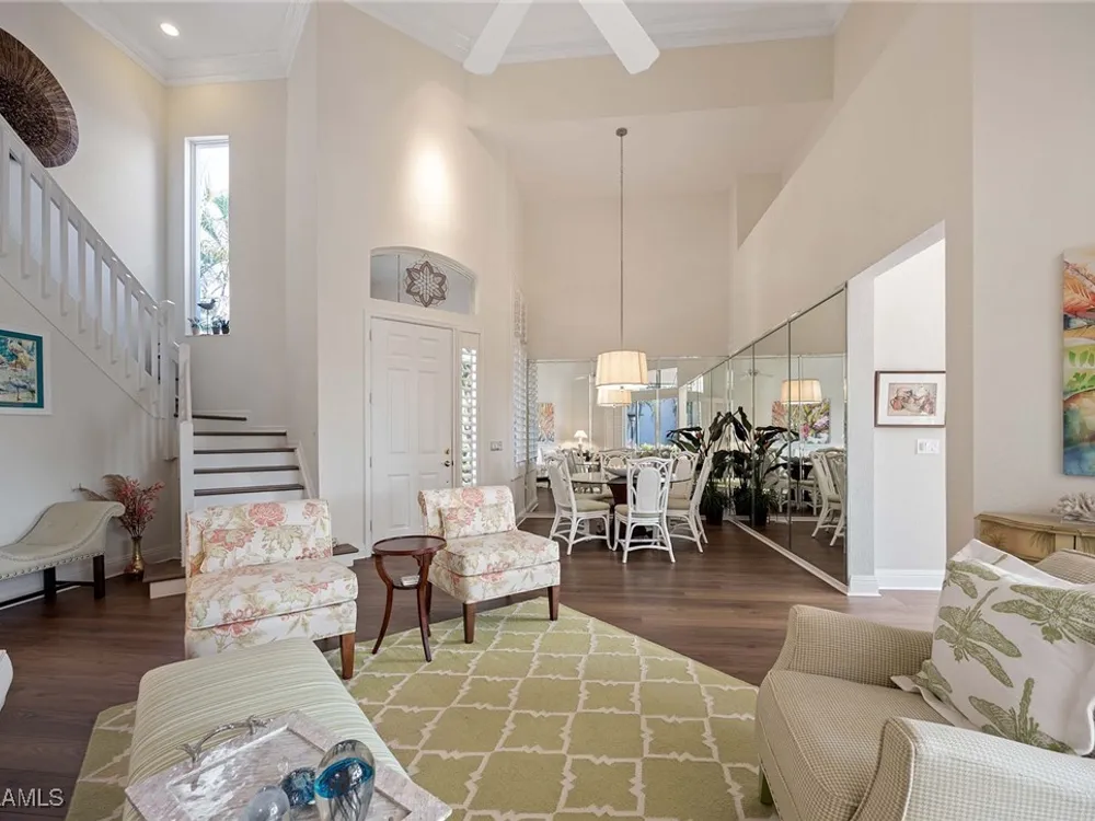 Great location in Fiddler's Creek, this charming single-family home in Pepper Tree is minutes from the main entrance as well as the world-class club, spa and fitness center. Ideally with a stunning lake view, this exceptional two-story home includes four bedrooms, three baths and the warm feeling that embraces the essence of South Florida living. The expansive combination living and dining area is roomy and open, drawing you into the open vaulted ceilings and the additional Jack and Jill guest bedrooms of the second floor. A spacious family room and an open kitchen create a bright environment that rivals only the sun-drenched patio of the back lanai. Two-story high ceilings with crown moldings enhance this newly painted, delightful home. The recently remodeled kitchen and lighting throughout are also special features. The extra-large outdoor space is fully screened with room for a full-sized pool and spa. The fourth bedroom, on the main level with a full bath, can efficiently serve as an office or den. Across the hall, the primary bedroom suite opens to the rear lanai and includes two walk-in closets. The master bath with dual sink, separate shower, and garden bath is roomy and bright. Stunning new wood flooring adds to the home's comfortable and sophisticated feel. Additional features of this exceptional home include a remodeled laundry room, central vacuum system and a 10-year transferable warranty for the air conditioner. The refinished garage floor, overhead enclosed cabinetry, extra-wide driveway and plantation shutter window treatments show attention to detail. Fiddler's Creek is an amenity-rich country club environment with a full-service spa, fitness and wellness center with pickleball, bocce ball, tennis and more. A full-time recreation director and two exceptional restaurants complete the picture of luxurious living, close to everything South Florida has to offer.