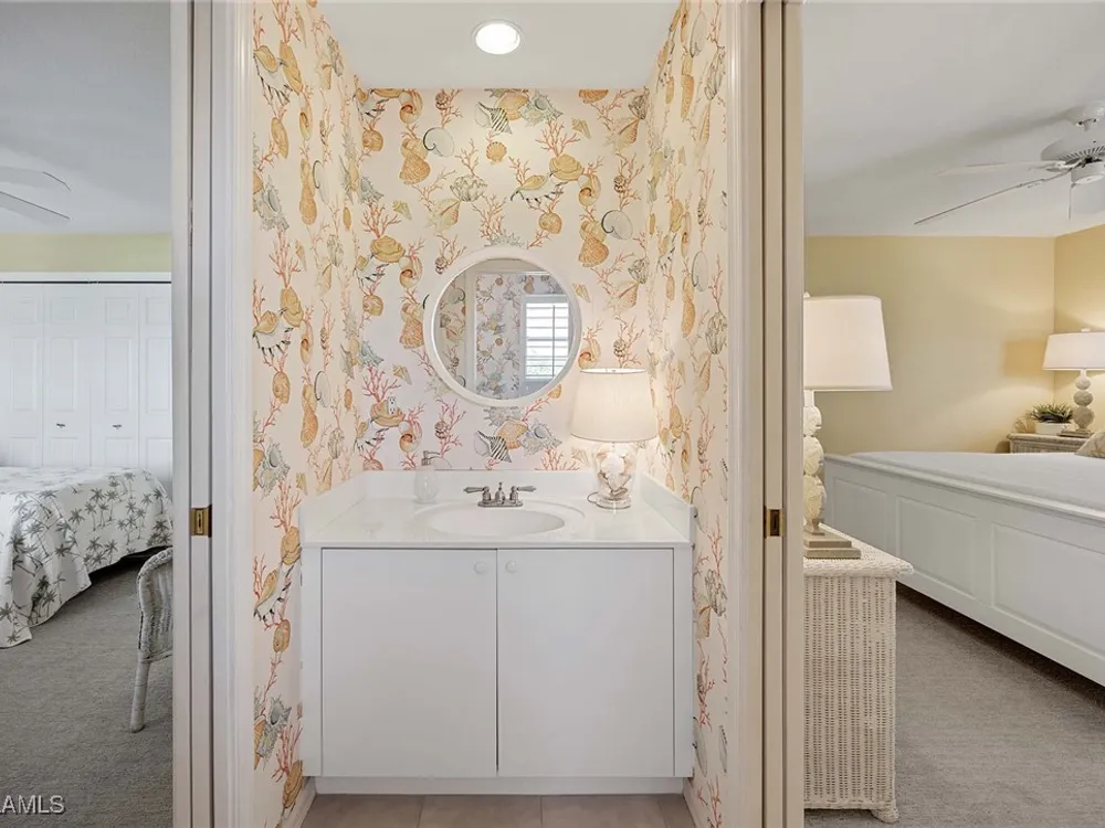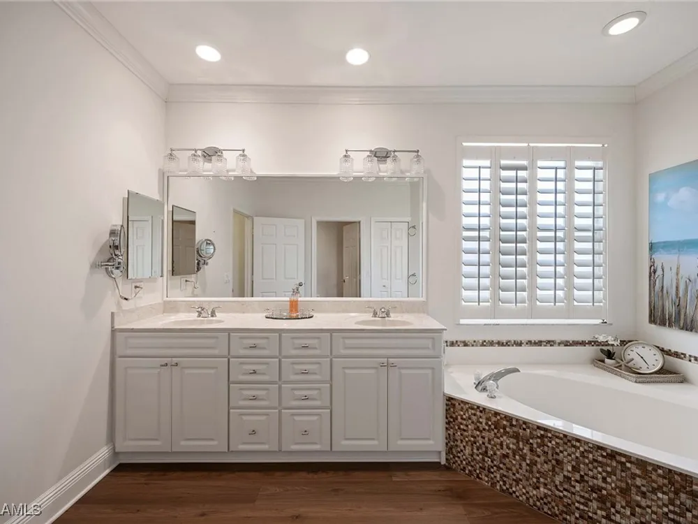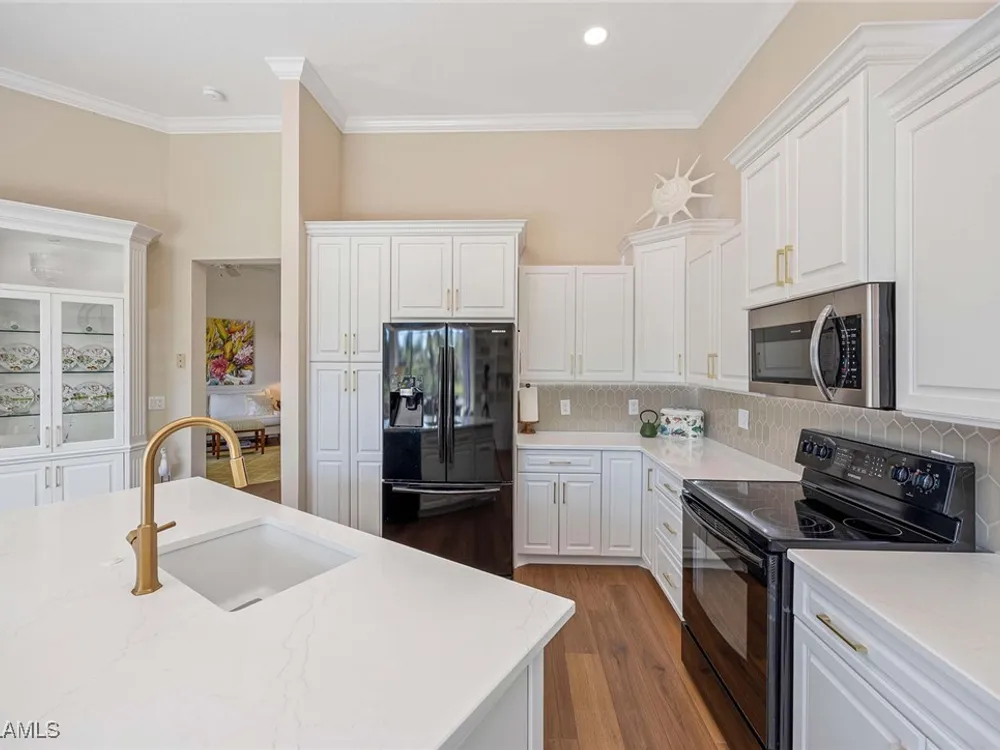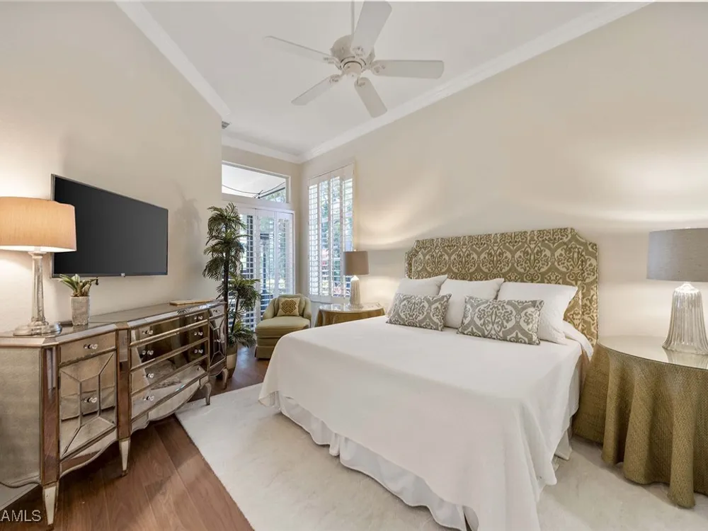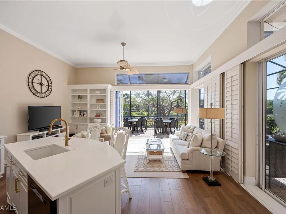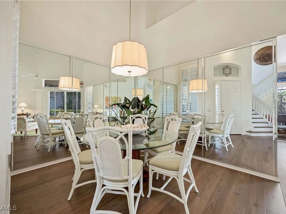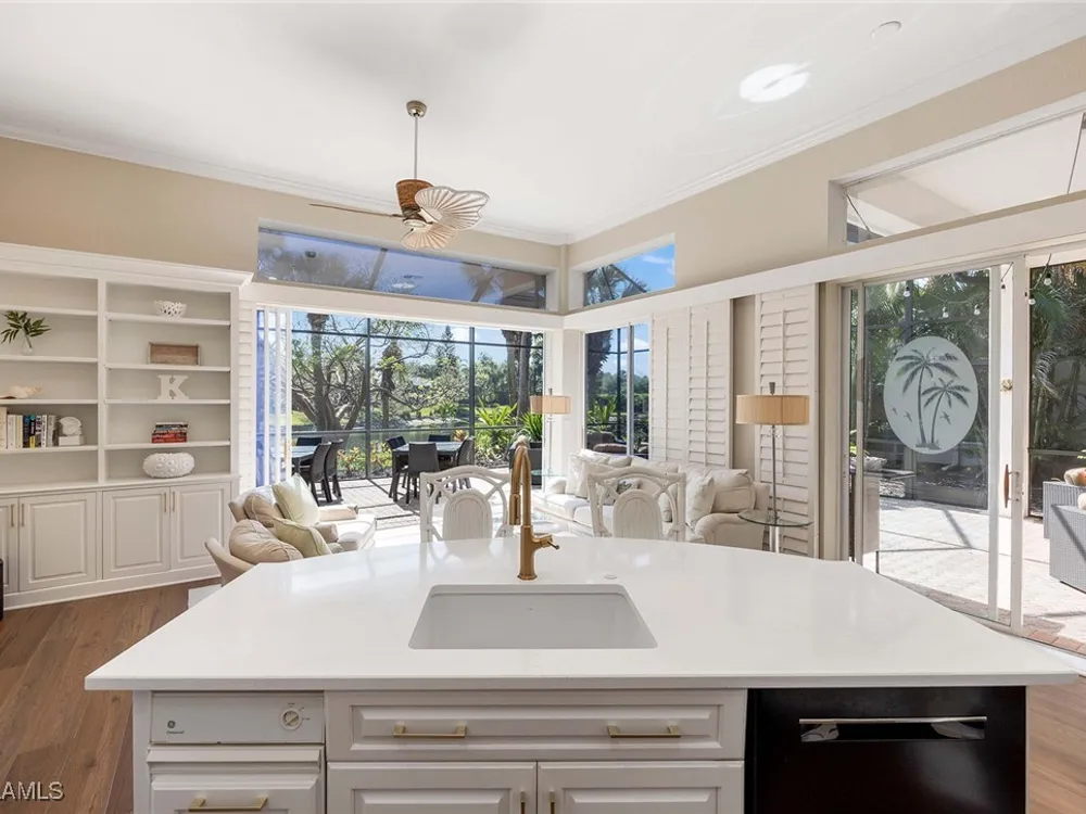 Great location in Fiddler's Creek, this charming single-family home in Pepper Tree is minutes from the main entrance as well as the world-class club, spa and fitness center. Ideally with a stunning lake view, this exceptional two-story home includes four bedrooms, three baths and the warm feeling that embraces the essence of South Florida living. The expansive combination living and dining area is roomy and open, drawing you into the open vaulted ceilings and the additional Jack and Jill guest bedrooms of the second floor. A spacious family room and an open kitchen create a bright environment that rivals only the sun-drenched patio of the back lanai. Two-story high ceilings with crown moldings enhance this newly painted, delightful home. The recently remodeled kitchen and lighting throughout are also special features. The extra-large outdoor space is fully screened with room for a full-sized pool and spa. The fourth bedroom, on the main level with a full bath, can efficiently serve as an office or den. Across the hall, the primary bedroom suite opens to the rear lanai and includes two walk-in closets. The master bath with dual sink, separate shower, and garden bath is roomy and bright. Stunning new wood flooring adds to the home's comfortable and sophisticated feel. Additional features of this exceptional home include a remodeled laundry room, central vacuum system and a 10-year transferable warranty for the air conditioner. The refinished garage floor, overhead enclosed cabinetry, extra-wide driveway and plantation shutter window treatments show attention to detail. Fiddler's Creek is an amenity-rich country club environment with a full-service spa, fitness and wellness center with pickleball, bocce ball, tennis and more. A full-time recreation director and two exceptional restaurants complete the picture of luxurious living, close to everything South Florida has to offer.