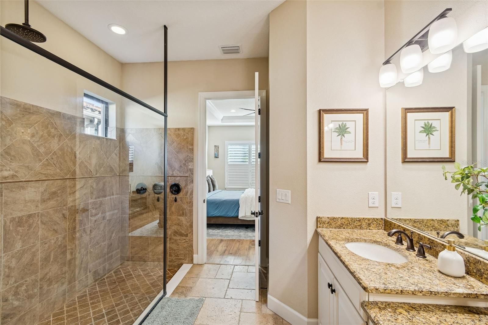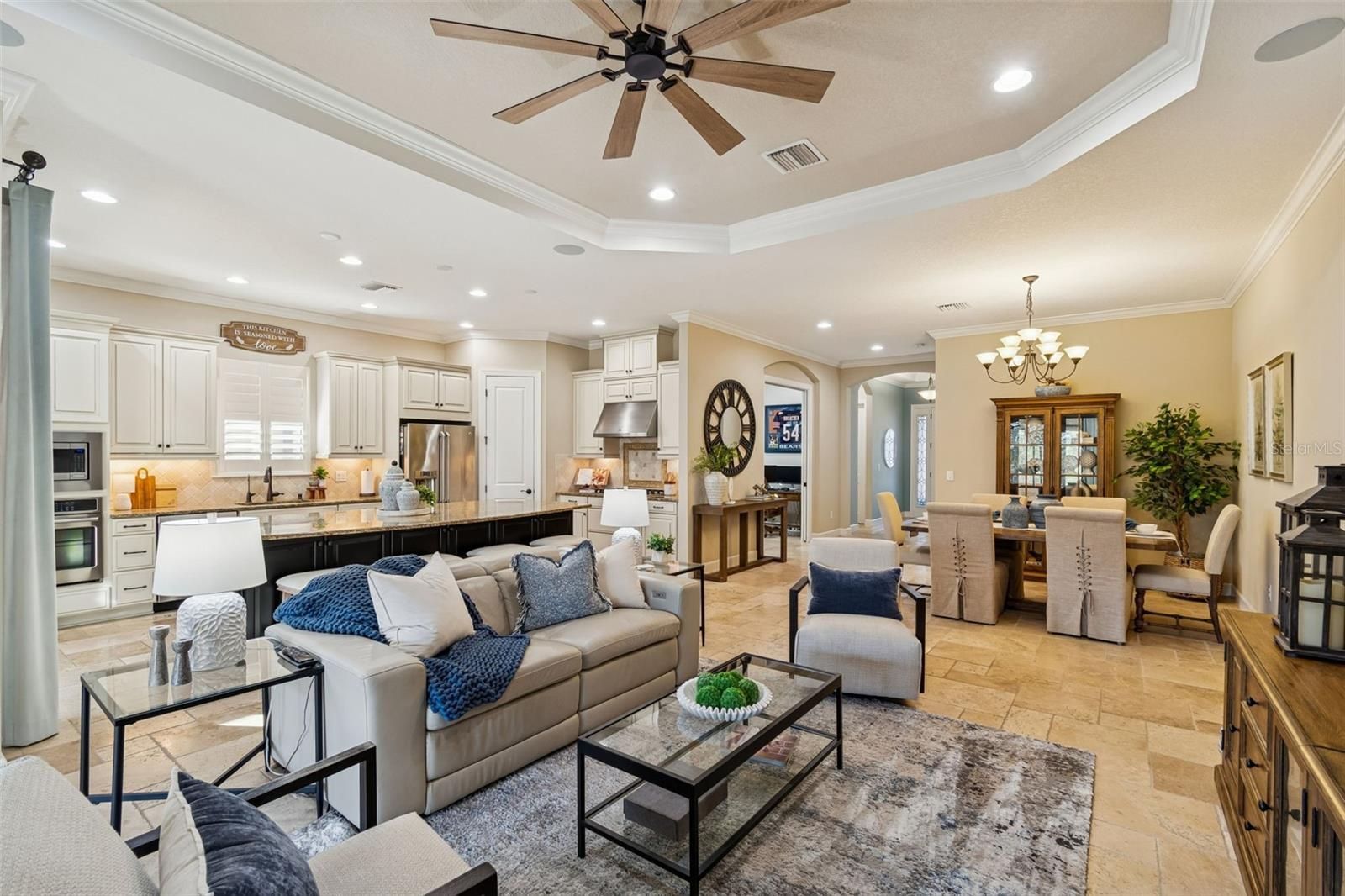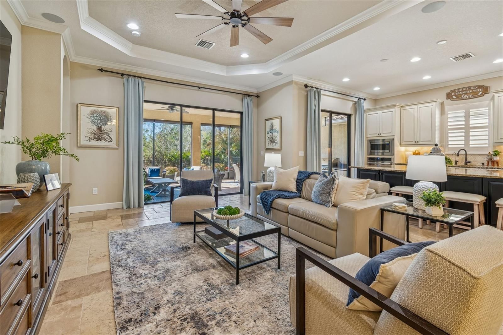 Stunning home now available in the highly sought-after, GATED, resort-style community of Esplanade of Tampa! Built by the luxury builder Taylor Morrison, this beautifully upgraded home offers timeless design, thoughtful finishes, and is perfect for Florida Living. Beautiful curb appeal with the lush, manicured landscaping and BRICK PAVER DRIVEWAY, all maintained with INCLUDED LAWN CARE. Best of all, NO CDD fee in this exceptional high-end community. The endless CONSERVATION VIEW is breathtaking. This home showcases ELEGANT TRAVERTINE FLOORING THROUGHOUT the main living areas and LAMINATE FLOORING IN THE BEDROOMS, offering a completely carpet-free interior that is both upgraded and low maintenance. TRAY CEILINGS, CROWN MOLDING THROUGHOUT, PLANTATION SHUTTERS, WATER SOFTENER, BUILT-IN SURROUND SOUND, and a bright open- concept layout elevate the space. Featuring 3 spacious bedrooms, a dedicated office/den, 3 full bathrooms, and a 2-car garage with GARAGE CEILING STORAGE RACKS provides maximum space. The elevated kitchen is designed for both function and entertaining, complete with UPGRADED 42-INCH CABINETRY (HIGHEST LEVEL OFFERED), UNDER CABINET LIGHTING, GE STAINLESS STEEL BUILT-IN WALL APPLIANCES, HOOD VENT, NATURAL GAS COOKTOP, a quiet BOSCH DISHWASHER, thick granite countertops, and a spacious center island with double sided cabinet storage, all ideal for gathering. The master suite is a true retreat with CONSERVATION VIEWS from every window, offering tray ceilings with crown molding, MASSIVE WALK-IN CLOSET WITH CUSTOM BUILT-INS, dual vanities, and a large walk-in shower. A GENEROUS LAUNDRY ROOM WITH CUSTOM CABINETRY AND A UTILITY SINK ADDS EVERYDAY CONVENIENCE. Step outside through the MASSIVE SLIDING GLASS DOORS to your EXTENDED COVERED AND SCREENED LANAI where Florida living truly shines. The FULL OUTDOOR KITCHEN features a GAS GRILL, REFRIGERATOR, STORAGE, AND BAR-HEIGHT SEATING, creating the perfect space for ENTERTAINING, DINING, OR RELAXING YEAR-ROUND. THIS ONE IS DONE RIGHT! BONUS, THE BACKYARD IS FULLY FENCED and the lanai flooring is CUSTOM BRICK LAID. This means no sand that will wash away. It’s grouted brick flooring for low maintenance! Additional features include a TANKLESS GAS WATER HEATER, HURRICANE SHUTTERS, IN-WALL PEST CONTROL SYSTEM, ENERGY-EFFICIENT CONSTRUCTION, AND A DURABLE TILE ROOF, all offering peace of mind and long-term value. Living in Esplanade of Tampa means enjoying a resort-style lifestyle with top-tier amenities including a clubhouse, fitness center, pool with cabanas, fire pit, pickleball courts, two dog parks, and an active social calendar. Ideally located near I-75 and I-275, top rated hospitals, Wiregrass Mall, Tampa Premium Outlets, dining, and entertainment. NOT age-restricted and NO CDD, making this community truly stand out! This move-in ready, meticulously maintained home offers luxury, comfort, and lifestyle. Schedule your private showing today and experience the best of Esplanade living and all this home has to offer.