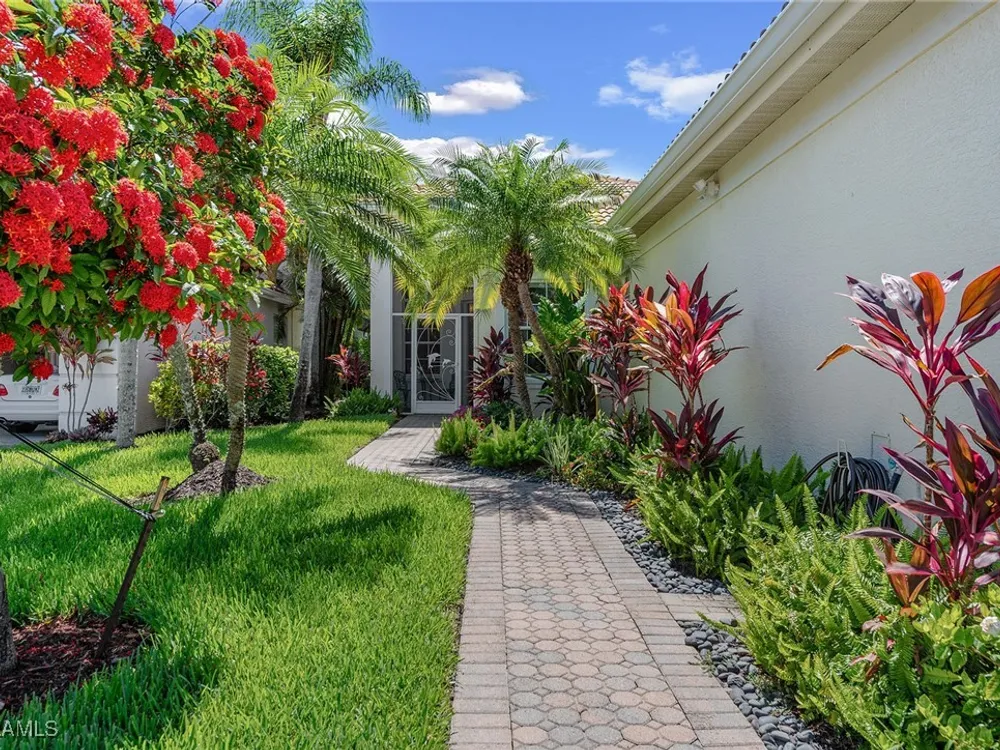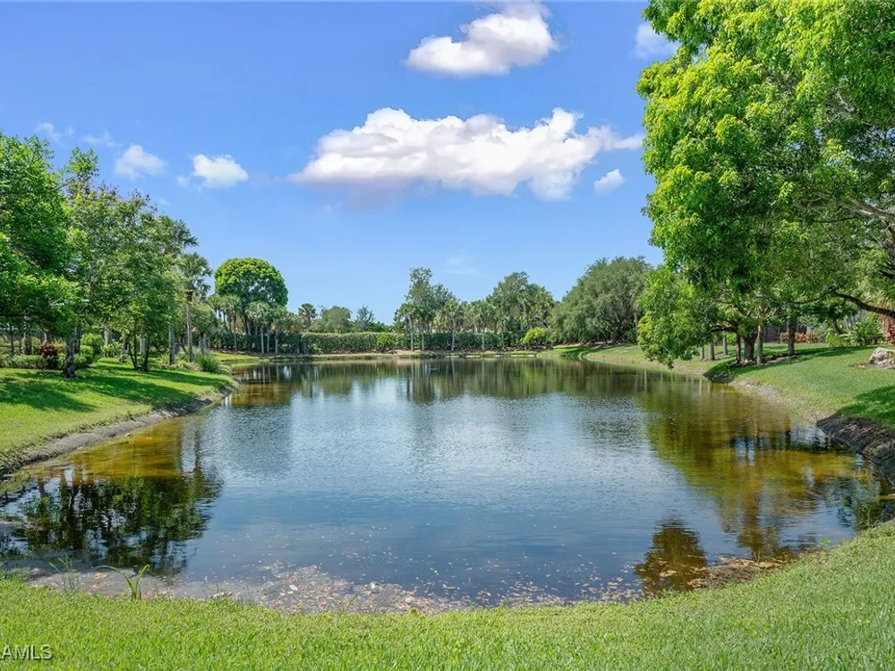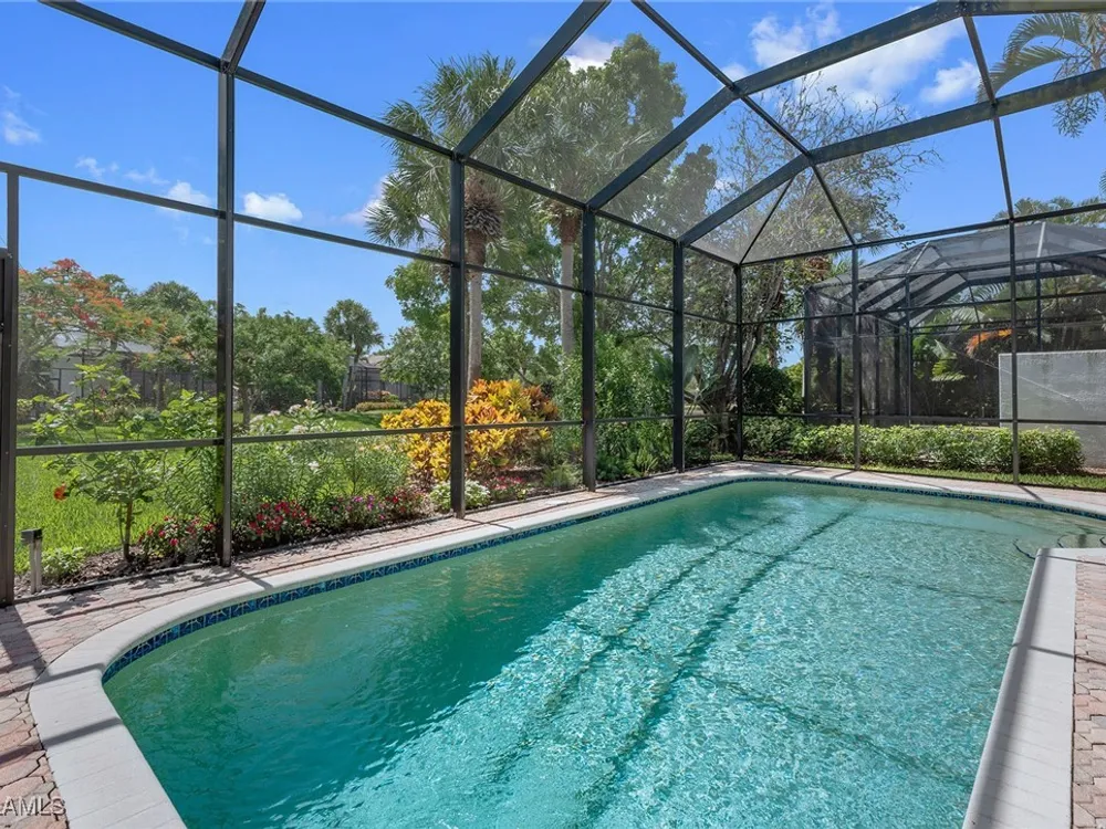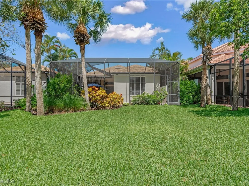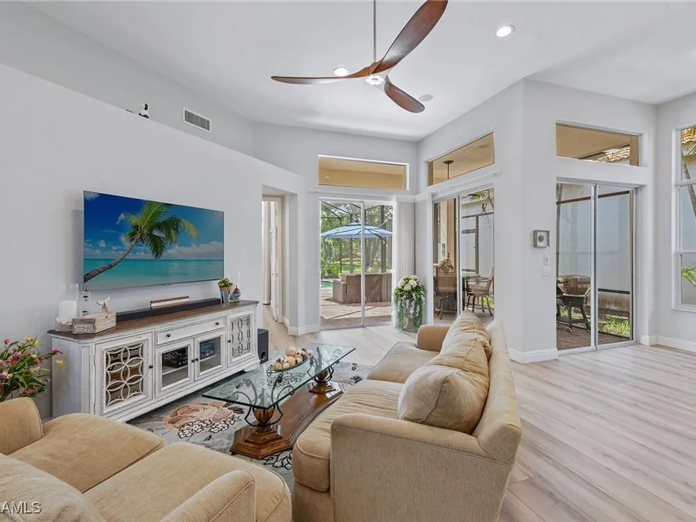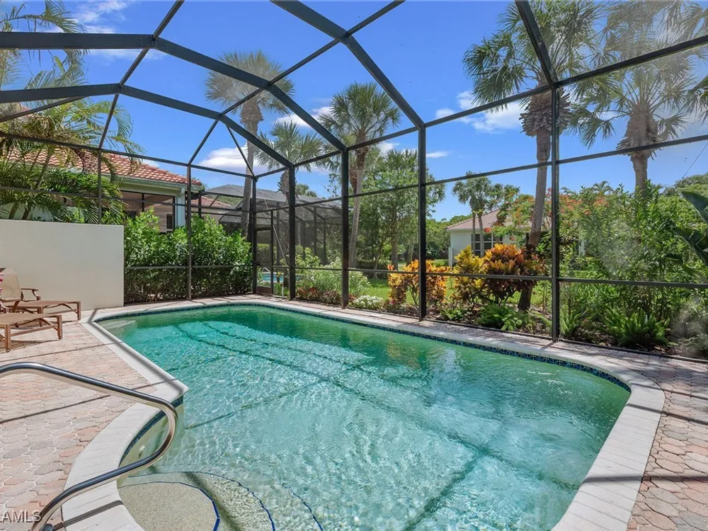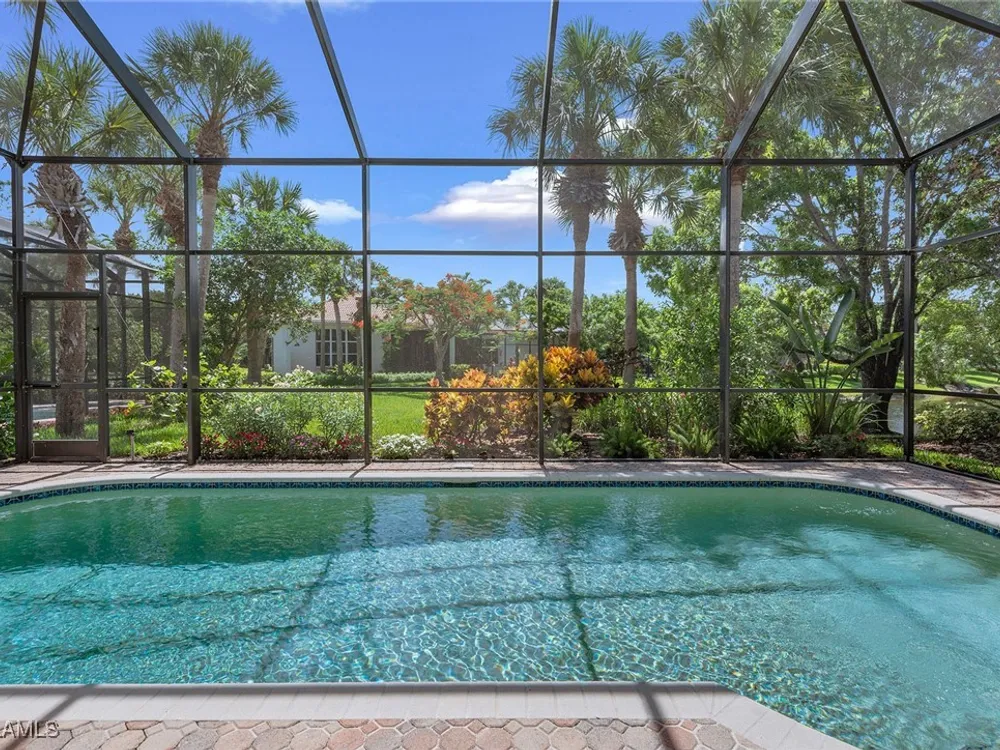 Introducing a serene retreat framed by lush tropical landscaping and tranquil lakefront views. In the vibrant and quaint Pepper Tree enclave of Fiddler’s Creek, this light-filled, two-bedroom plus den residence has been renovated and offers sunrises over the lake with eastern exposure, a split-bedroom layout, a private pool, and seamless indoor-outdoor living. With picturesque water views, the home blends natural beauty with thoughtful updates and everyday comfort. Recent improvements include a 2019 roof, 2023 HVAC system, 2022 water heater and nearly all kitchen appliances—refrigerator, dishwasher, electric range, microwave—installed within the past year. Inside, newer luxury vinyl tile flooring flows through the main living spaces, with porcelain tile in both baths. Dramatic entry with volume ceilings, crown molding, and newer LED lighting throughout enhance the sense of space, while in-ceiling speakers provide immersive sound throughout the home. The updated kitchen is designed for beauty and function, featuring white Shaker-style cabinetry, quartz countertops with a waterfall peninsula, a tile backsplash, recessed lighting and LED under-cabinet lighting. Stainless appliances include an electric range with hood, French-door refrigerator with icemaker, under-counter microwave, and dishwasher. A breakfast bar opens to the living area, and the adjacent dining space offers tranquil garden views. The lanai, finished with brick paver flooring, offers a peaceful setting for entertaining or relaxing by the pool, surrounded by tropical foliage and a serene lake backdrop. The primary suite features large windows with lake views, a transom window above the sliding glass door, a walk-in closet and a spa-style en-suite bath with dual quartz vanities, a full-width mirror, a frameless glass walk-in shower, and a separate soaking tub. The guest bedroom is near a full bath with walk-in shower, while the den with French doors offers flexibility as a home office or third bedroom. The living room is filled with natural light from a transom window above the front entry door, complementing the home’s bright and welcoming ambiance. A well-appointed laundry room includes a GE washer and dryer, utility sink and overhead storage. The two-car garage features epoxy flooring and a Culligan water softener system. Residents of Fiddler’s Creek enjoy access to the 24,000-square-foot Club & Spa with fine and casual dining, a full fitness center with personal training and classes, resort pools with waterfalls and slides, a spa, sauna, steam room, tennis, pickleball, bocce and a year-round calendar of social events. Club renovations are underway in 2025. Optional memberships are available at The Tarpon Club for beach and marina privileges as well as The Golf Club with its acclaimed renovated course and new clubhouse. Close to Marco Island and downtown Naples, this home offers a refined coastal lifestyle in a premier gated community.