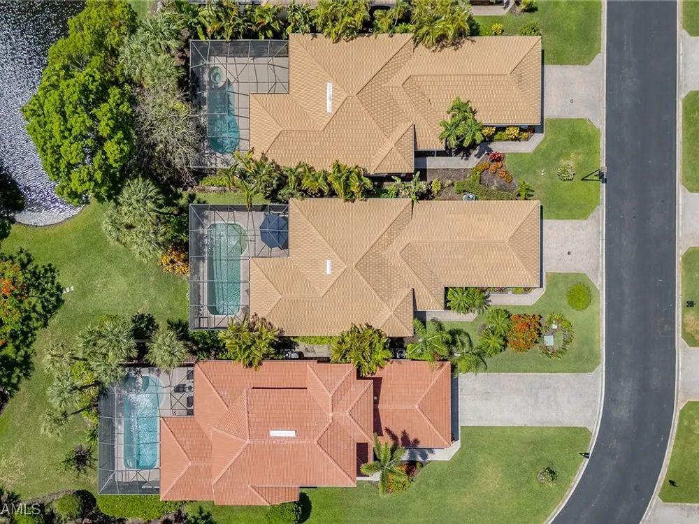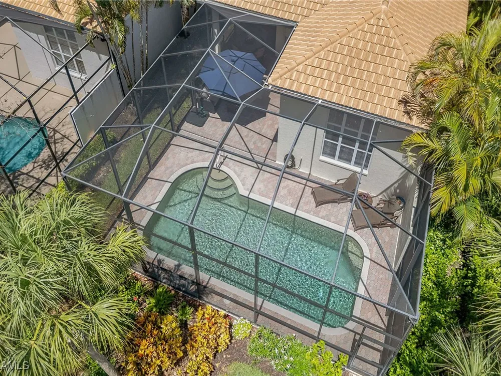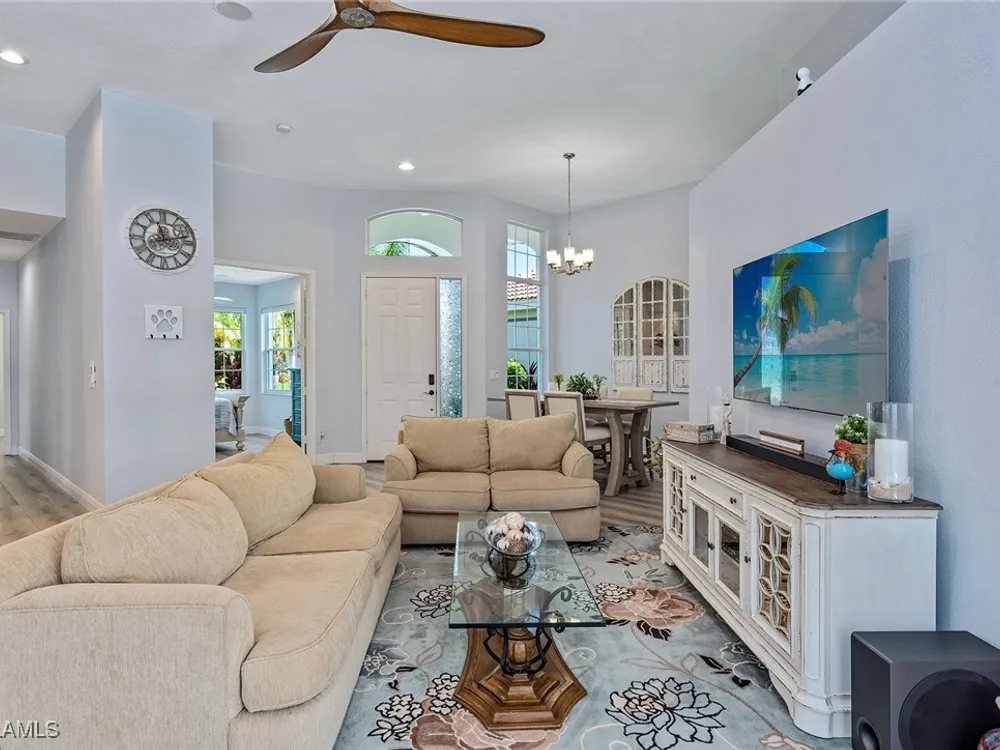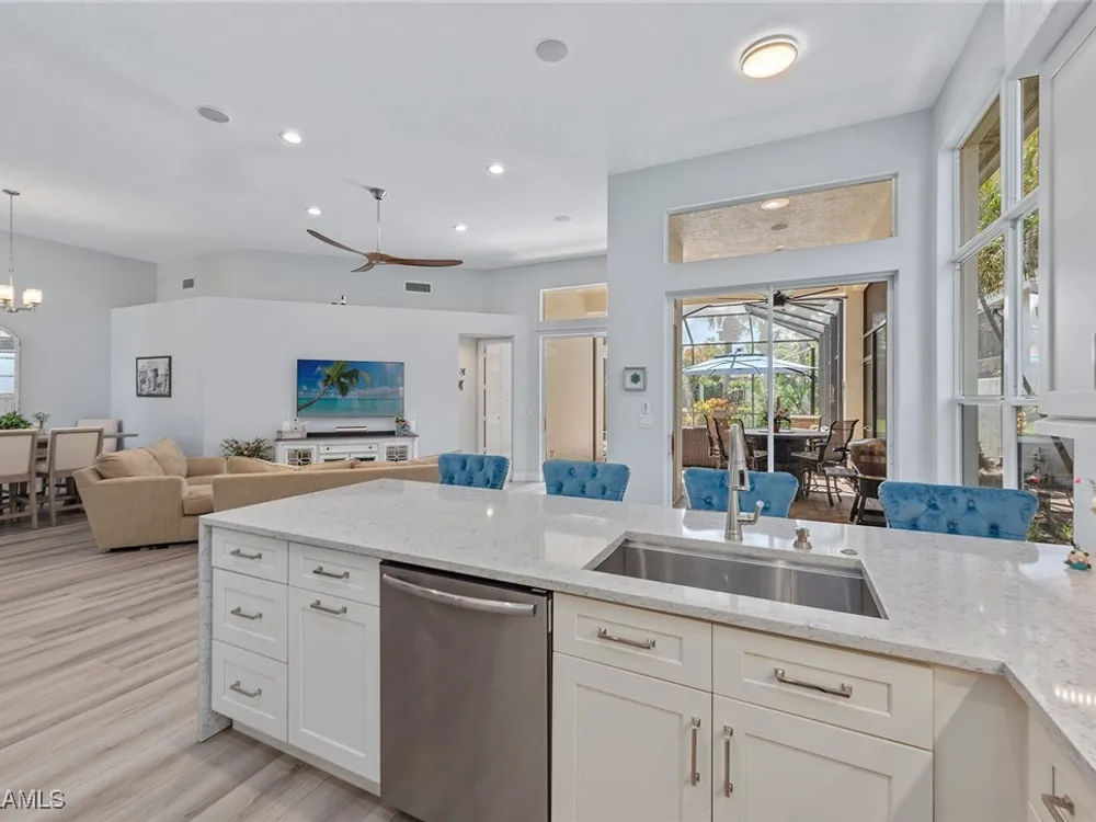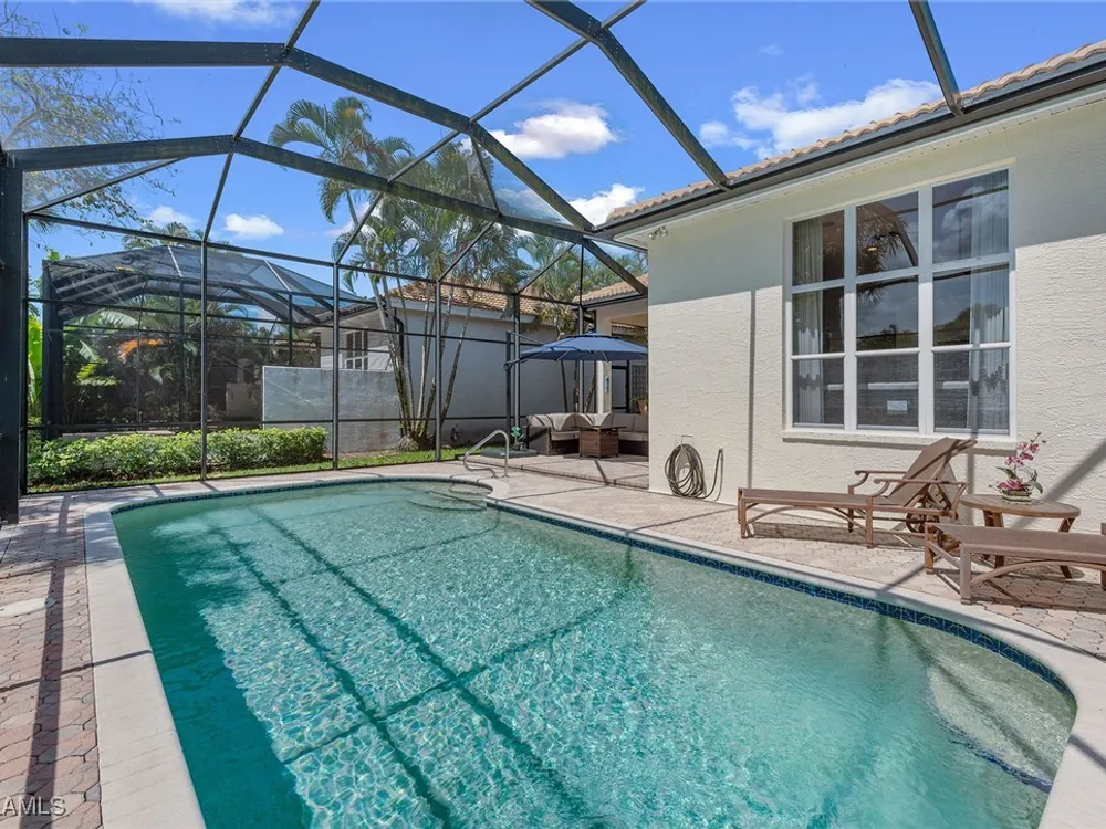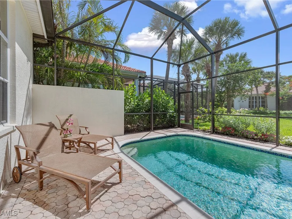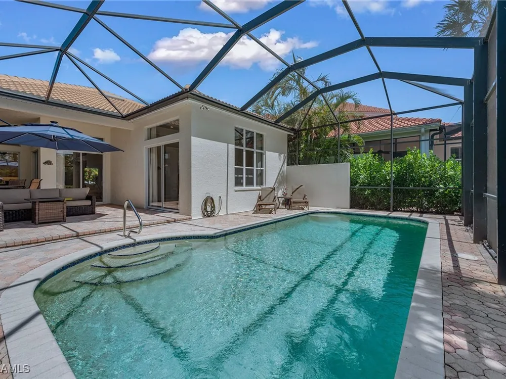 Introducing a serene retreat framed by lush tropical landscaping and tranquil lakefront views. In the vibrant and quaint Pepper Tree enclave of Fiddler’s Creek, this light-filled, two-bedroom plus den residence has been renovated and offers sunrises over the lake with eastern exposure, a split-bedroom layout, a private pool, and seamless indoor-outdoor living. With picturesque water views, the home blends natural beauty with thoughtful updates and everyday comfort. Recent improvements include a 2019 roof, 2023 HVAC system, 2022 water heater and nearly all kitchen appliances—refrigerator, dishwasher, electric range, microwave—installed within the past year. Inside, newer luxury vinyl tile flooring flows through the main living spaces, with porcelain tile in both baths. Dramatic entry with volume ceilings, crown molding, and newer LED lighting throughout enhance the sense of space, while in-ceiling speakers provide immersive sound throughout the home. The updated kitchen is designed for beauty and function, featuring white Shaker-style cabinetry, quartz countertops with a waterfall peninsula, a tile backsplash, recessed lighting and LED under-cabinet lighting. Stainless appliances include an electric range with hood, French-door refrigerator with icemaker, under-counter microwave, and dishwasher. A breakfast bar opens to the living area, and the adjacent dining space offers tranquil garden views. The lanai, finished with brick paver flooring, offers a peaceful setting for entertaining or relaxing by the pool, surrounded by tropical foliage and a serene lake backdrop. The primary suite features large windows with lake views, a transom window above the sliding glass door, a walk-in closet and a spa-style en-suite bath with dual quartz vanities, a full-width mirror, a frameless glass walk-in shower, and a separate soaking tub. The guest bedroom is near a full bath with walk-in shower, while the den with French doors offers flexibility as a home office or third bedroom. The living room is filled with natural light from a transom window above the front entry door, complementing the home’s bright and welcoming ambiance. A well-appointed laundry room includes a GE washer and dryer, utility sink and overhead storage. The two-car garage features epoxy flooring and a Culligan water softener system. Residents of Fiddler’s Creek enjoy access to the 24,000-square-foot Club & Spa with fine and casual dining, a full fitness center with personal training and classes, resort pools with waterfalls and slides, a spa, sauna, steam room, tennis, pickleball, bocce and a year-round calendar of social events. Club renovations are underway in 2025. Optional memberships are available at The Tarpon Club for beach and marina privileges as well as The Golf Club with its acclaimed renovated course and new clubhouse. Close to Marco Island and downtown Naples, this home offers a refined coastal lifestyle in a premier gated community.