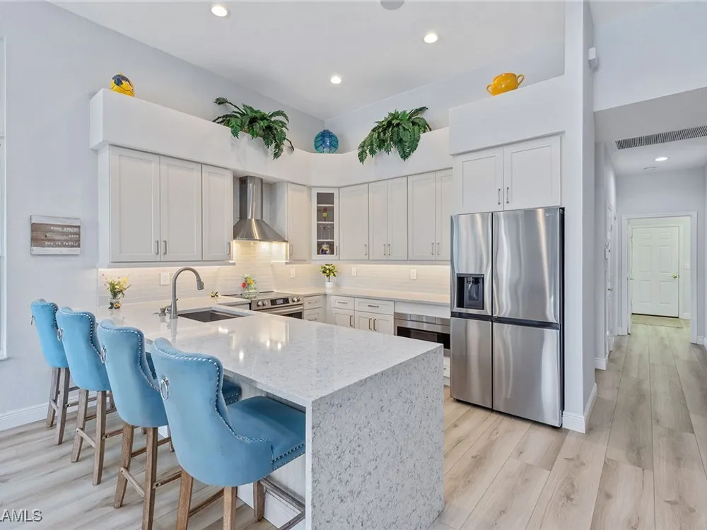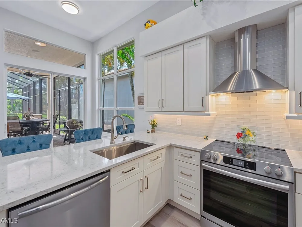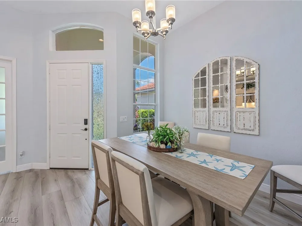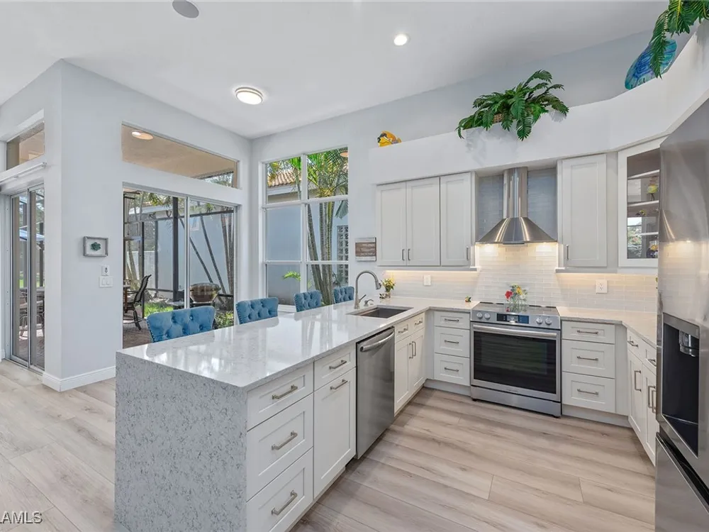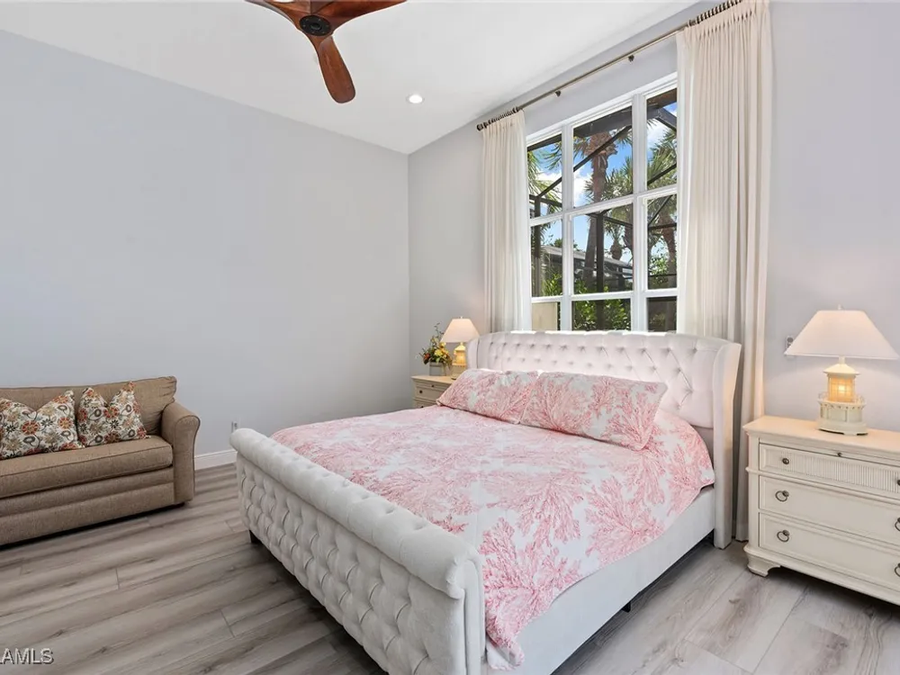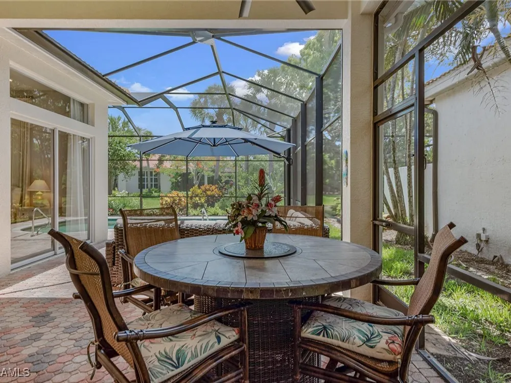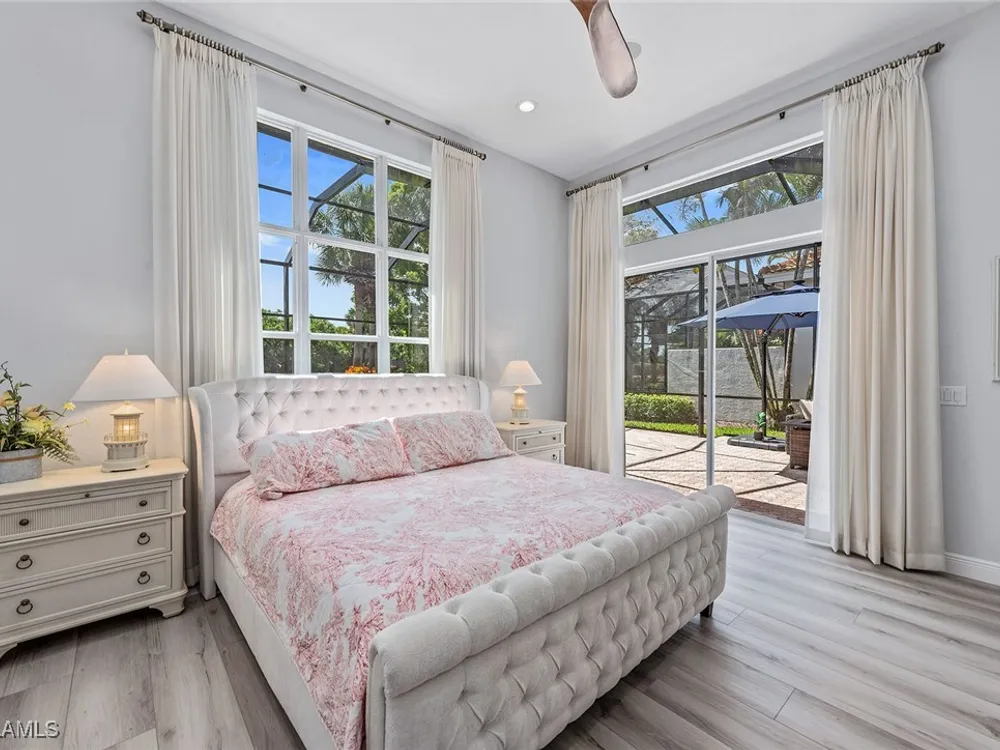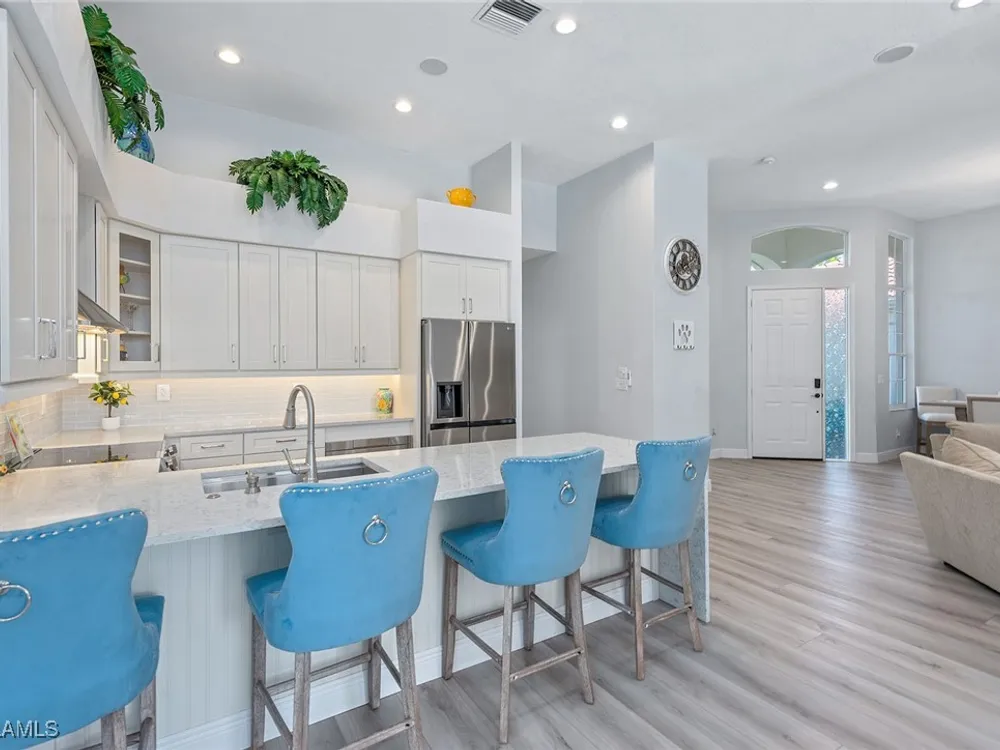 Introducing a serene retreat framed by lush tropical landscaping and tranquil lakefront views. In the vibrant and quaint Pepper Tree enclave of Fiddler’s Creek, this light-filled, two-bedroom plus den residence has been renovated and offers sunrises over the lake with eastern exposure, a split-bedroom layout, a private pool, and seamless indoor-outdoor living. With picturesque water views, the home blends natural beauty with thoughtful updates and everyday comfort. Recent improvements include a 2019 roof, 2023 HVAC system, 2022 water heater and nearly all kitchen appliances—refrigerator, dishwasher, electric range, microwave—installed within the past year. Inside, newer luxury vinyl tile flooring flows through the main living spaces, with porcelain tile in both baths. Dramatic entry with volume ceilings, crown molding, and newer LED lighting throughout enhance the sense of space, while in-ceiling speakers provide immersive sound throughout the home. The updated kitchen is designed for beauty and function, featuring white Shaker-style cabinetry, quartz countertops with a waterfall peninsula, a tile backsplash, recessed lighting and LED under-cabinet lighting. Stainless appliances include an electric range with hood, French-door refrigerator with icemaker, under-counter microwave, and dishwasher. A breakfast bar opens to the living area, and the adjacent dining space offers tranquil garden views. The lanai, finished with brick paver flooring, offers a peaceful setting for entertaining or relaxing by the pool, surrounded by tropical foliage and a serene lake backdrop. The primary suite features large windows with lake views, a transom window above the sliding glass door, a walk-in closet and a spa-style en-suite bath with dual quartz vanities, a full-width mirror, a frameless glass walk-in shower, and a separate soaking tub. The guest bedroom is near a full bath with walk-in shower, while the den with French doors offers flexibility as a home office or third bedroom. The living room is filled with natural light from a transom window above the front entry door, complementing the home’s bright and welcoming ambiance. A well-appointed laundry room includes a GE washer and dryer, utility sink and overhead storage. The two-car garage features epoxy flooring and a Culligan water softener system. Residents of Fiddler’s Creek enjoy access to the 24,000-square-foot Club & Spa with fine and casual dining, a full fitness center with personal training and classes, resort pools with waterfalls and slides, a spa, sauna, steam room, tennis, pickleball, bocce and a year-round calendar of social events. Club renovations are underway in 2025. Optional memberships are available at The Tarpon Club for beach and marina privileges as well as The Golf Club with its acclaimed renovated course and new clubhouse. Close to Marco Island and downtown Naples, this home offers a refined coastal lifestyle in a premier gated community.