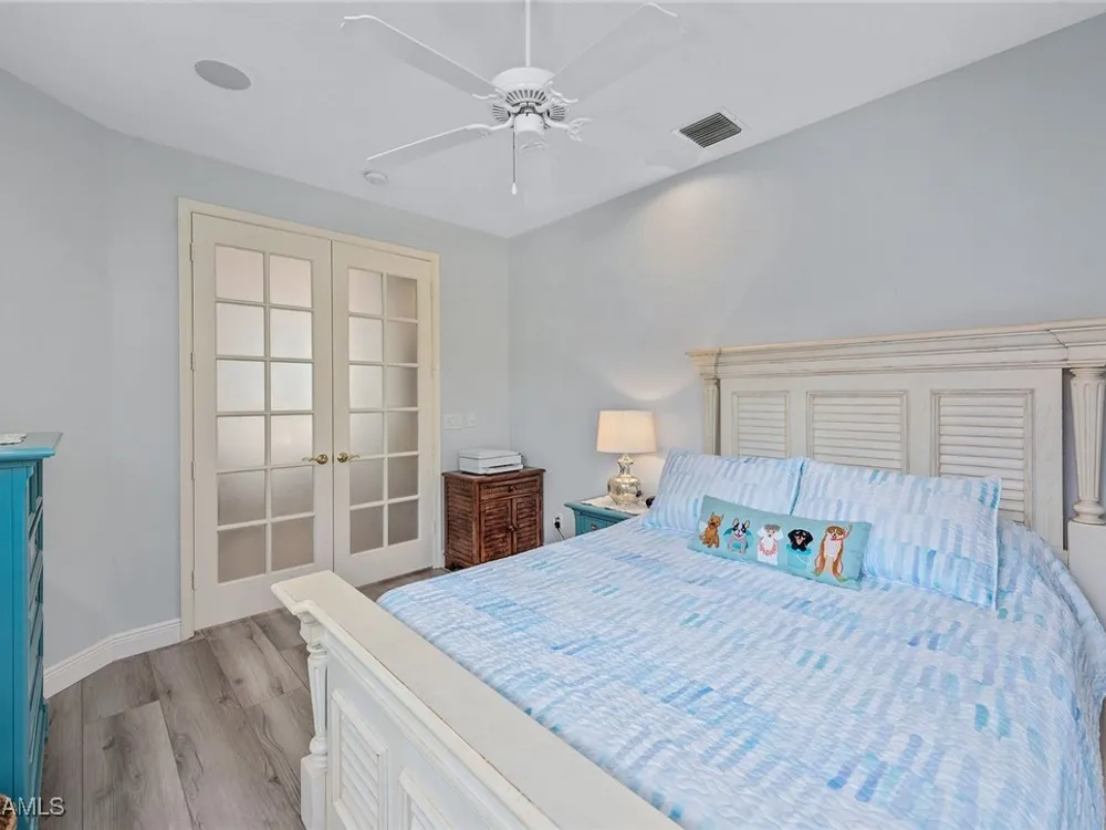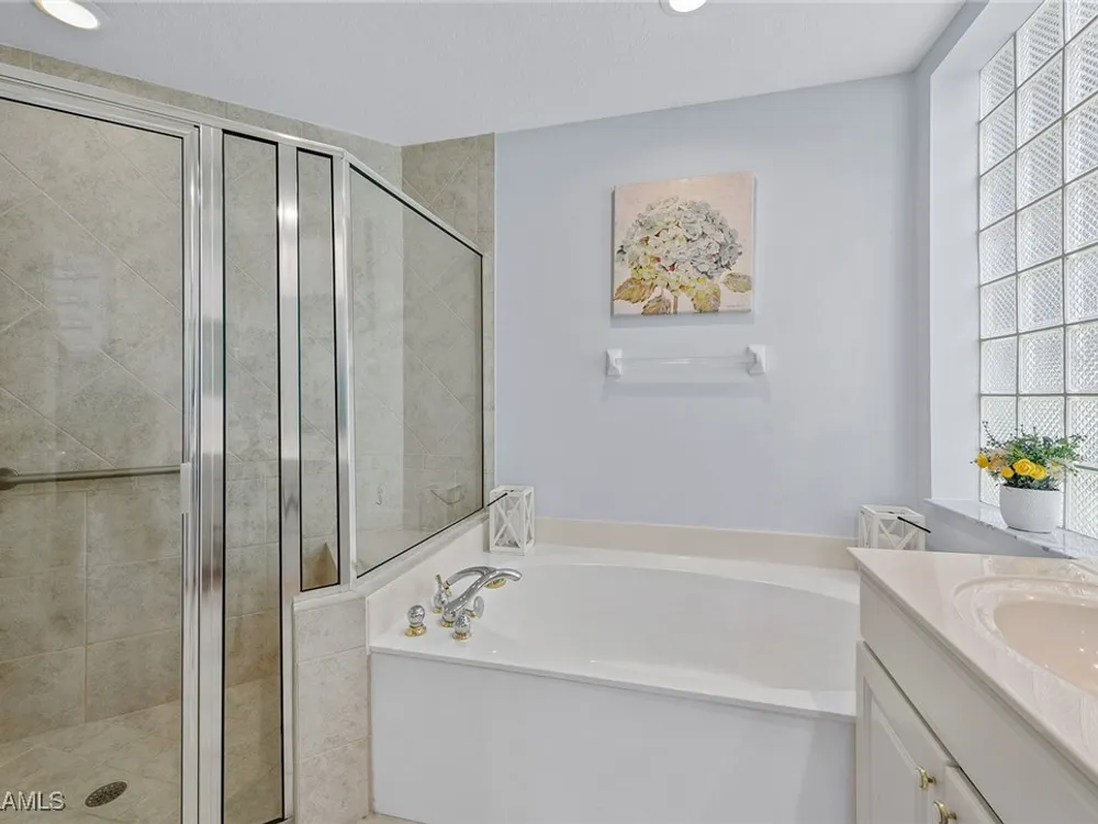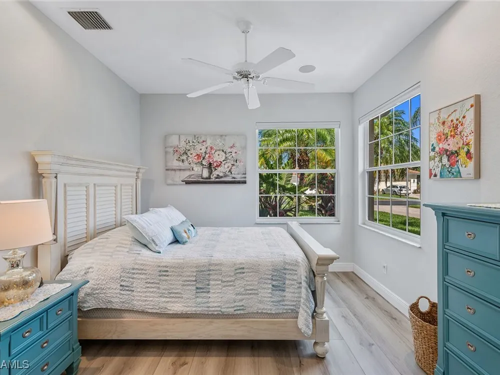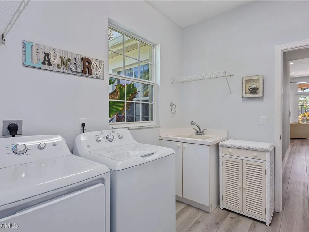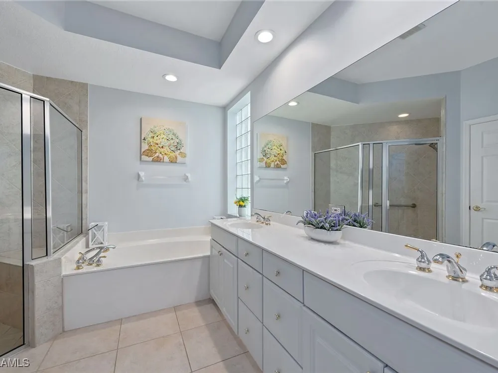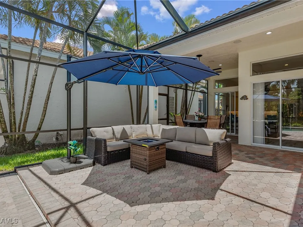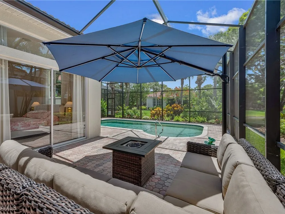 Introducing a serene retreat framed by lush tropical landscaping and tranquil lakefront views. In the vibrant and quaint Pepper Tree enclave of Fiddler’s Creek, this light-filled, two-bedroom plus den residence has been renovated and offers sunrises over the lake with eastern exposure, a split-bedroom layout, a private pool, and seamless indoor-outdoor living. With picturesque water views, the home blends natural beauty with thoughtful updates and everyday comfort. Recent improvements include a 2019 roof, 2023 HVAC system, 2022 water heater and nearly all kitchen appliances—refrigerator, dishwasher, electric range, microwave—installed within the past year. Inside, newer luxury vinyl tile flooring flows through the main living spaces, with porcelain tile in both baths. Dramatic entry with volume ceilings, crown molding, and newer LED lighting throughout enhance the sense of space, while in-ceiling speakers provide immersive sound throughout the home. The updated kitchen is designed for beauty and function, featuring white Shaker-style cabinetry, quartz countertops with a waterfall peninsula, a tile backsplash, recessed lighting and LED under-cabinet lighting. Stainless appliances include an electric range with hood, French-door refrigerator with icemaker, under-counter microwave, and dishwasher. A breakfast bar opens to the living area, and the adjacent dining space offers tranquil garden views. The lanai, finished with brick paver flooring, offers a peaceful setting for entertaining or relaxing by the pool, surrounded by tropical foliage and a serene lake backdrop. The primary suite features large windows with lake views, a transom window above the sliding glass door, a walk-in closet and a spa-style en-suite bath with dual quartz vanities, a full-width mirror, a frameless glass walk-in shower, and a separate soaking tub. The guest bedroom is near a full bath with walk-in shower, while the den with French doors offers flexibility as a home office or third bedroom. The living room is filled with natural light from a transom window above the front entry door, complementing the home’s bright and welcoming ambiance. A well-appointed laundry room includes a GE washer and dryer, utility sink and overhead storage. The two-car garage features epoxy flooring and a Culligan water softener system. Residents of Fiddler’s Creek enjoy access to the 24,000-square-foot Club & Spa with fine and casual dining, a full fitness center with personal training and classes, resort pools with waterfalls and slides, a spa, sauna, steam room, tennis, pickleball, bocce and a year-round calendar of social events. Club renovations are underway in 2025. Optional memberships are available at The Tarpon Club for beach and marina privileges as well as The Golf Club with its acclaimed renovated course and new clubhouse. Close to Marco Island and downtown Naples, this home offers a refined coastal lifestyle in a premier gated community.