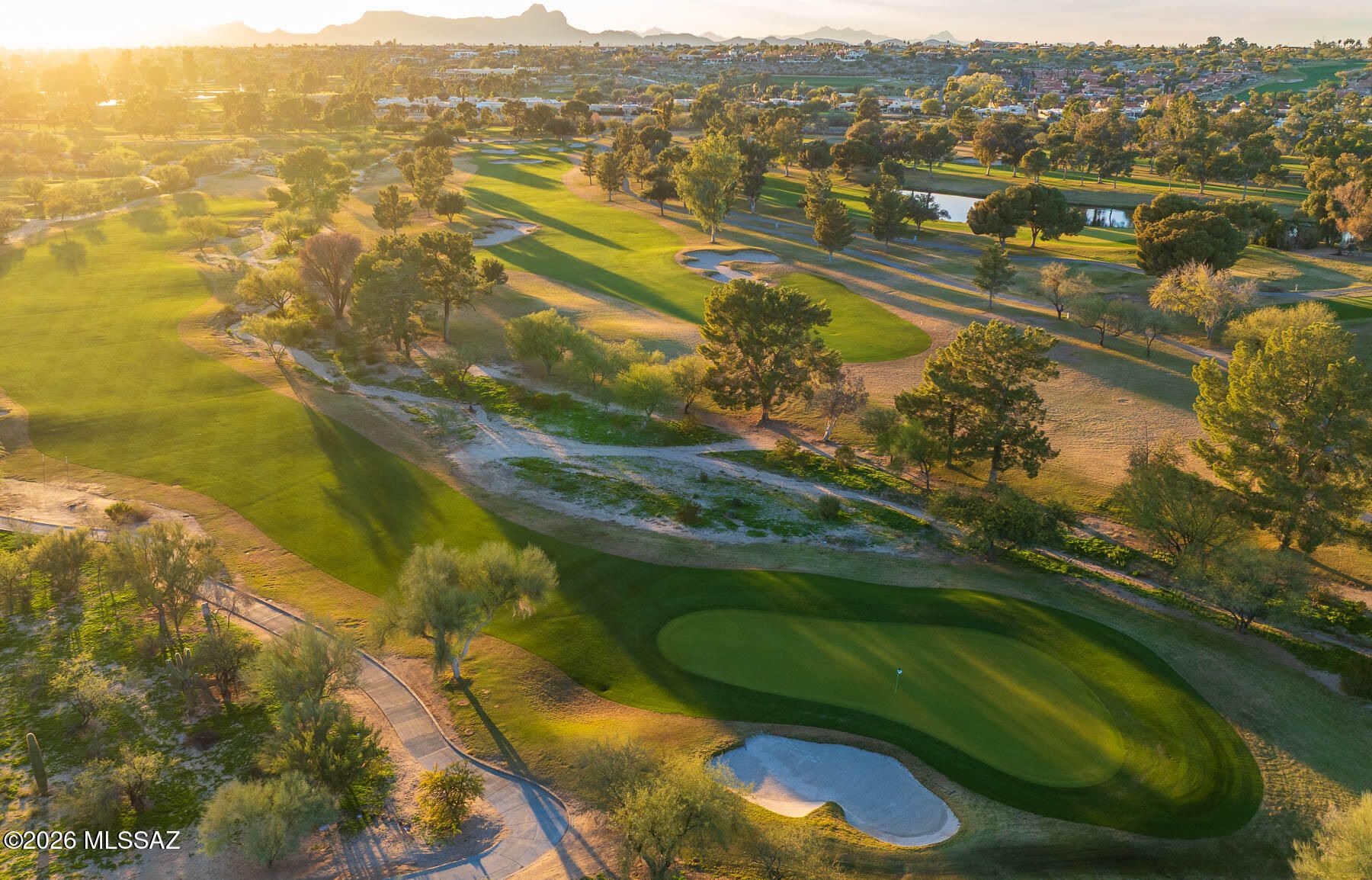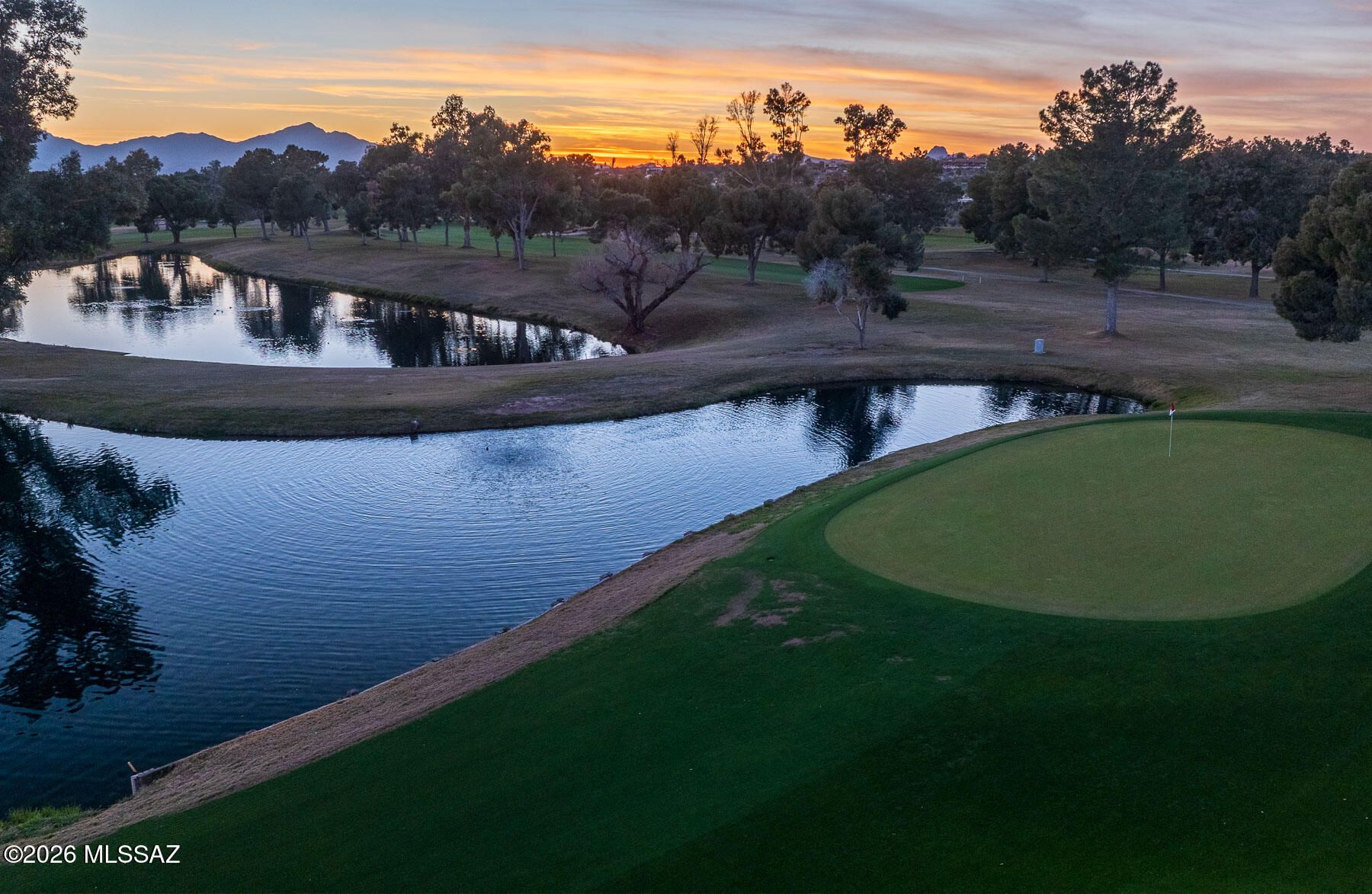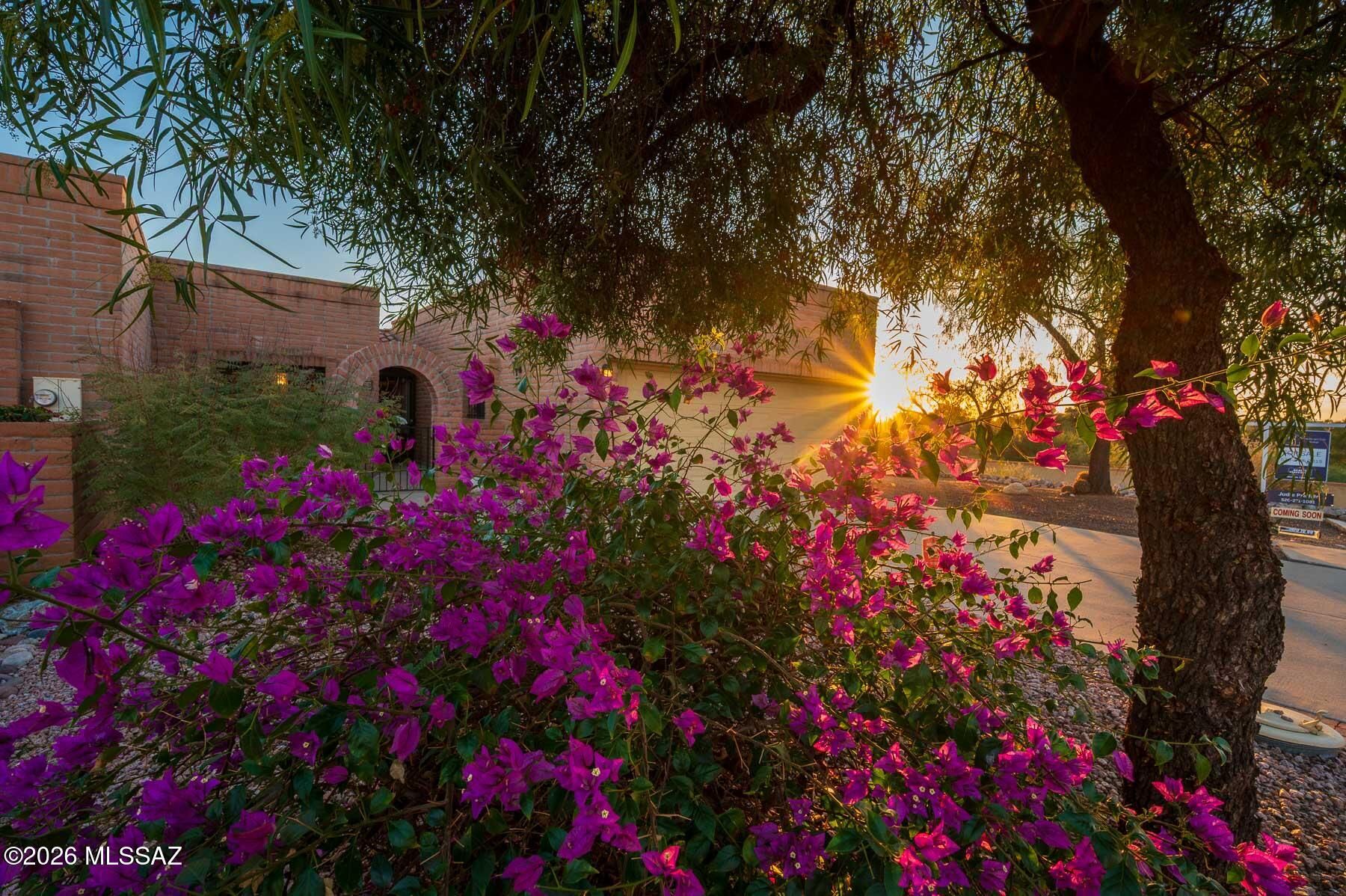 You are invited to this Lovely location high up on a Hill. It captures spectacular mountain vista views, the green golf course across the street and Primo sunsets. You may want to park a chair either on the back patio or side yard to partake in the common Tucsonan past time of weather tracking, be it our famous storms or night sky's. The slump block architectural detail to this age restricted Town-Home community is unknown but was inspired by a visionary and built by Fairfield Homes (see posted history.) This 2 BR home has ''just enough'' space to every room, the kitchen features a unique slab counter top and cherry cabinets, the primary bedroom offers a walk in closet with sliding door access that offers views. Living here is a lifestyle. It boasts luxury with a casual ease of living