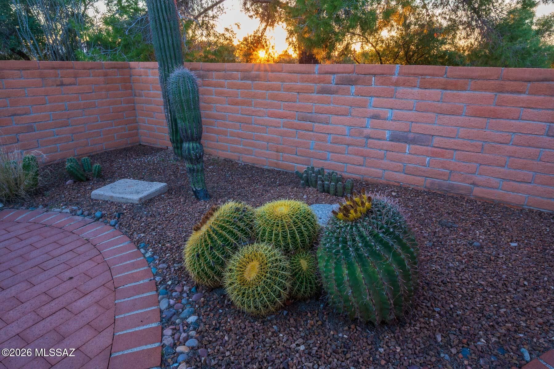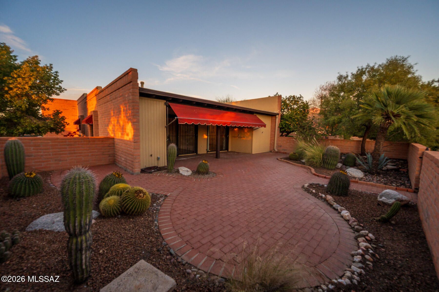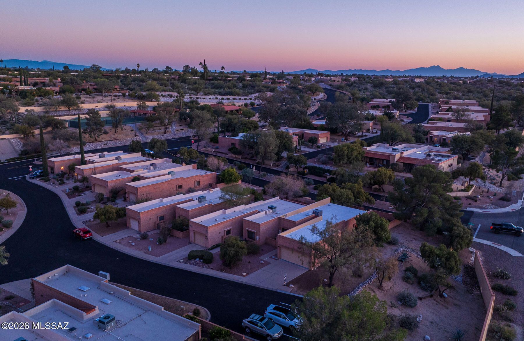 You are invited to this Lovely location high up on a Hill. It captures spectacular mountain vista views, the green golf course across the street and Primo sunsets. You may want to park a chair either on the back patio or side yard to partake in the common Tucsonan past time of weather tracking, be it our famous storms or night sky's. The slump block architectural detail to this age restricted Town-Home community is unknown but was inspired by a visionary and built by Fairfield Homes (see posted history.) This 2 BR home has ''just enough'' space to every room, the kitchen features a unique slab counter top and cherry cabinets, the primary bedroom offers a walk in closet with sliding door access that offers views. Living here is a lifestyle. It boasts luxury with a casual ease of living