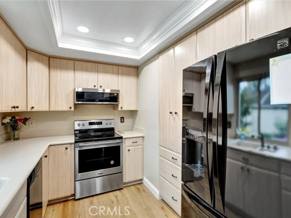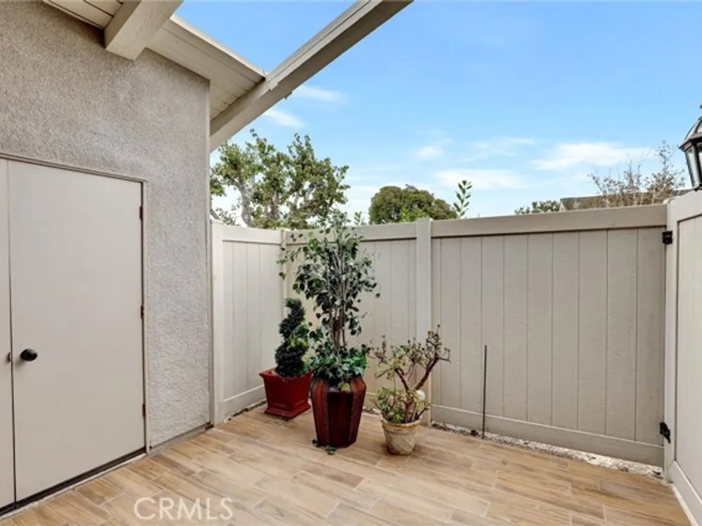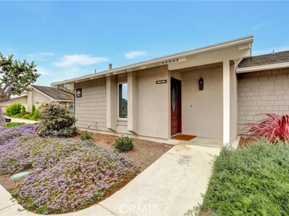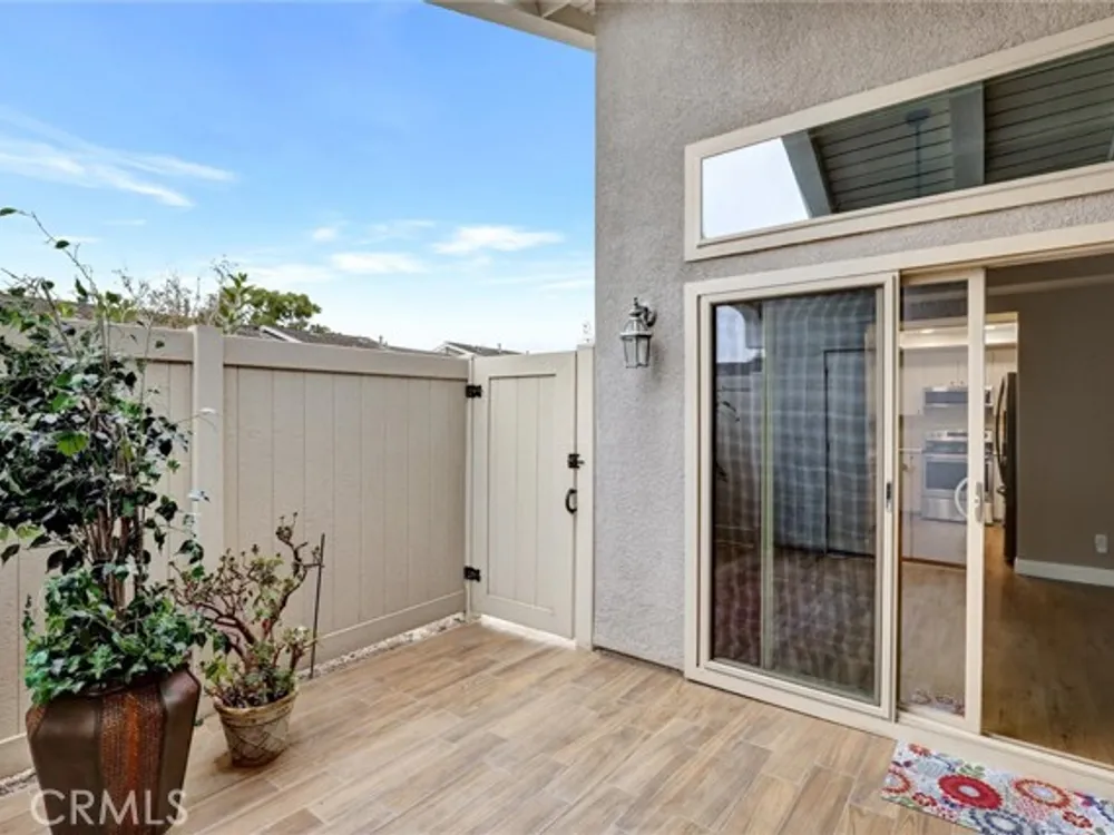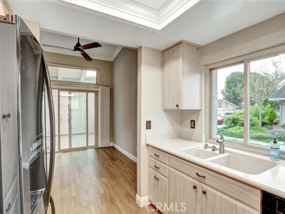 Welcome to the Iconic Landmark-- a surf city gem. Ocean breezes keep the weather temperate year round. Sustainable lush landscaping throughout Landmark. Just minutes to the beach in coveted Huntington Beach. This friendly 55 and up community has all the amenities. Two Community Pools, Clubhouses, Guarded Security Gate, Tennis/Pickleball courts, Events, Concerts, Clubs, Billiard Room, Putting Green, Fitness Center, and activities galore. Enjoy the expansive green space easy to walk or bike in this enchanting Community. This gem boasts a beautiful 2 Bedroom and 2 full baths corner unit condominium with high ceilings and a skylight in the main bathroom, ensuite in the Primary Bedroom, and updated laminate flooring. Two double closets in the Primary and one double in the 2nd bedroom plus 2 hall closets allow for lots of storage. Ceiling fans in dining and bedrooms. Kitchen though not large, has a soothing design, great layout and functionality for any cook. Features in the kitchen include a built in microwave, pull out dedicated spice storage, beautiful over the sink window, and a corner cabinet with rounders for pots and pans. Two sets of sliding glass doors open to a patio with high walls for privacy and there you will find access to the enclosed washer and dryer with more storage.