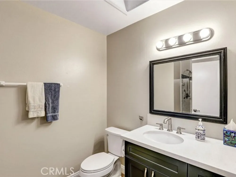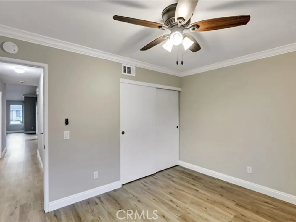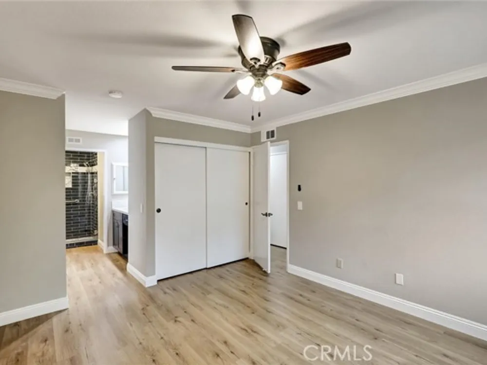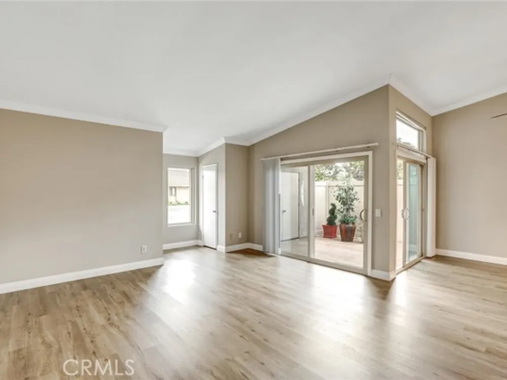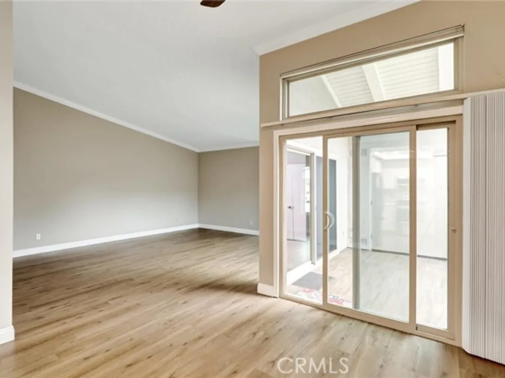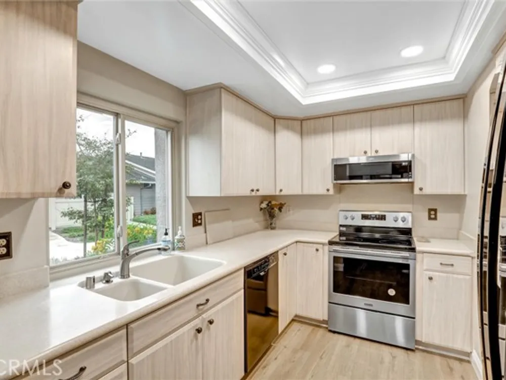 Welcome to the Iconic Landmark-- a surf city gem. Ocean breezes keep the weather temperate year round. Sustainable lush landscaping throughout Landmark. Just minutes to the beach in coveted Huntington Beach. This friendly 55 and up community has all the amenities. Two Community Pools, Clubhouses, Guarded Security Gate, Tennis/Pickleball courts, Events, Concerts, Clubs, Billiard Room, Putting Green, Fitness Center, and activities galore. Enjoy the expansive green space easy to walk or bike in this enchanting Community. This gem boasts a beautiful 2 Bedroom and 2 full baths corner unit condominium with high ceilings and a skylight in the main bathroom, ensuite in the Primary Bedroom, and updated laminate flooring. Two double closets in the Primary and one double in the 2nd bedroom plus 2 hall closets allow for lots of storage. Ceiling fans in dining and bedrooms. Kitchen though not large, has a soothing design, great layout and functionality for any cook. Features in the kitchen include a built in microwave, pull out dedicated spice storage, beautiful over the sink window, and a corner cabinet with rounders for pots and pans. Two sets of sliding glass doors open to a patio with high walls for privacy and there you will find access to the enclosed washer and dryer with more storage.