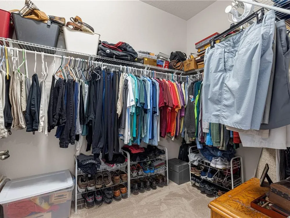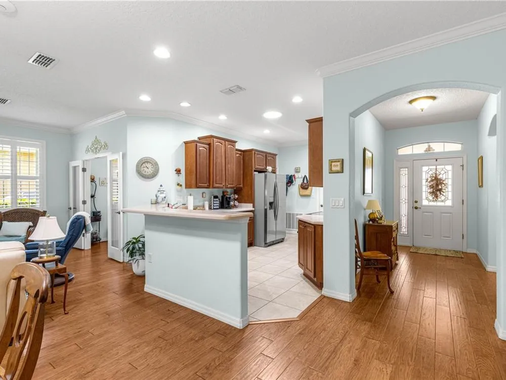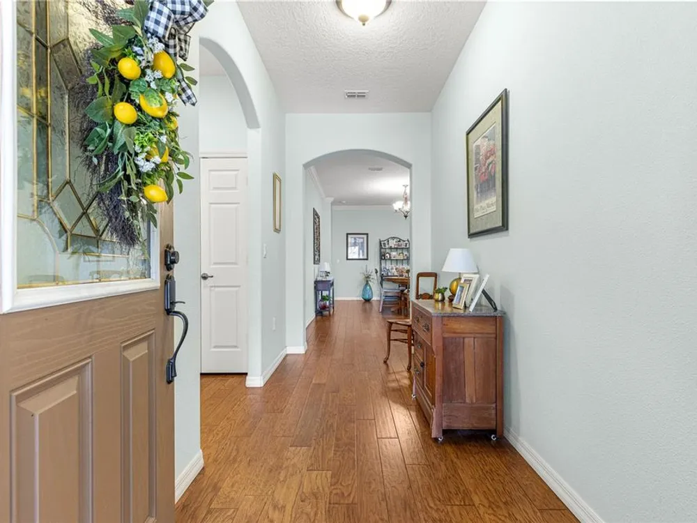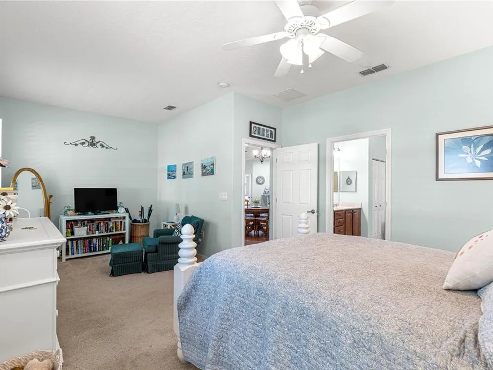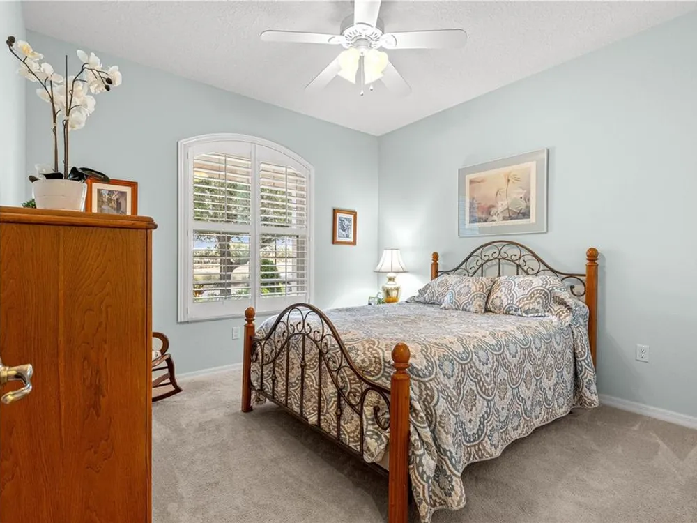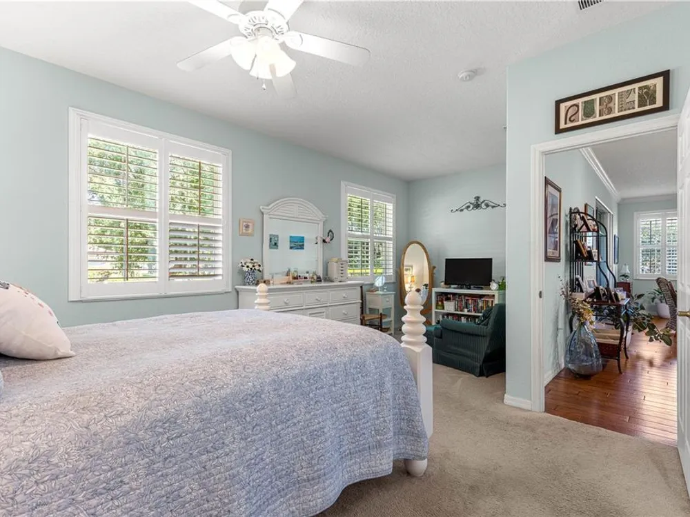 - Ceiling Fan(s), Crown Molding, Eat-in Kitchen, High Ceilings, Open Floorplan, Main Level Primary, Solid Surface Counters, Thermostat, Walk-In Closet(s), Window Treatments