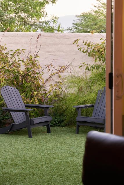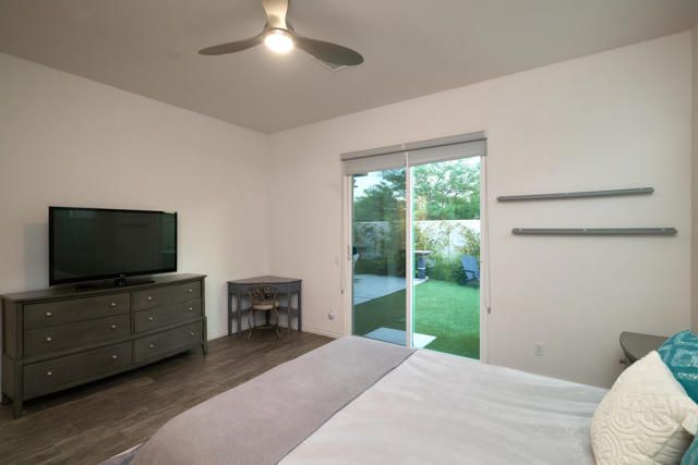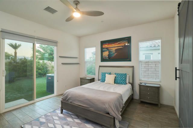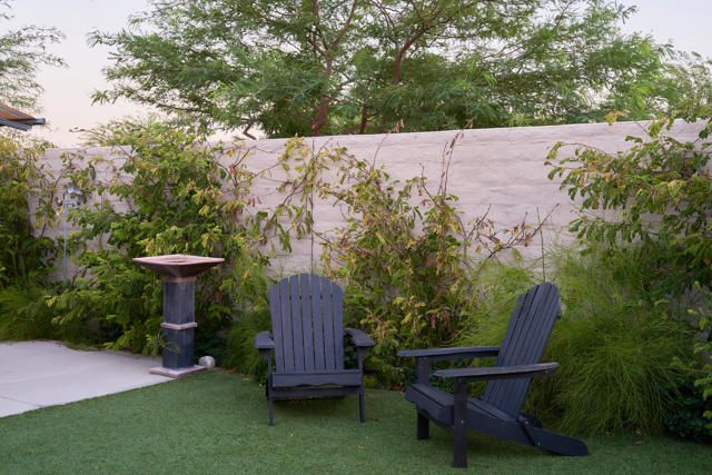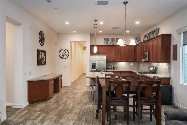 Live the resort lifestyle at Four Seasons Terra Lago! This 3-bedroom, 2-bath home showcases 14-ft ceilings, grey wood-look tile, recessed and cabinet lighting, and a gourmet kitchen with cherrywood cabinets, granite counters, stainless appliances, and island with stainless bar footrest. Relax in a backyard with mountain views, covered awning, outdoor TV, fruit trees, and turf dog run. Garage includes approx. 200 sq. ft. of bonus storage. Low HOA with access to golf, pickleball, pool, clubhouse, and social events. Conveniently located near Fantasy Springs Casino, golf resorts, and I-10 for easy travel.