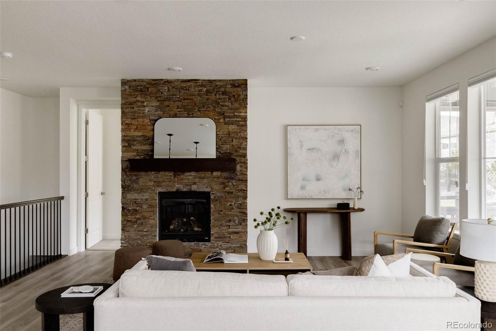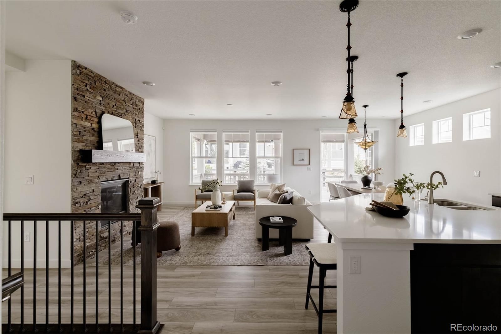Thoughtfully designed ranch-style home where modern finishes, functional living & exceptional indoor-outdoor spaces come together seamlessly. From the moment you arrive, the charming curb appeal, stone-accented exterior & covered front porch create a warm, welcoming first impression. Inside, a wide entry opens to a light-filled, open-concept layout enhanced by upgraded lighting, eight-foot doors & wide-plank flooring throughout the main living spaces. The kitchen is both stylish & highly functional, featuring quartz countertops, a gas range, stainless steel appliances, rich cabinetry & a spacious island perfect for gathering. A large pantry adds everyday convenience, while the kitchen flows effortlessly into the dining & living areas. The living room is anchored by a striking floor-to-ceiling stone fireplace, adding warmth & a sophisticated focal point. A dedicated study offers flexibility for a home office or creative space, while two well-appointed bedrooms provide comfort & privacy. The spacious primary suite is a true retreat with a tray ceiling, abundant natural light & a spa-like bath with dual sinks & an oversized walk-in shower. A secondary bedroom & bathroom feature clean, modern finishes & the laundry room is conveniently located with additional storage. Outdoor living is a standout feature, with an expanded flagstone patio, covered deck & low-maintenance turf yard creating multiple spaces to relax & entertain. Retractable solar shades enclose the patio for added privacy & year-round use.Additional highlights include a two-car garage & an unfinished basement ready for future expansion or storage. Blending thoughtful upgrades with a highly livable layout, this home offers a low-maintenance, elevated lifestyle in one of Aurora’s most desirable communities.