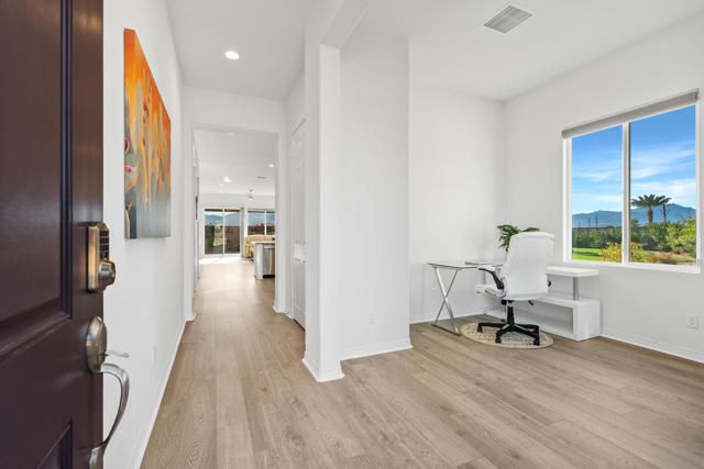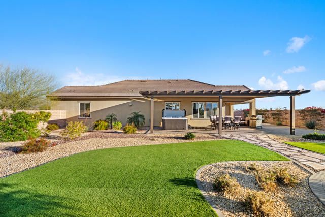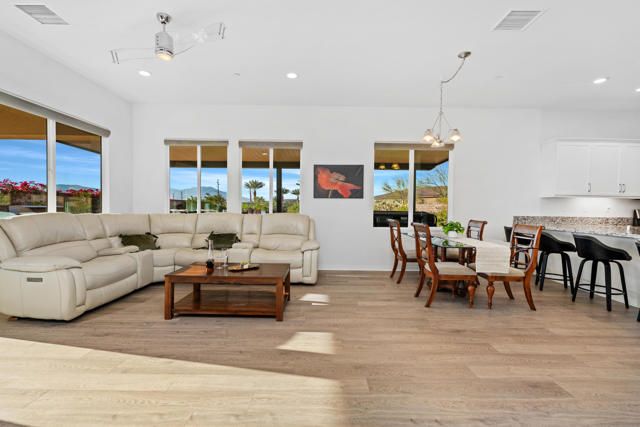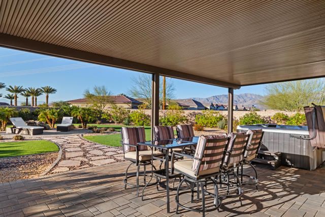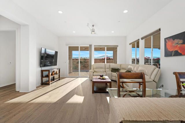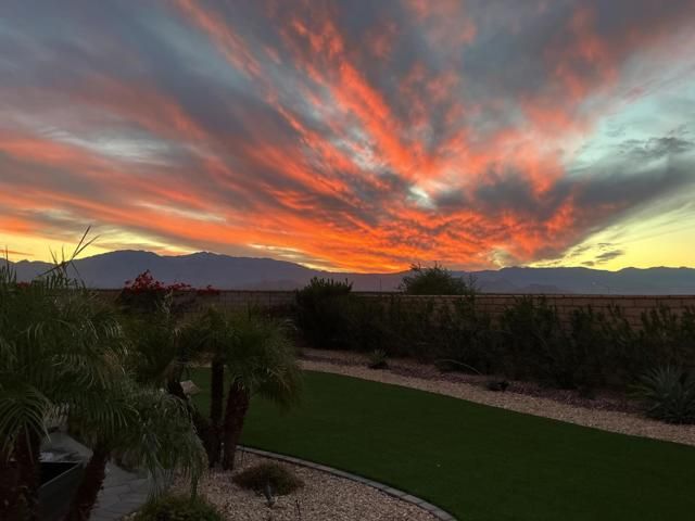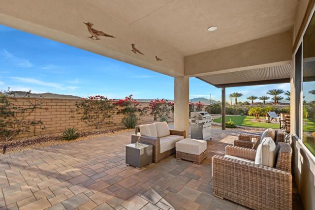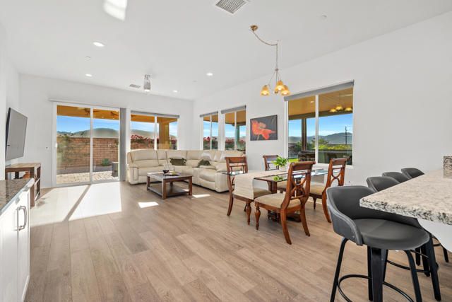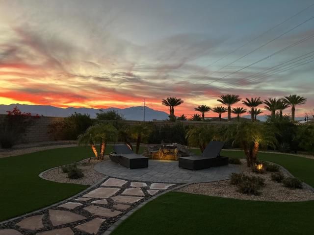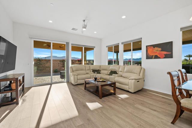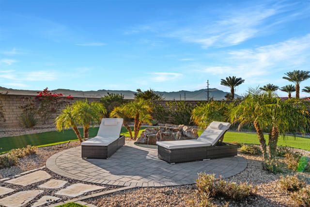 Step into this 1,704 sq. ft. home in the active 55+ Community of Four Seasons at Terra Lago, perfectly set on an abundant 10,951 sq. ft. lot. With 2 bedrooms plus a versatile den, office, or media room--easily converted to a third bedroom--and 2 baths, this home seamlessly blends comfort, elegance, and flexibility.The expansive backyard is a true desert sanctuary, offering panoramic, unobstructed mountain vistas: Santa Rosa to the south, San Jacinto to the west, and Shadow Mountains to the north. With only one neighboring home to the east, the rest of the perimeter is private, while just across the street, a walking trail invites morning strolls or evening walks. A peaceful waterfall graces the side yard alongside a relaxing spa, and large covered patios provide an ideal setting for quiet reflection or lively entertaining. With room for a pool, the outdoor possibilities are endless.Inside, high (10 foot) ceilings and luxury flooring create a light, bright, and airy ambiance throughout. The Great Room invites gatherings, framed by sweeping views of the yard and mountains. The spacious kitchen, with peninsula, large walk-in pantry, and abundant cabinetry, offers ample storage and inspires culinary creativity. A separate laundry room adds convenience, and thoughtful storage throughout ensures everything has its place.The primary suite is a serene oasis, with large windows opening to your private retreat. The luxurious bath and generous walk-in closet provide the perfect sanctuary for relaxation and renewal. A two-car garage completes the home, offering space for vehicles, hobbies, or extra storage.Residents enjoy the full Four Seasons lifestyle, including a grand clubhouse, fitness center, indoor and outdoor pools, tennis and bocce courts, and a variety of clubs and activities--all just minutes from dining, shopping, and Fantasy Springs and Spotlight 29 Casinos.Impeccably maintained, wonderfully private, and offered furnished available outside of escrow, this home is a rare desert gem--an inviting retreat where comfort, and breathtaking scenery converge.