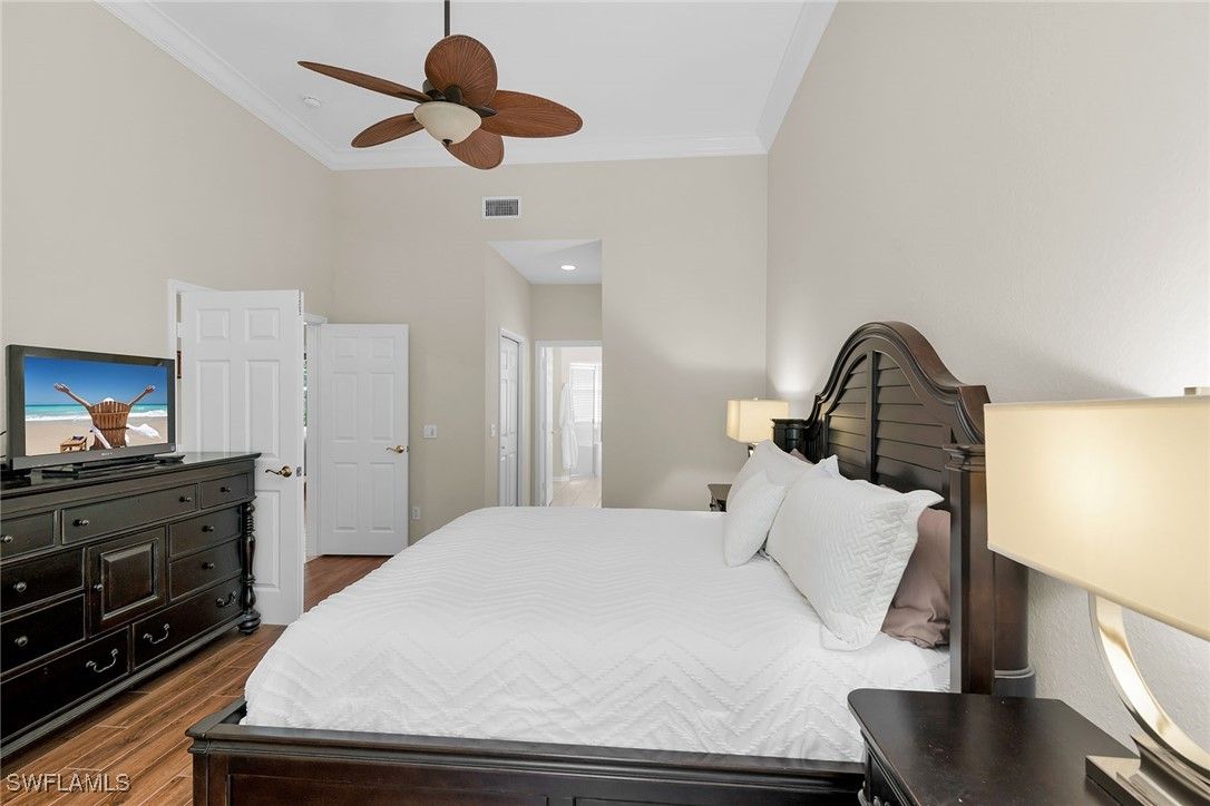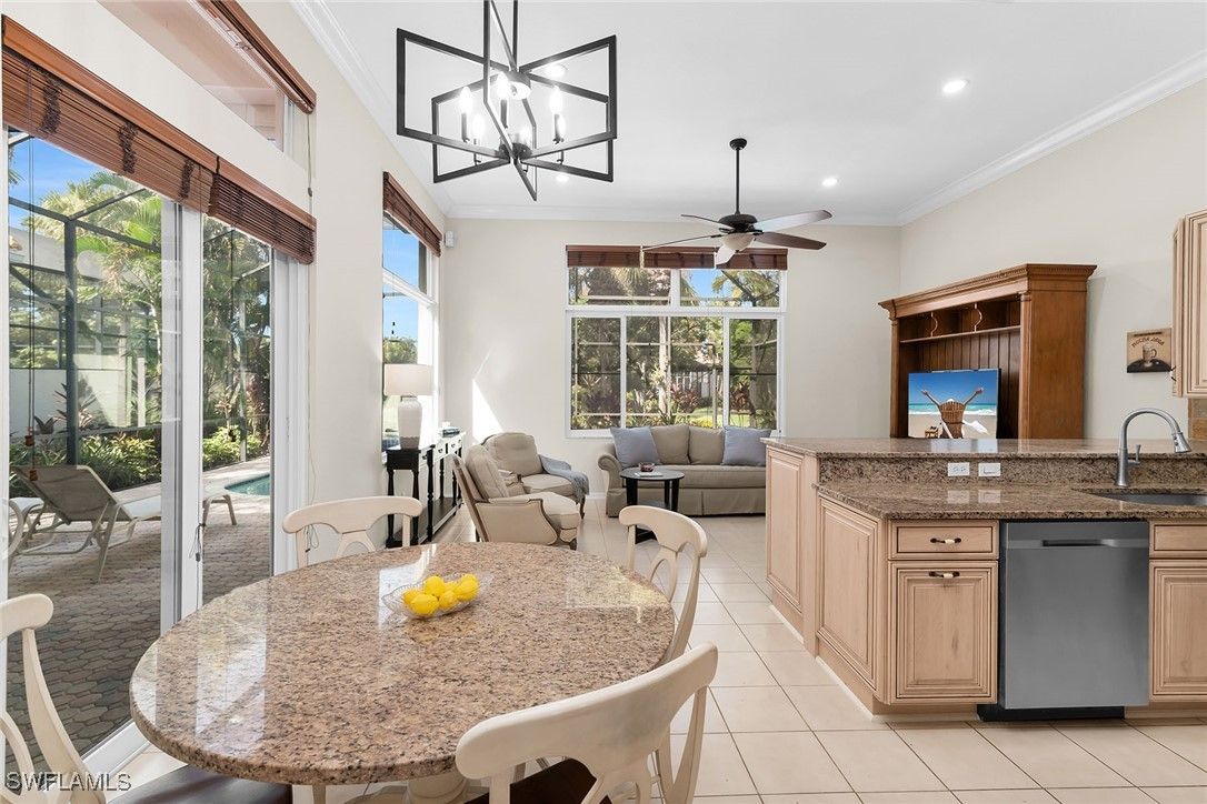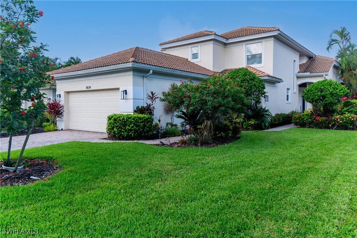 Beautiful sunsets with western exposure, this four-bedroom, three-bath has expansive lake views, in the popular and quiet village of Pepper Tree with an open kitchen and family room, vaulted ceilings, living room and dining room. Cost-efficient features include 2019 roof, 2019 air conditioner, 2019 water heater, impact glass windows and sliders throughout this home and the property is not in a flood zone. The primary bedroom is on the first floor with two walk-in closets and includes an en-suite bath with two sinks, large tub and separate shower. A first-floor guest bedroom could be utilized as a den. Upstairs features a private guest area with two bedrooms and a Jack-and-Jill bath. The two-car garage has built-in shelving with epoxy flooring. There is plenty of outdoor living on the oversized paver lanai with considerable coverage and a large area for sunning while enjoying the pristine pool and water feature. The covered lanai is protected by electric storm shutters. A life of luxury is ensured in this residence enhanced by the 54,000-square-foot club and spa, full-service spa, fitness center complete with personal trainers and fitness classes, three swimming pools, championship golf courses, bocce, and six tennis courts and pickleball courts with competitive teams. Fiddler's Creek is close to Marco Island Executive Airport, beaches, shopping, restaurants, boating and easy access to Naples 5th Avenue.