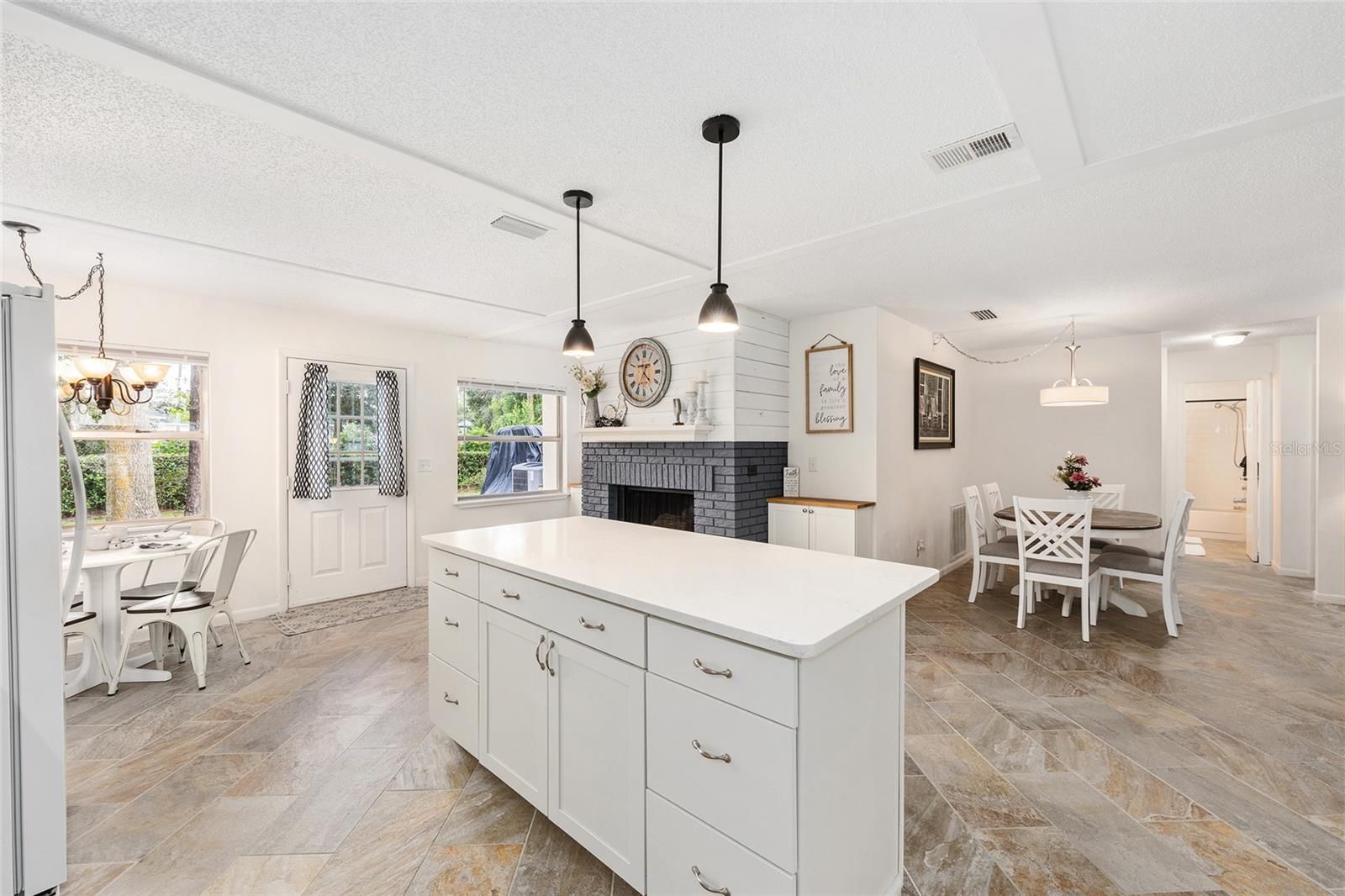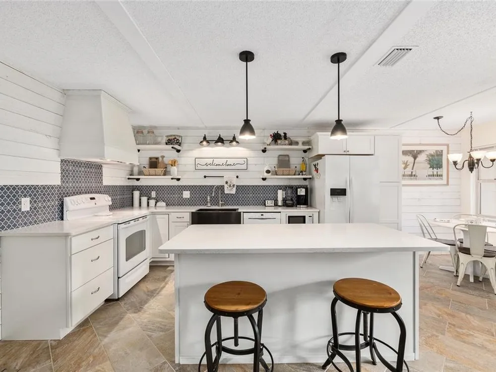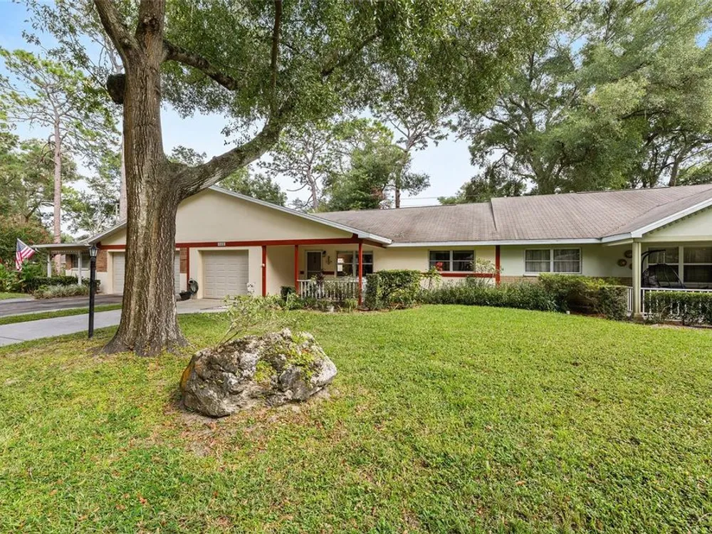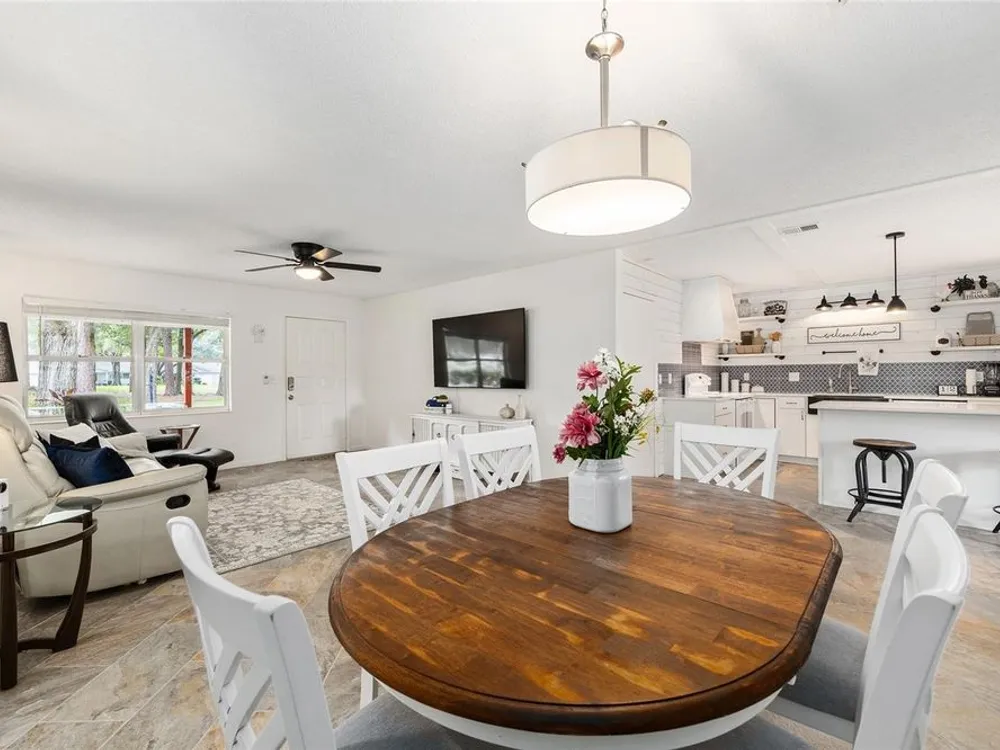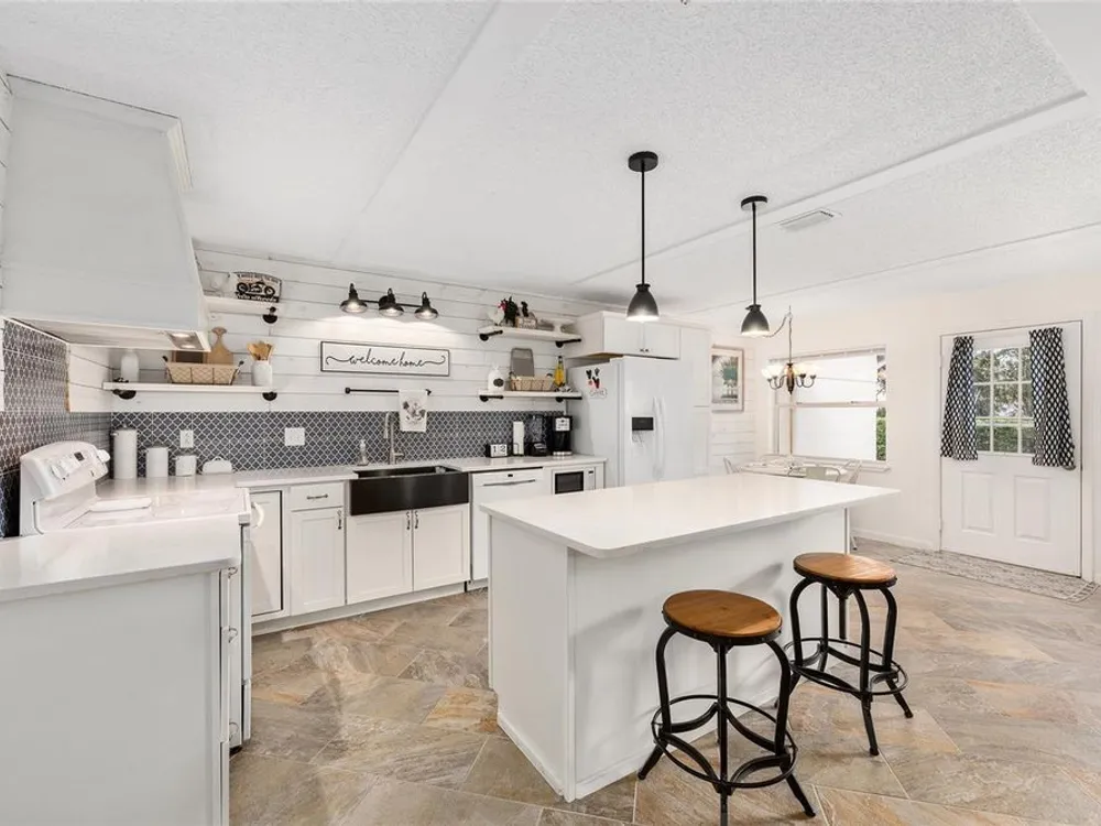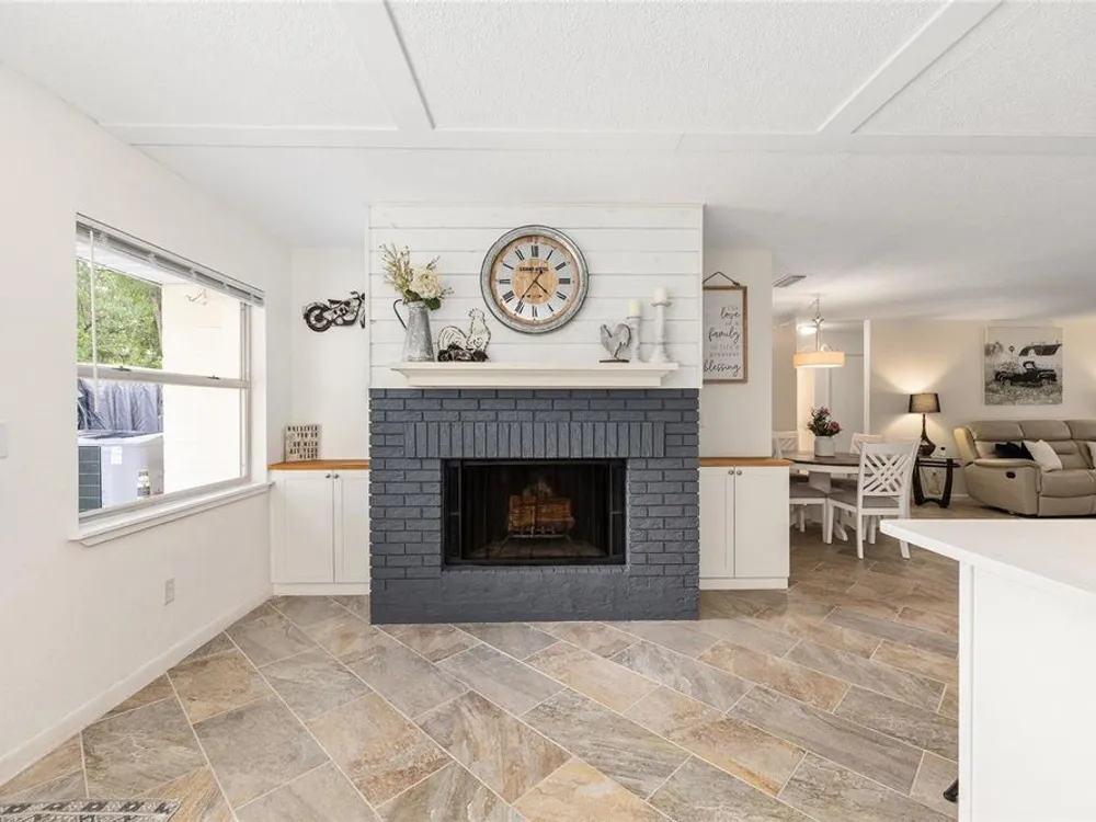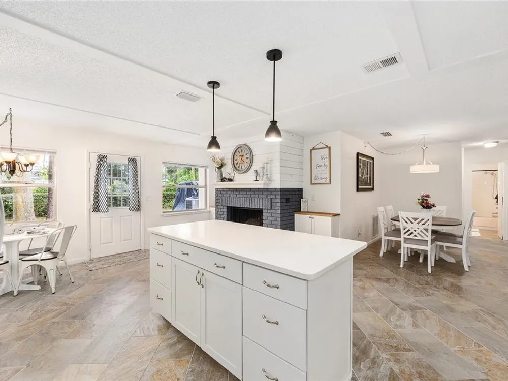 Located in Ocala’s premier 55+ community, YOU won't find another beautifully updated VILLA at such a REMARKABLE PRICE. Nestled in a peaceful, park-like setting, the home welcomes you with a charming covered front patio—perfect for enjoying your morning coffee or evening tea. Step inside to discover porcelain tile flooring throughout and a fully remodeled modern farmhouse kitchen designed to impress, complete with a cozy breakfast nook, deep farmhouse sink, custom cabinetry, quartz countertops, and a large center island ideal for casual dining or entertaining. The open living area is enhanced by a built-in corner fireplace, creating both warmth and character. Retreat to the spacious primary suite featuring walk-in closets with custom built-ins, a modern vanity, and a stunning tiled walk-in shower. Enjoy seamless indoor-outdoor living with an inviting open-concept back patio, perfect for relaxing or hosting guests. Residents of On Top of the World enjoy 24/7 security, resort-style amenities including pools, clubhouse, fitness and recreation centers, plus golf cart access to two shopping centers. Just minutes from healthcare, grocery stores, and restaurants, this home is the perfect place to enjoy your Florida lifestyle.