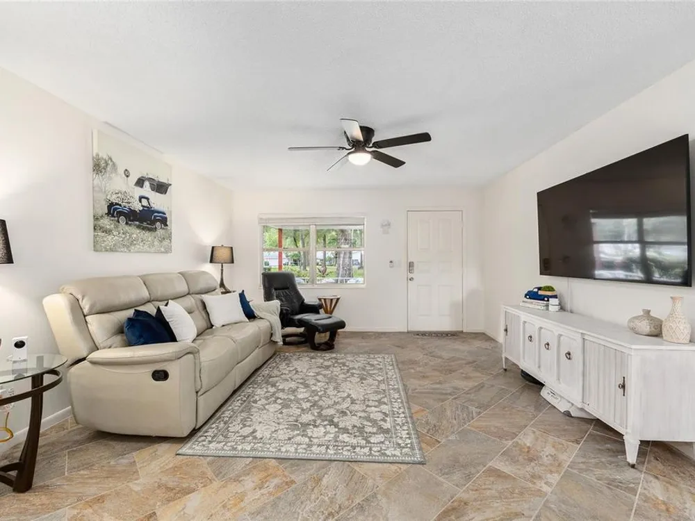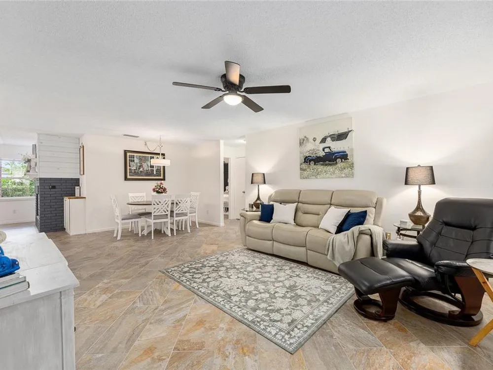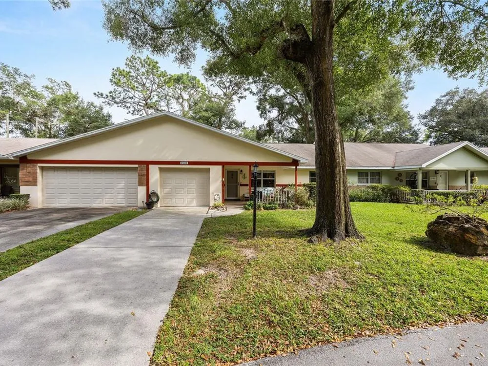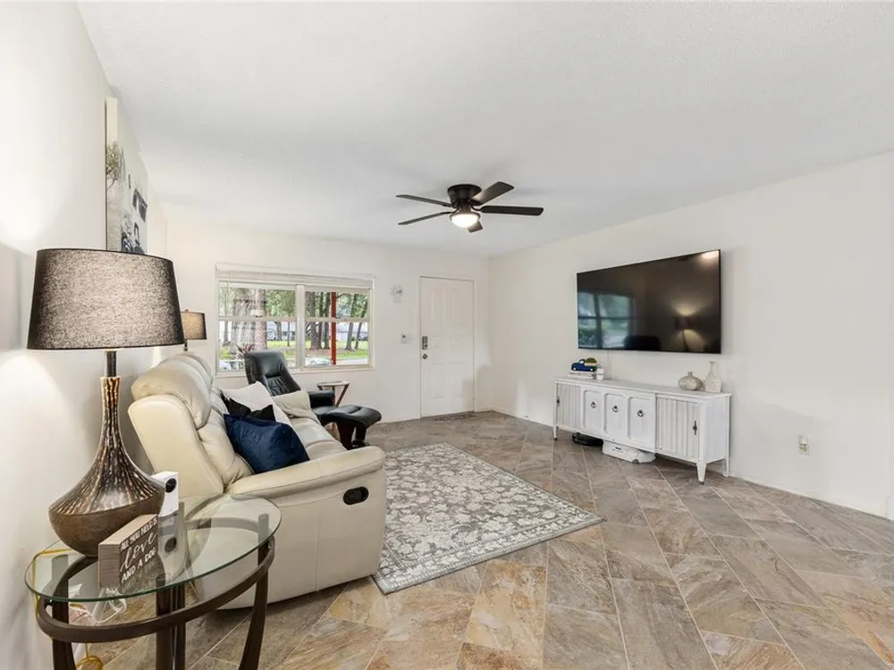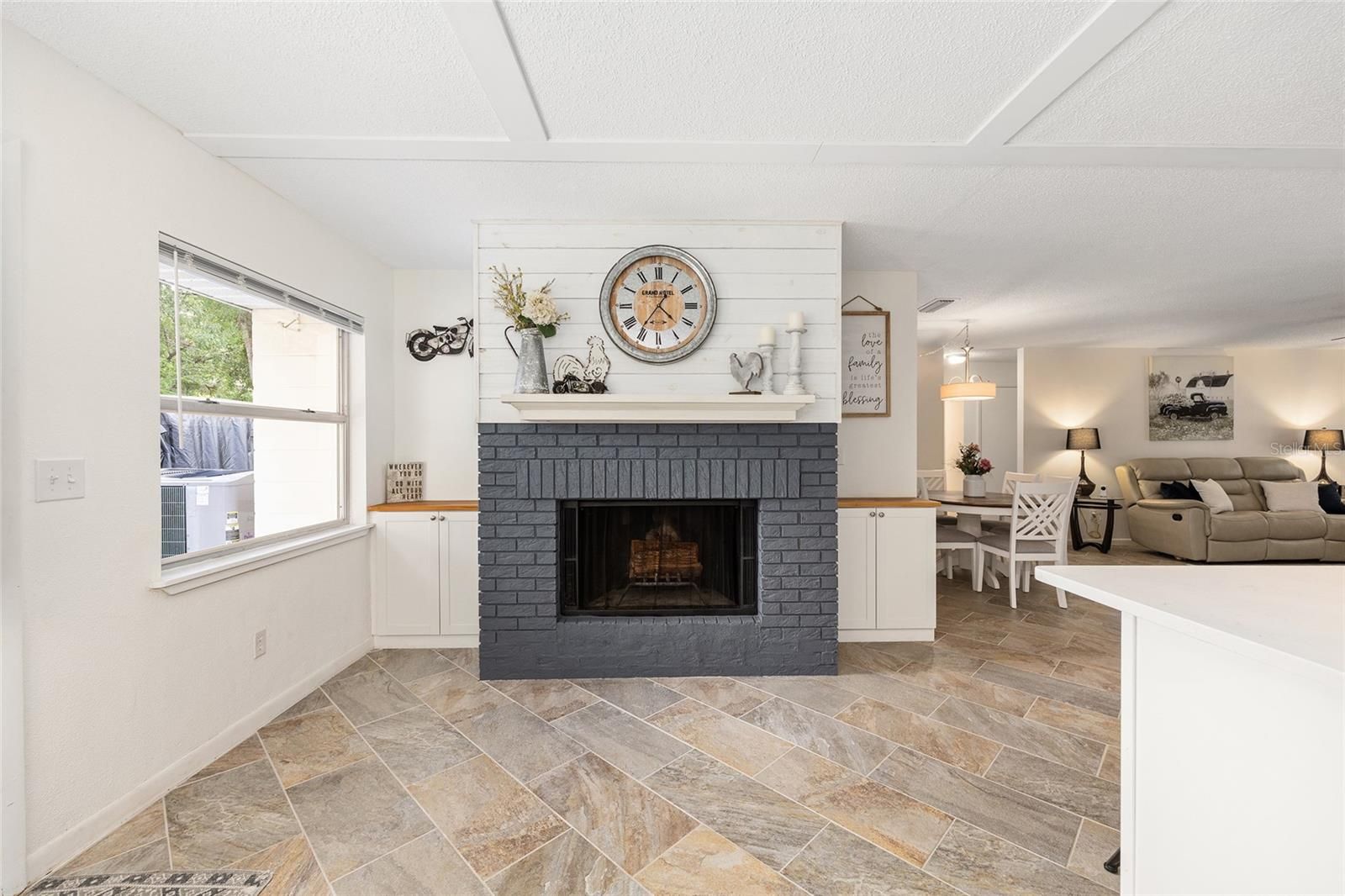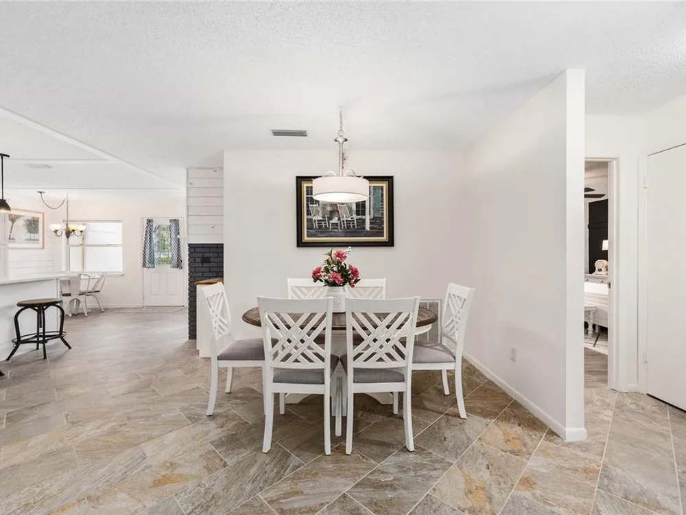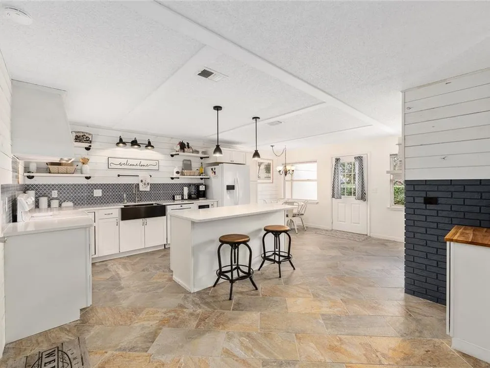 Located in Ocala’s premier 55+ community, YOU won't find another beautifully updated VILLA at such a REMARKABLE PRICE. Nestled in a peaceful, park-like setting, the home welcomes you with a charming covered front patio—perfect for enjoying your morning coffee or evening tea. Step inside to discover porcelain tile flooring throughout and a fully remodeled modern farmhouse kitchen designed to impress, complete with a cozy breakfast nook, deep farmhouse sink, custom cabinetry, quartz countertops, and a large center island ideal for casual dining or entertaining. The open living area is enhanced by a built-in corner fireplace, creating both warmth and character. Retreat to the spacious primary suite featuring walk-in closets with custom built-ins, a modern vanity, and a stunning tiled walk-in shower. Enjoy seamless indoor-outdoor living with an inviting open-concept back patio, perfect for relaxing or hosting guests. Residents of On Top of the World enjoy 24/7 security, resort-style amenities including pools, clubhouse, fitness and recreation centers, plus golf cart access to two shopping centers. Just minutes from healthcare, grocery stores, and restaurants, this home is the perfect place to enjoy your Florida lifestyle.