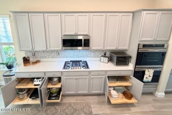 Premium preserve homesite in Nocatee's exclusive gated 55+ Artisan Lakes community -- this meticulously upgraded, move-in ready home delivers unmatched privacy, space, and resort-style living on one of the most coveted lots in the neighborhood. Set on a wide preserve lot with no rear neighbors and serene natural views in every direction, this 2,173 square foot single-story residence offers every upgrade already done -- giving you the benefits of new construction without the wait, the builder markups, or the months of decision fatigue. The extended screened lanai is the heart of this home -- a true private retreat overlooking the protected preserve where mornings start with coffee and birdsong, not rooftops. The open floor plan brings the outdoors in with soaring ceilings, abundant natural light, and a seamless flow from the living area to the lanai that creates an indoor-outdoor living experience rarely found in a maintenance-free community Every detail inside has been thoughtfully improved for real daily living. The gourmet kitchen features quartz countertops, stainless steel appliances, a gas cooktop, custom cabinetry, and a generous entertaining island -- with custom pull-out shelving throughout for storage and functionality that builder-grade homes simply don't offer. Closets, pantry, and cabinetry have all been maximized so everything has a place. The split bedroom layout ensures total privacy -- the spacious owner's suite with spa-like bath and walk-in closet is tucked away on one side, while two comfortable guest bedrooms and a well-appointed guest bath are privately situated on the other. Two and a half bathrooms means no one is ever waiting, whether it's just the two of you or a house full of visitors. Even the garage has been taken to the next level -- a whisper-quiet garage door, keyless entry, durable epoxy flooring, and upgraded smart home technology make this one of those spaces you didn't know you needed until you experience it. Paired with a tankless water heater, smart thermostat, and quality stone veneer and stucco construction throughout, this home is truly turnkey. Bring your furniture and start living from day one. Artisan Lakes offers resort-style amenities including a clubhouse, fitness center, pool, pickleball and tennis courts, and a vibrant social calendar -- plus full access to Nocatee's Splash & Spray parks, trails, shopping, and dining. Lawn care is included, keeping life simple. Minutes from the beaches of Ponte Vedra, the charm of St. Augustine, and everyday conveniences by golf cart. This is what maintenance-free 55+ living looks like when you refuse to compromise on privacy, quality, and a home that's ready the moment you walk through the door.