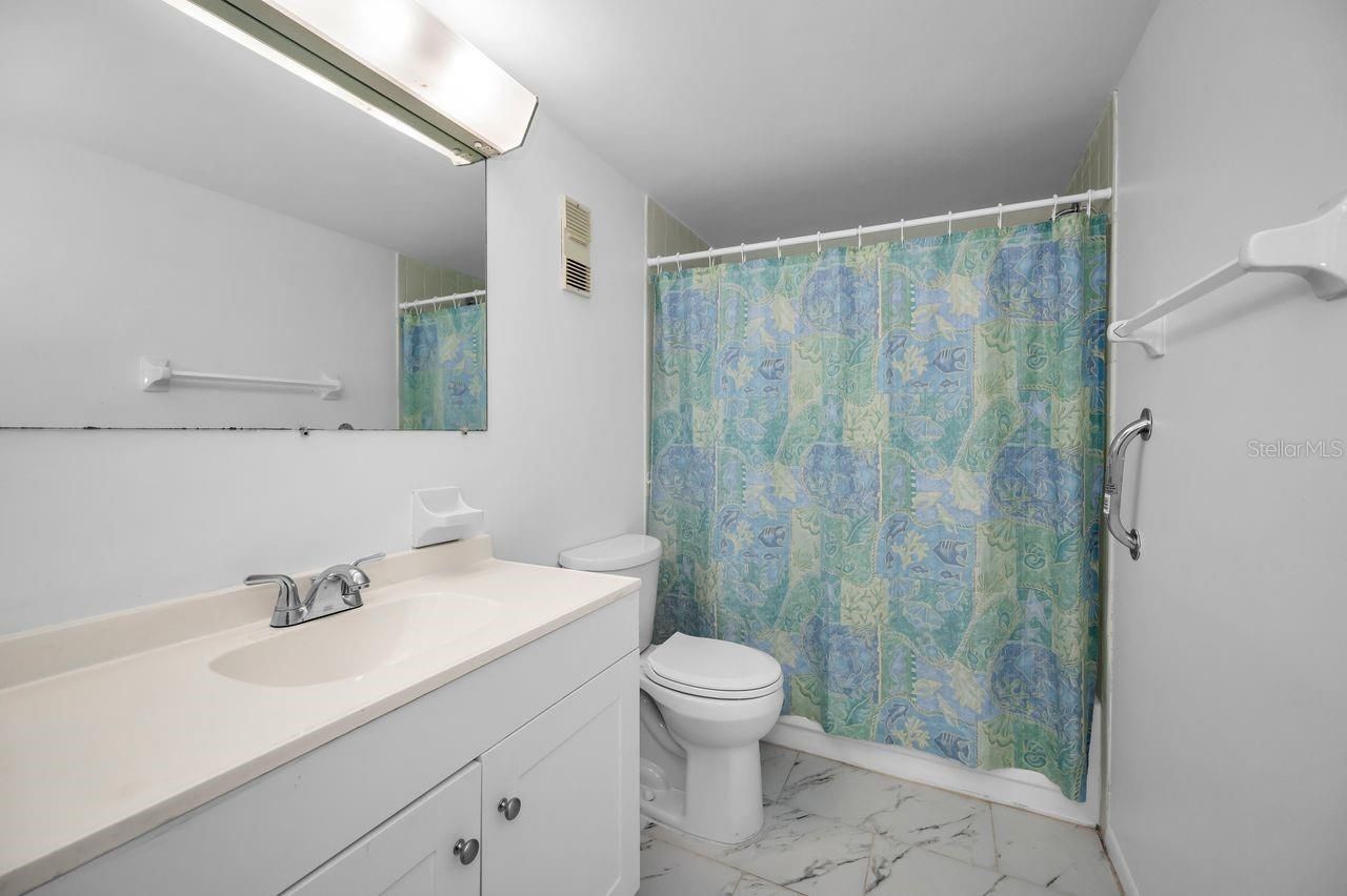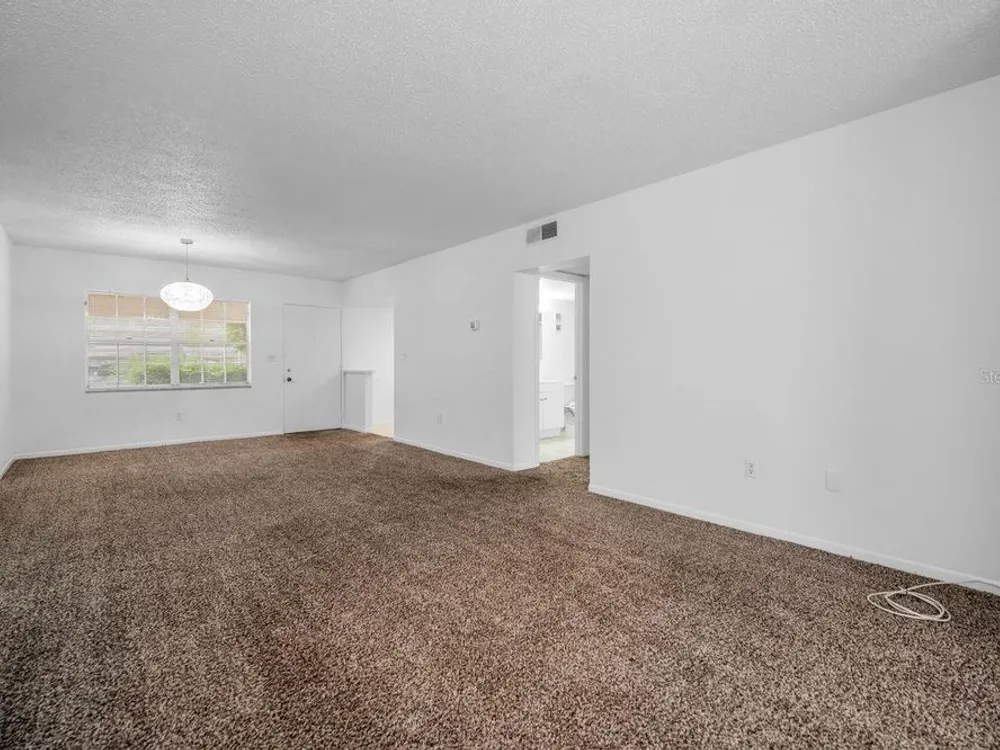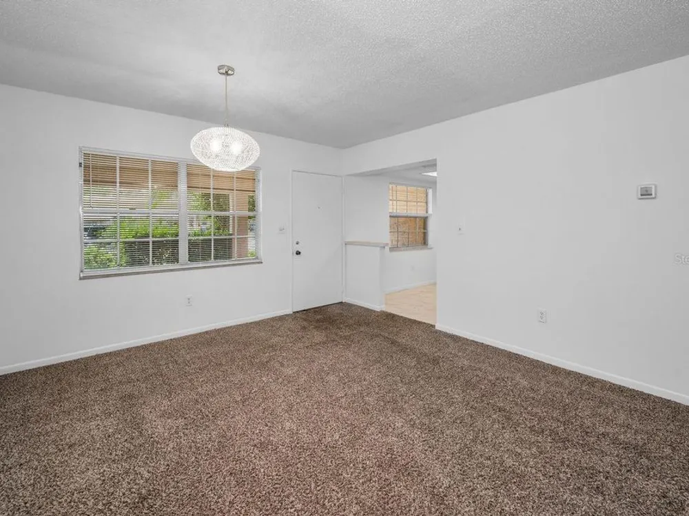 - Living/Dining Room, Main Level Primary, Stone Counters, Thermostat, Window Treatments