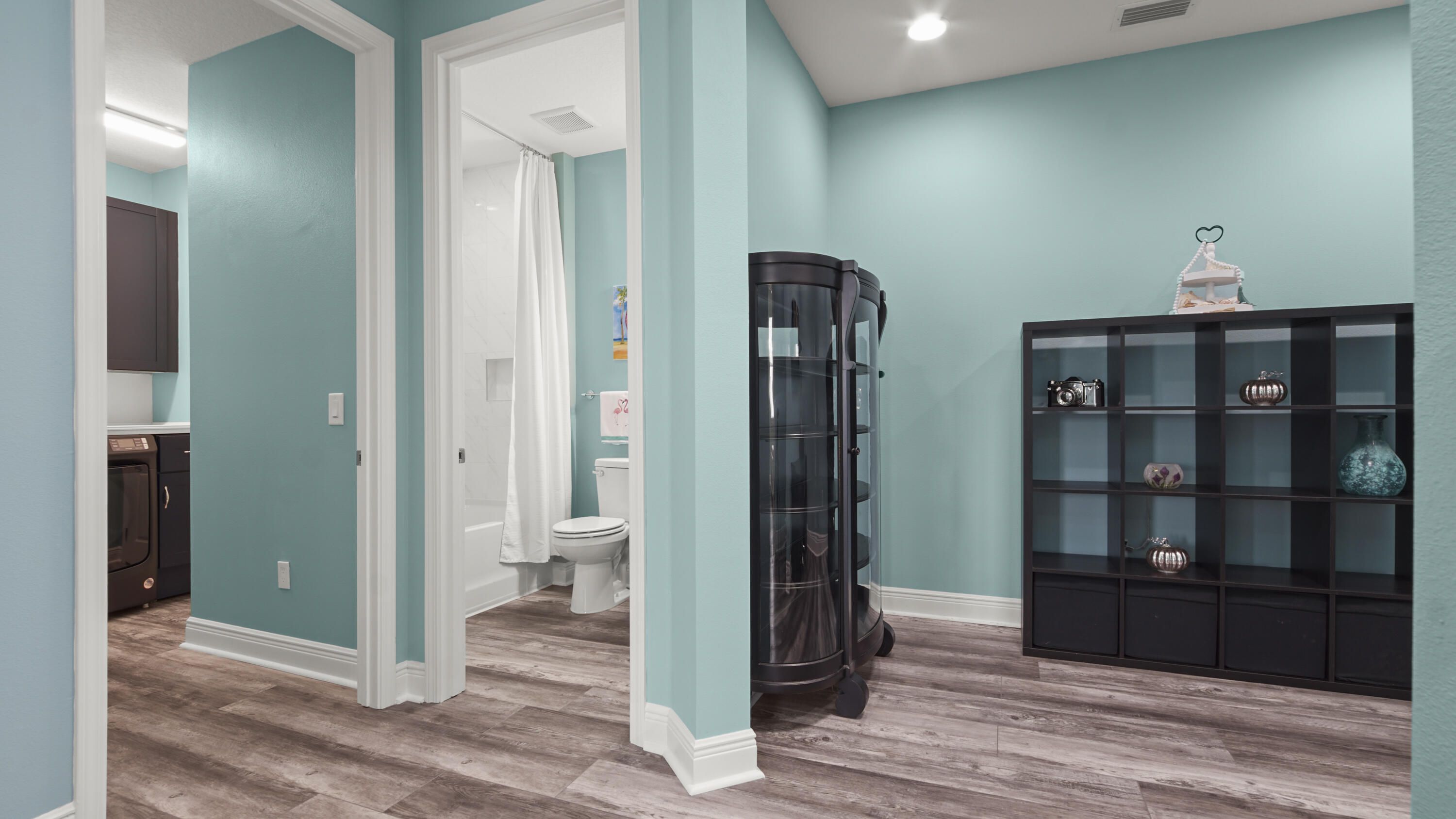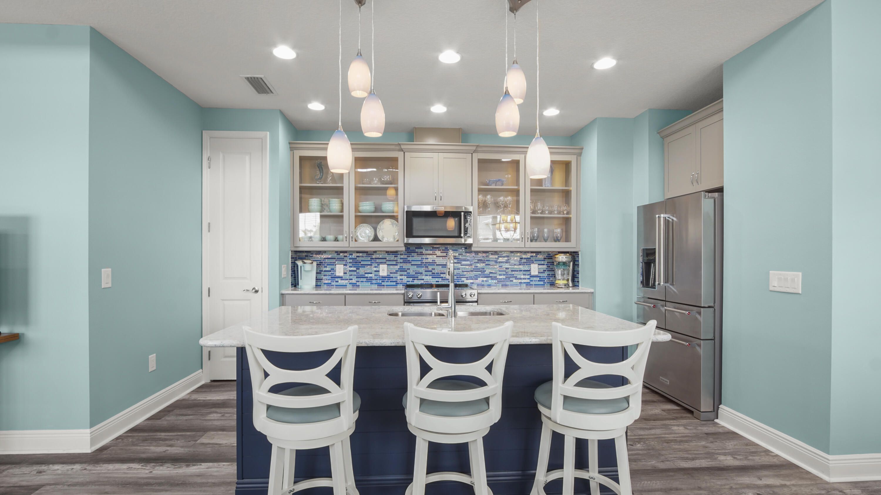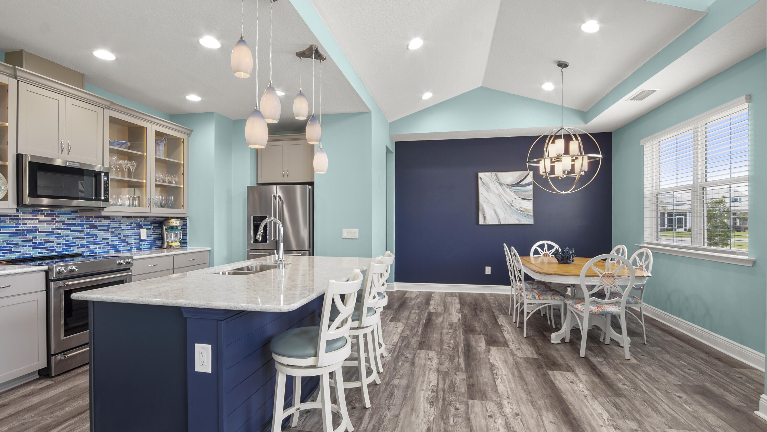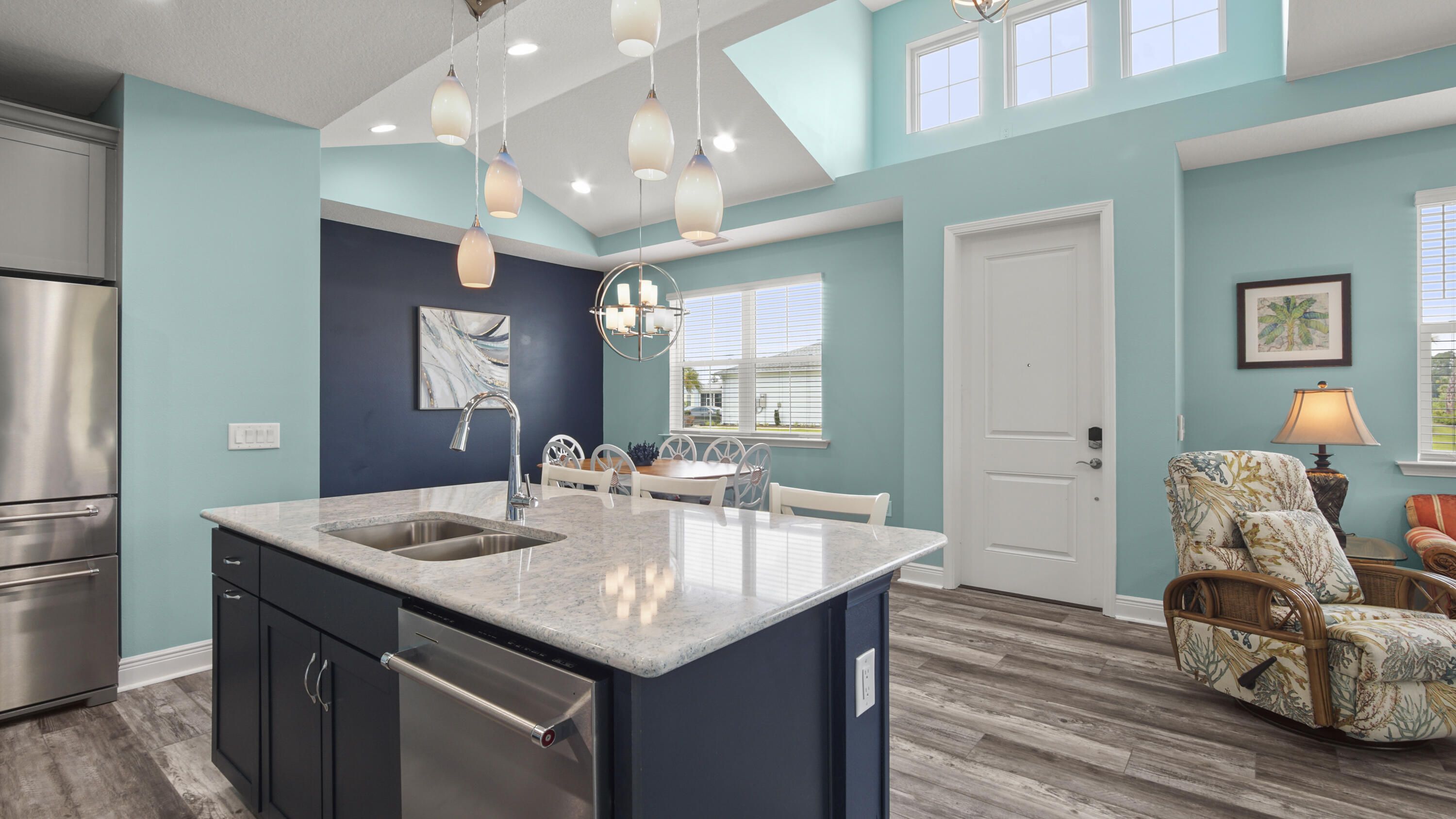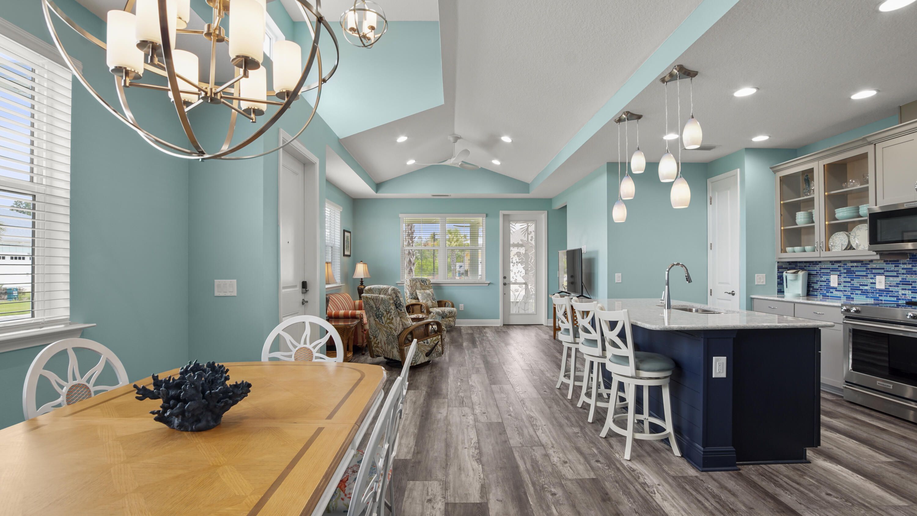 Welcome to this like-new Aloha floorplan located in Latitude Margaritaville, a gated 55+ community offering exceptional amenities and an active coastal lifestyle. This immaculate residence sits on a premium corner lot and features 2 bedrooms and 2 bathrooms, plus an additional flex-space perfect for an office, hobby room, or den. With over $75,000 in upgrades, this home showcases luxury vinyl plank flooring and recessed lighting throughout for a modern and cohesive feel. The kitchen is a chef's delight, featuring a spacious island, stainless steel appliances, a tiled backsplash, pantry, and beautiful lighted glass-front cabinetry with soft close doors. The bathrooms are equally impressive, with quartz countertops and showers that are tiled