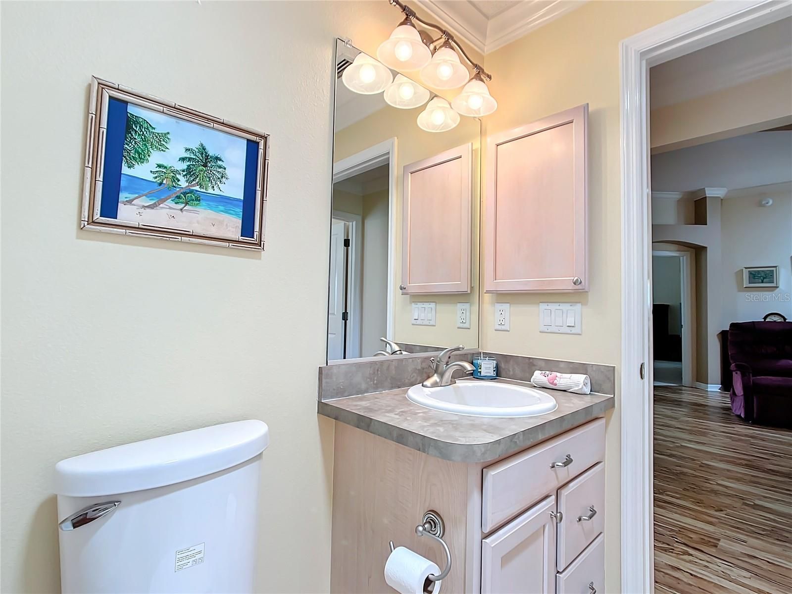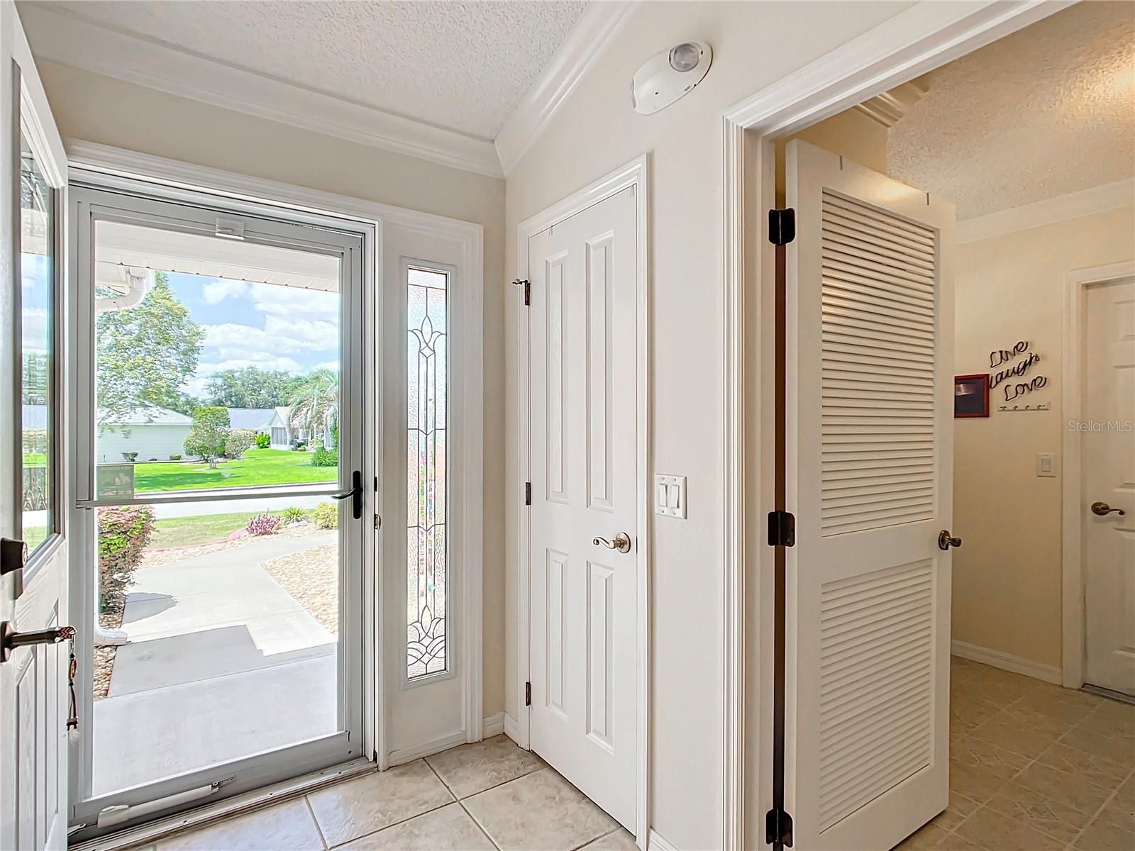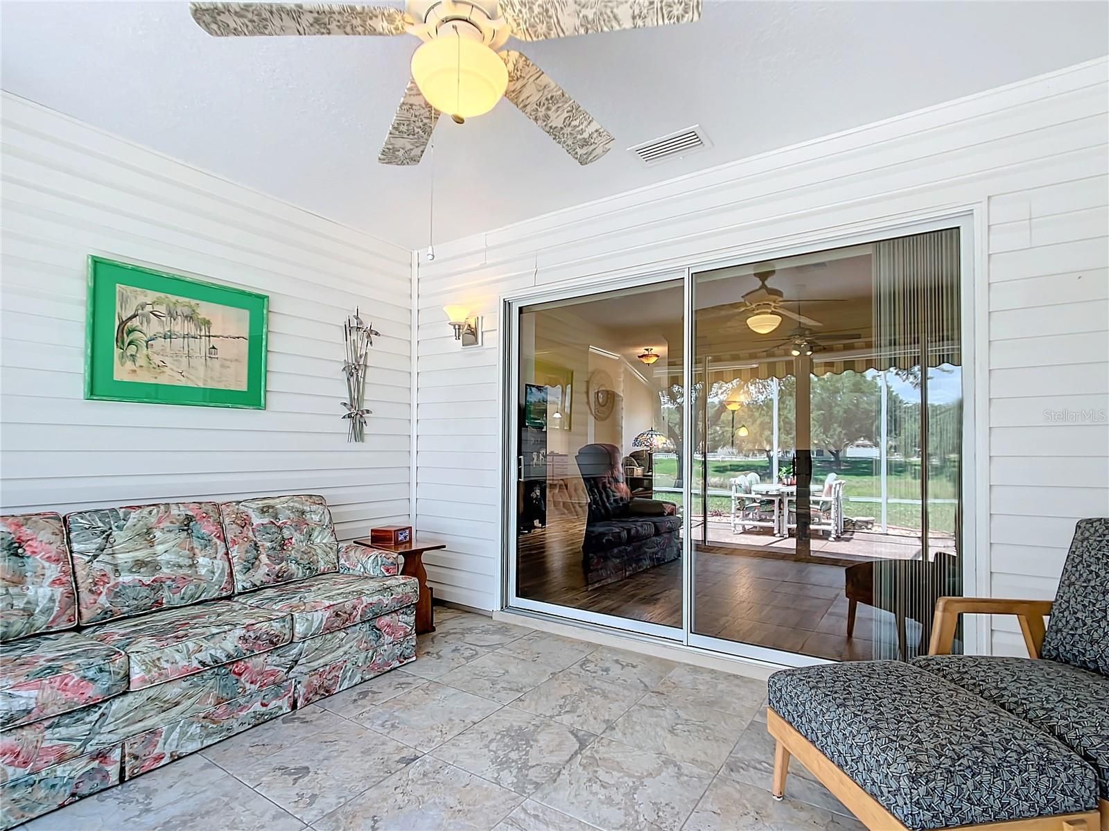 Located in the lovely Village of Briar Meadow, this GOLF COURSE home offers a relaxed lifestyle surrounded by lush, mature trees and plantings with expansive views of the Nancy Lopez Country Club Ashley Meadows Golf Course. The Legacy Restaurant and Pool Bar & Grill are close by as well as both Mulberry and First Responder’s Recreation Centers. Publix, Walgreens, restaurants, dog park, VA medical center and other medical buildings are a golf cart ride away. Plus the BOND is PAID!! This Cypress-style home has a front exterior sitting area and spacious interior floor plan with CROWN molding, CEILING FANS, wood-style flooring, a foyer entrance area, living room, formal dining area, generously-sized kitchen with GAS STOVE, counter seating, desk, built-ins and alcove dining area. Popular “SPLIT” floorplan for added privacy for the primary bedroom which has 2 walk-in closets, brand-new carpeting, en-suite bath with double vanity sinks and tiled shower. 2 additional guest bedrooms share a bath in between with one viewing the golf course and slider into an enclosed interior TILED lanai. An exterior bird-caged patio, with AWNING, which faces North backing up to the golf course, so you can enjoy sunrises and sunsets. Well-kept 3 space garage has room for 2 cars and a golf cart, epoxy floor and a sliding screen door. Also has a separate laundry room with cabinetry. Roof installed in 2021, HVAC Carrier brand installed in 2014 and serviced annually by Sunshine Air Conditioning, RINNAI TANKLESS water heater. The property is hard-scaped with concrete landscape borders and low maintenance stones in beds