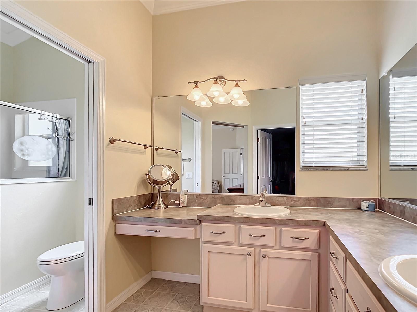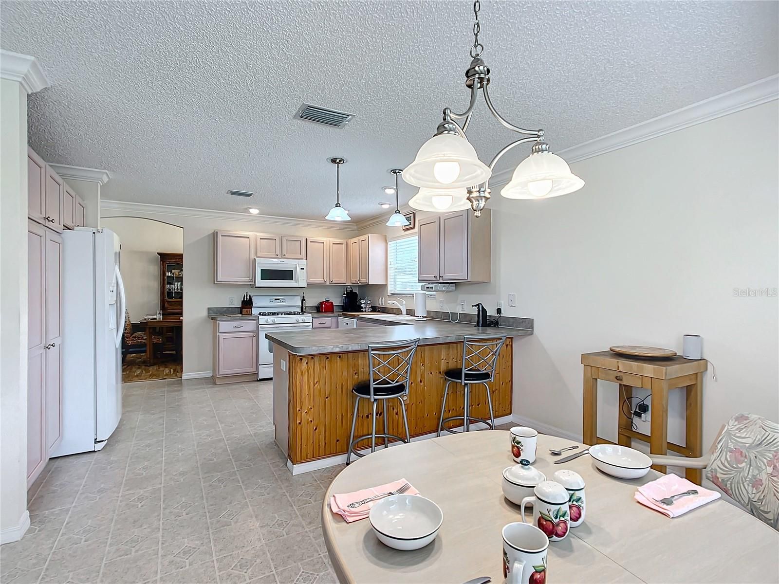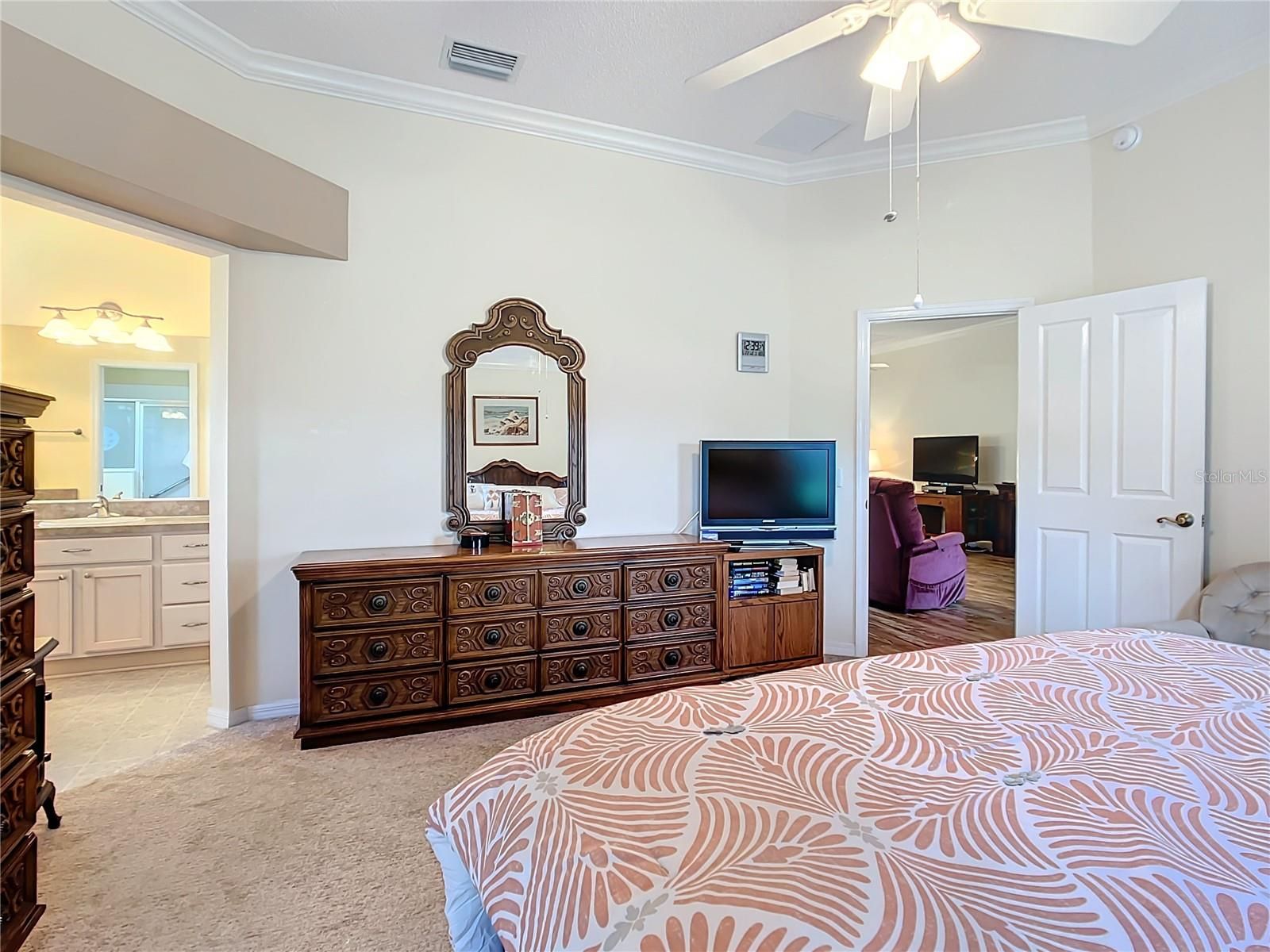 - Ceiling Fan(s), Crown Molding, Eat-in Kitchen, High Ceilings, Living/Dining Room, Main Level Primary, Solid Surface Counters, Split Bedrooms, Thermostat, Walk-In Closet(s)