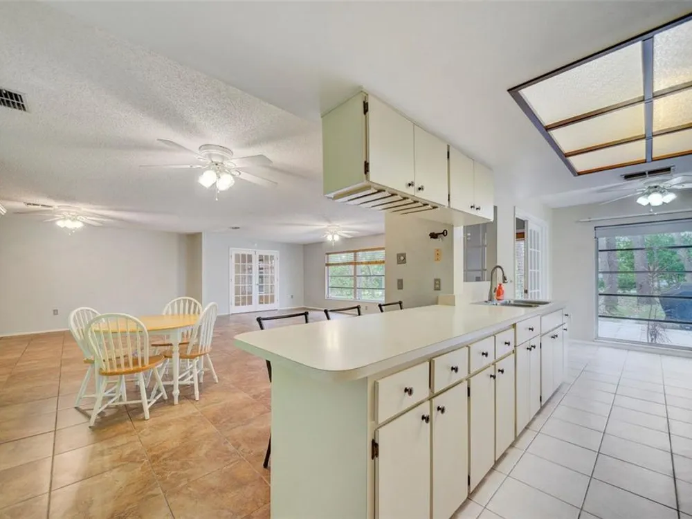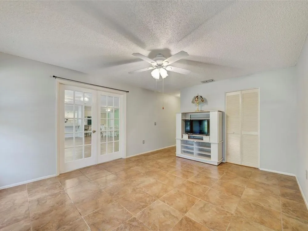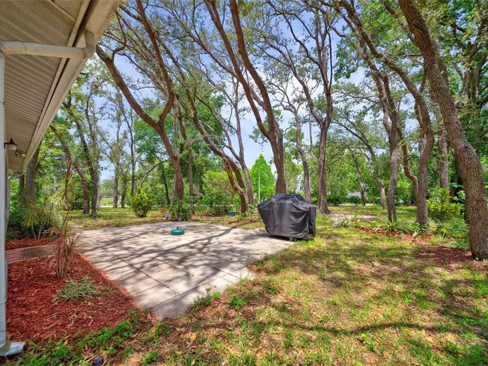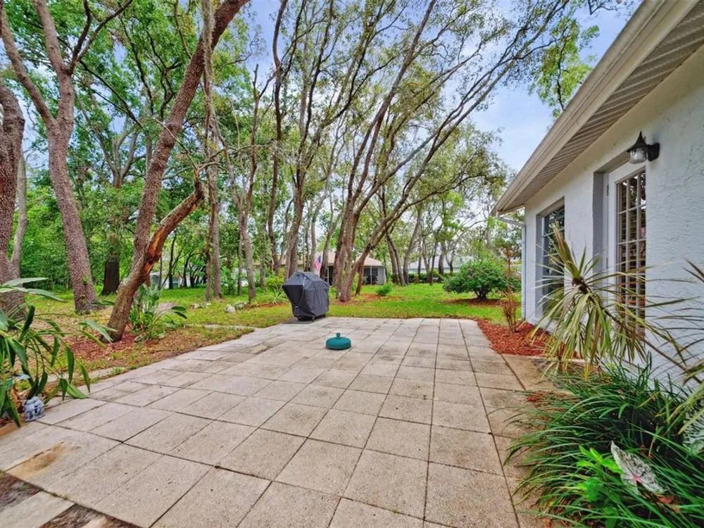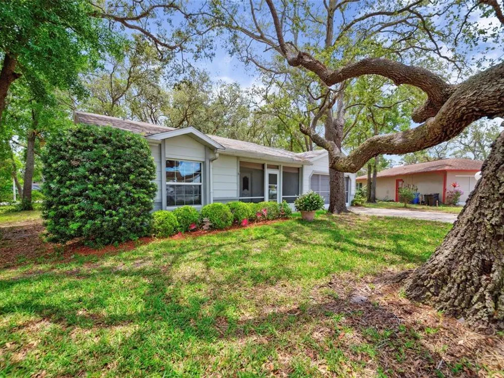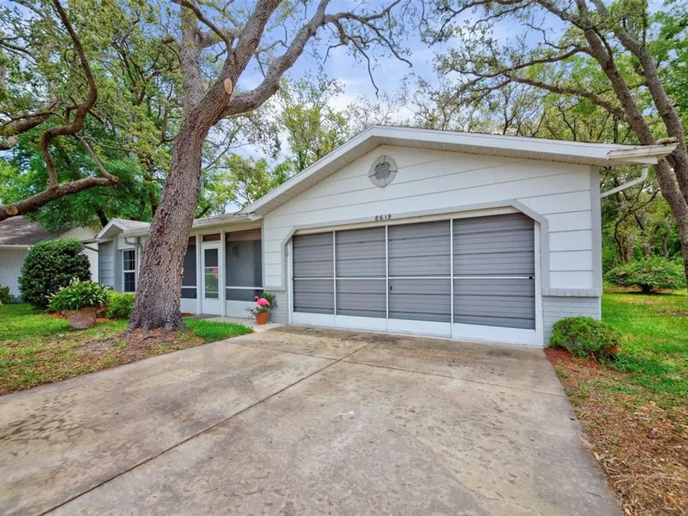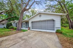 LOWERED THE PRICE FOR LABOR DAY WEEKEND VIEWING! Don't miss this darling, well maintained home in a cul de sac in Timber Oaks, 55+ community! It sits on a unique lot, with magnificent trees, and a large back patio to enjoy nature, or to entertain a group barbeque! This BLOCK, 2 bedroom, 2 bath, home is true Open Concept, with exceptional living space, and beautiful view to the shaded back yard. The eat-in kitchen and back bedroom can be closed off by glass French doors, which are a designer touch. The kitchen features newer LG appliances, a large pantry, and plenty of counter seating. The front entry has an enclosed tile porch, as well as ceiling fans - another perfect spot to enjoy the outdoors. The 2 car garage has washer/dryer hook-up, and screened for ventilation. The garage holds hurricane measured plywood and non-invasive attachments for all windows. They are marked. The HVAC system was totally reworked in June,'25- unit is 2013. The HOA is $55/month. The clubhouse, pool, shuffleboard and "sociability" are available to you! This is a true value today!