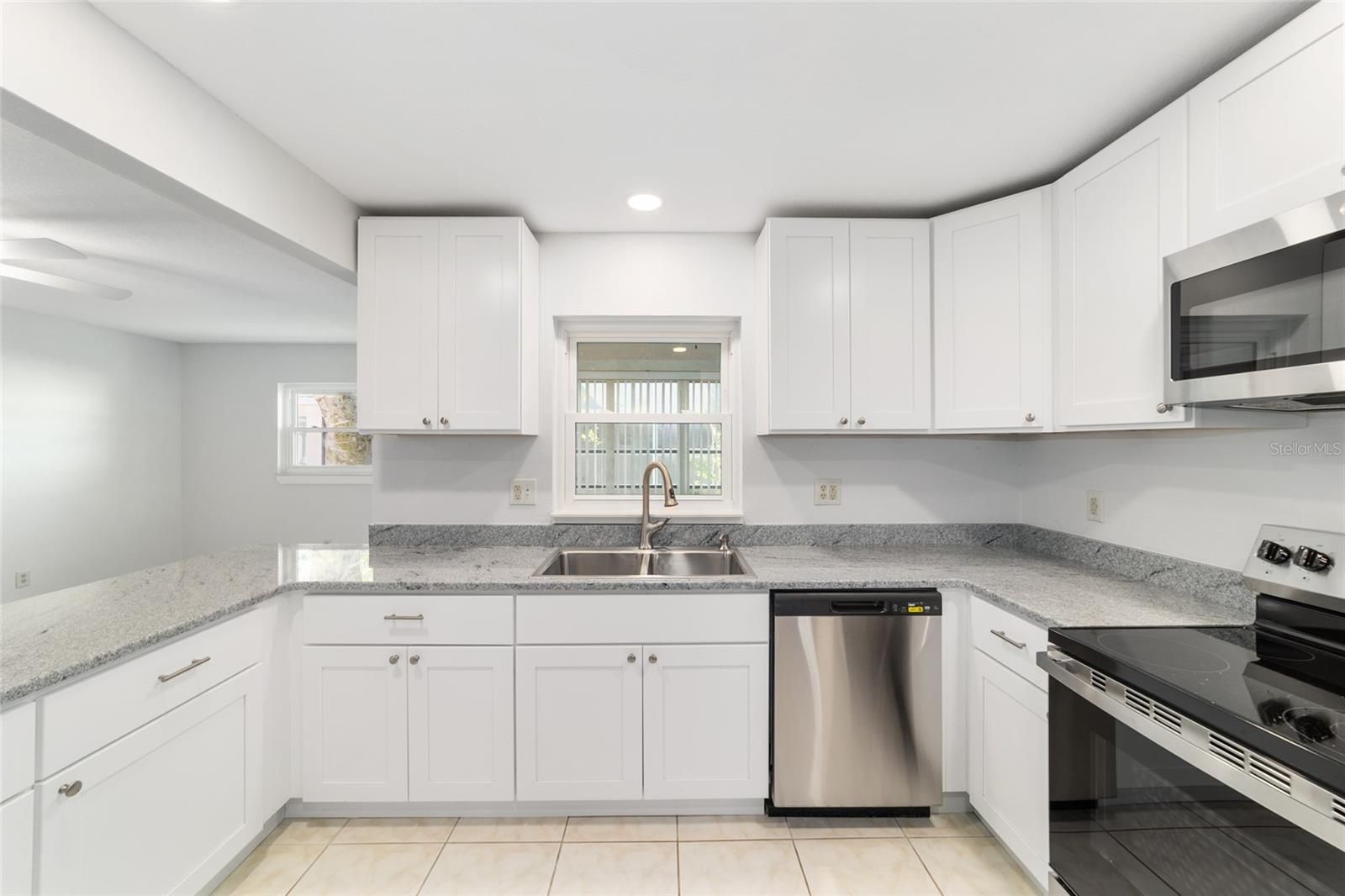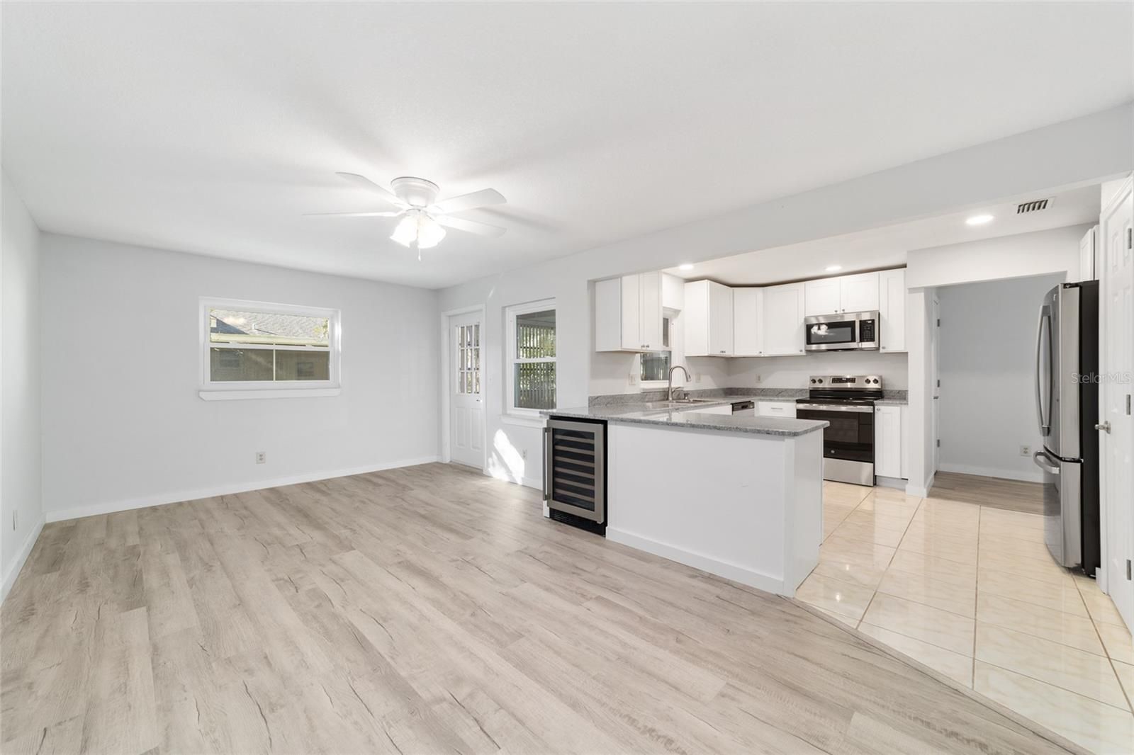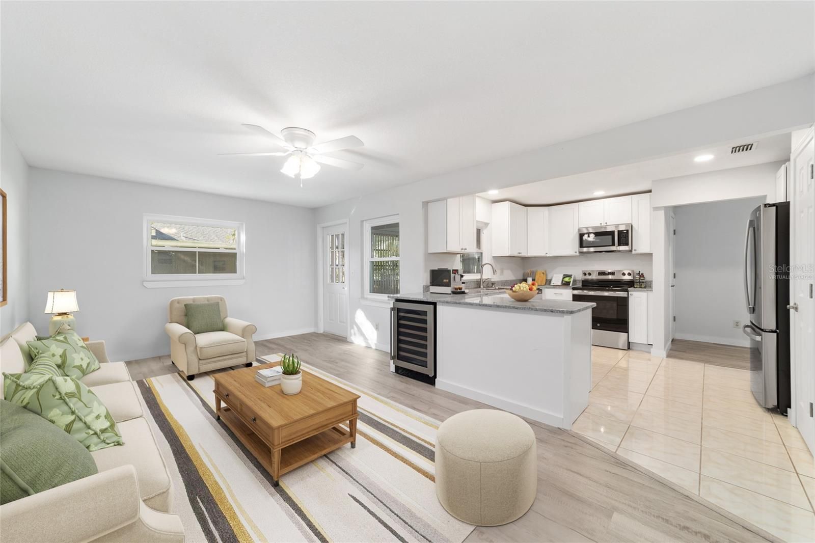 One or more photo(s) has been virtually staged. END UNIT: This remodeled and upgraded 2-bedroom, 2-bathroom, 2 car garage Montgomery is located on a tree lined street in On Top of the World. The kitchen is ABSOLUTELY stunning and has been updated with all new cabinets, counters, quartz counters, and new stainless-steel appliances-including a beverage fridge. Don’t settle for refaced cabinets when these white cabinets are all new with dovetail, soft close features. Plus, the kitchen has been bumped out for additional space. The spacious main bedroom easily accommodates a king size bed and features a large walk-in closet as well as an ensuite bathroom that has been fully updated with quartz counters, DOUBLE sinks, new cabinets, and new toilet. The large secondary bedroom can also accommodate a king size bed and the secondary bathroom is impressively updated as well. For peace of mind, the home has a newer roof (2017), new windows (2025), and offers a 2 YEAR HOME WARRANTY! Luxury vinyl plank floors throughout, new baseboards, new doors, new, hardware, new recessed lighting, new paint, and NO POPCORN CEILINGS are just some of the additional upgrades. This home has impeccable curb appeal with healthy sod and a painted driveway and front porch. On Top of the World is Ocala’s premier 55+ golf resort community offering an array of amenities and golf cart access to nearby shopping, dining, banking, health, and beauty.