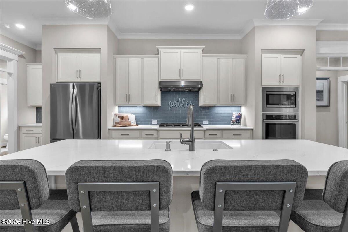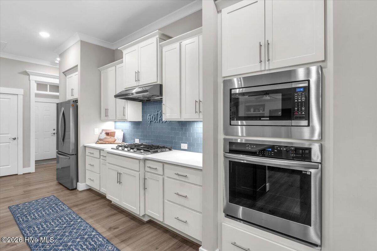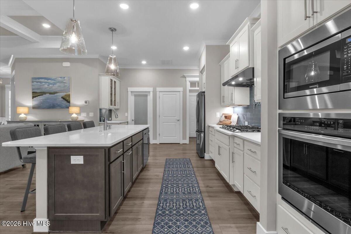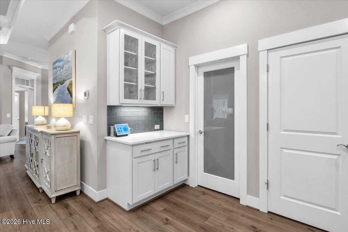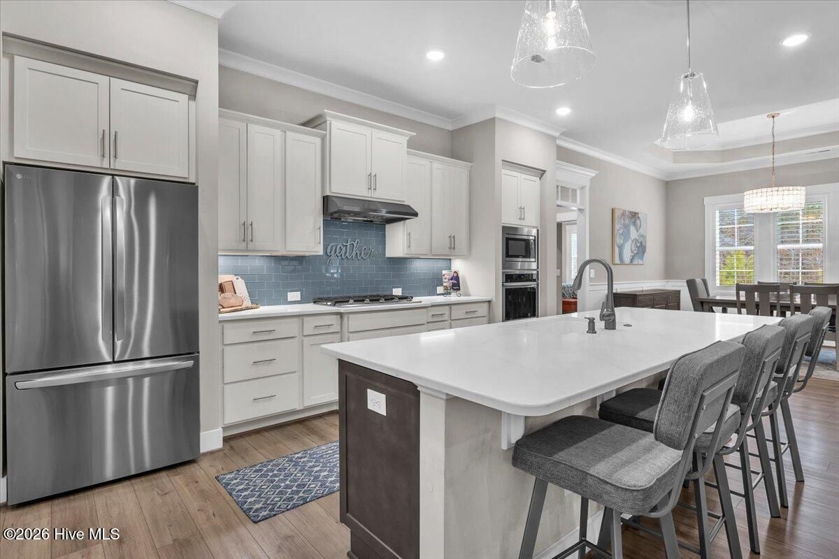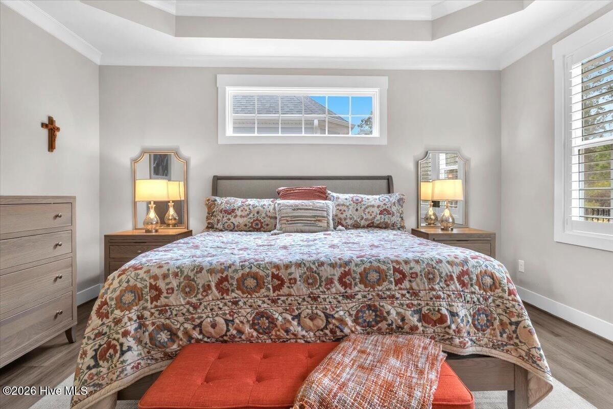 Welcome to resort-style living in the highly desirable Timber Ridge community of Compass Pointe. Nestled on a quiet street with a peaceful nature preserve homesite, this beautifully upgraded Kent Homes Jonesport model offers approximately 3,276 square feet of thoughtfully designed living space. This 4-bedroom, 3.5-bath residence includes a private office and a finished room over the garage, offering flexibility for guests, hobbies, or additional living space. The inviting covered front porch and attractive elevation create immediate curb appeal. Inside, the open-concept design is ideal for both everyday living and entertaining. A welcoming foyer leads to a private office with French doors and opens into the spacious living area, kitchen, and dining space. The beautifully expanded all-season sunroom quickly becomes the favorite gathering spot, featuring a stunning stone fireplace and tranquil views of the surrounding nature preserve. The split-bedroom floor plan offers privacy for both owners and guests. The spacious primary suite includes custom walk-in closet built-ins and a spa-like bath with dual vanities, a tiled walk-in shower, and a private water closet. Two additional bedrooms, a stylish guest bath, powder room, and a finished bonus room with full bath above the garage provide ample space for family and visitors. The home showcases numerous upgrades including luxury vinyl plank flooring throughout, quartz countertops, an oversized island, soft-close cabinetry, stainless steel appliances with a 5-burner gas range, coffered ceilings, crown molding, pocket doors, and plantation shutters throughout. A glass-enclosed lanai with its own HVAC zone provides comfortable year-round living, while additional features include a Rinnai tankless water heater with recirculating pump, sound-insulated guest areas, and a spacious laundry room with cabinetry and sink. Residents enjoy world-class amenities including the Grand Lanai clubhouse, indoor and outdoor pools, lazy river, fitness center, tennis and pickleball courts, walking and biking trails, on-site dining, and access to the Rick Robbins championship golf course. Experience privacy, luxury, and the unmatched coastal lifestyle that makes Compass Pointe one of the Wilmington area's most sought-after communities.