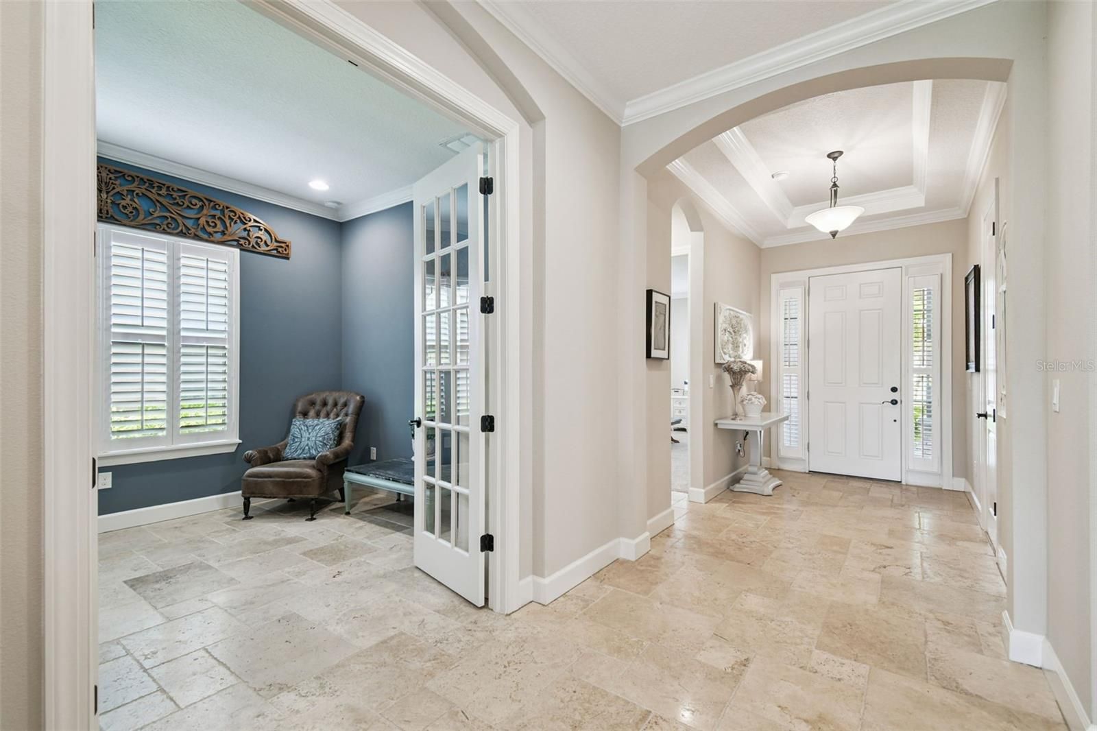 Luxury meets tranquility in this stunning home located in the exclusive GATED community of Esplanade of Tampa! Built by Taylor Morrison, this thoughtfully designed home combines timeless craftsmanship, modern upgrades, and a true sense of privacy with its CUL-DE-SAC location and peaceful CONSERVATION VIEWS. Curb appeal shines from the moment you arrive, featuring FRESH EXTERIOR PAINT (2025), lush landscaping, and a NEWLY SEALED brick paver driveway. Enjoy the convenience of INCLUDED LAWN MAINTENANCE and NO CDD fees in one of the most desirable communities in New Tampa! Step inside to discover a beautiful and well maintained interior with HIGH-END TRAVERTINE FLOORING throughout, plantation shutters, and custom Hunter Douglas roller shades. The open and inviting floor plan offers 3 spacious bedrooms, an office/den with French doors, 3 full bathrooms, and a 2-car garage with attic pulldown stairs and flooring for additional storage. The entertaining kitchen impresses with GE Cafe series appliances, elegant cabinetry, thick granite countertops, glass tile backsplash, a natural gas range and massive center island. The expansive owner’s suite is a private retreat, offering a LARGE CUSTOM WALK-IN CLOSET WITH BUILT-INS, a luxurious ensuite bathroom with dual vanities and a spacious walk-in shower. The large laundry room offers built in cabinetry for ample storage space and organization. Step through the sliding glass doors to your private backyard oasis, complete with a sparkling PRIVATE POOL and SPA, brick paver pool deck, rescreened in 2023, and a FULLY FENCED YARD surrounded by lush greenery and total PRIVACY. The covered lanai provides the perfect space for outdoor dining, lounging, or simply unwinding while taking in the peaceful conservation views. This home was designed for both comfort and quality, featuring a tankless gas water heater, hurricane shutters, in-wall pest control, energy-efficient construction, and a TILE ROOF built to stand the test of time. Residents of Esplanade of Tampa enjoy access to premier resort-style amenities including tennis and pickleball courts, two dog parks, a clubhouse with fitness center, community pool with cabanas, social events, fire pit, and more, all with no age restrictions and no CDD fees! Conveniently located near I-75, I-275, TOP-RATED MEDICAL FACILITIES, Wiregrass Mall, Tampa Premium Outlets, The Grove, and some of Tampa Bay’s most popular dining and entertainment destinations, this home offers the perfect blend of luxury, comfort, and convenience. Why wait for new construction when this home offers all the luxury, upgrades, and tranquility of a new build without the wait? Esplanade of Tampa is fully established and has a beautifully maintained community ready to enjoy today. This exquisite home is a true gem offering privacy, elegance, and the ultimate Florida lifestyle in one of the most sought-after communities in the area.