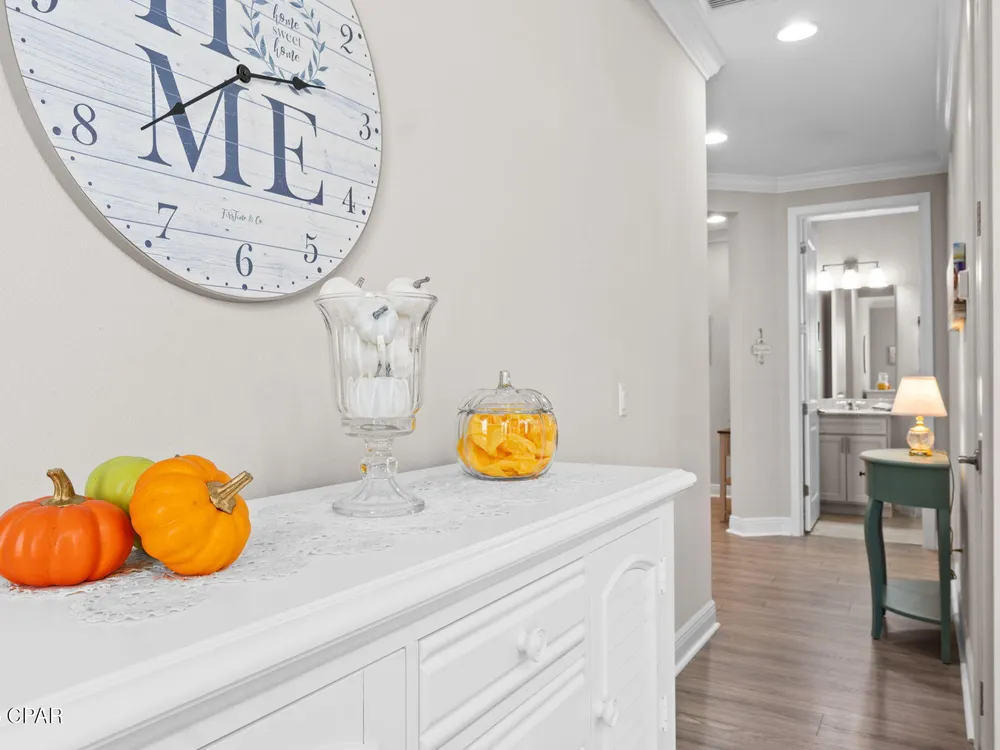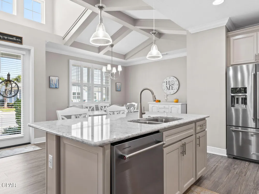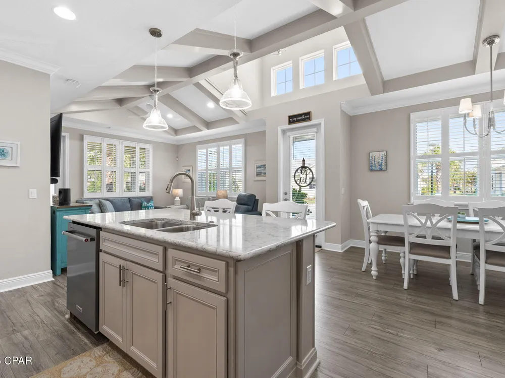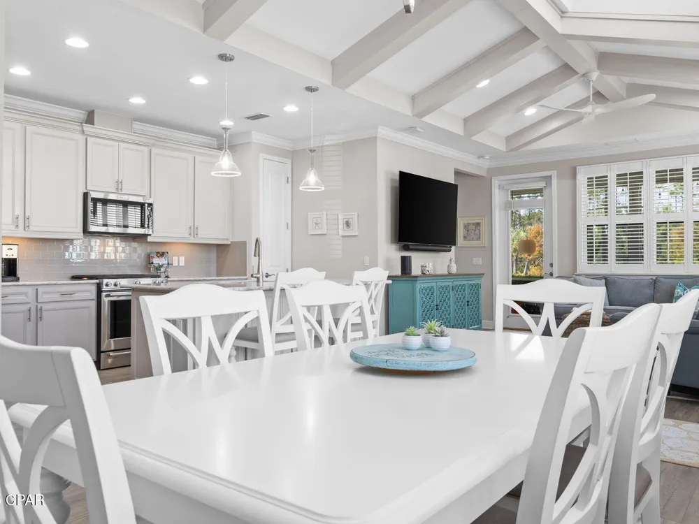 - Beamed Ceilings, Crown Molding, High Ceilings, Kitchen Island, Pantry, Recessed Lighting, Shutters, Smart Thermostat, Window Treatments