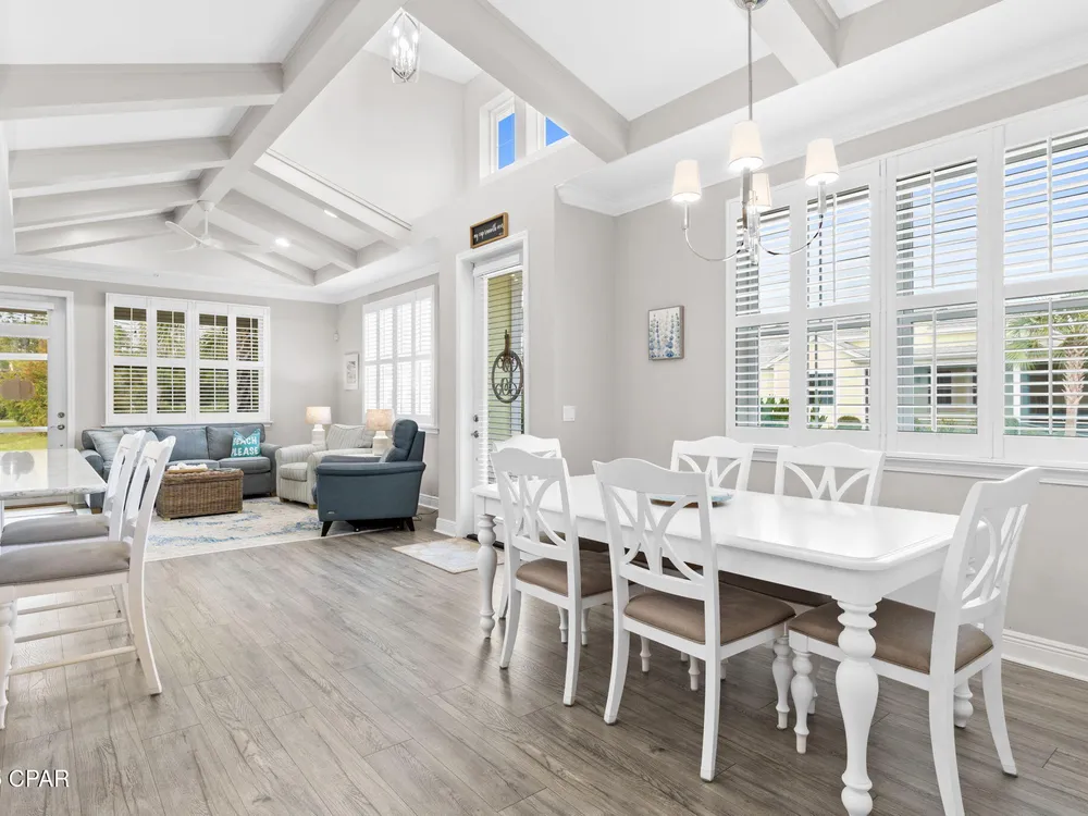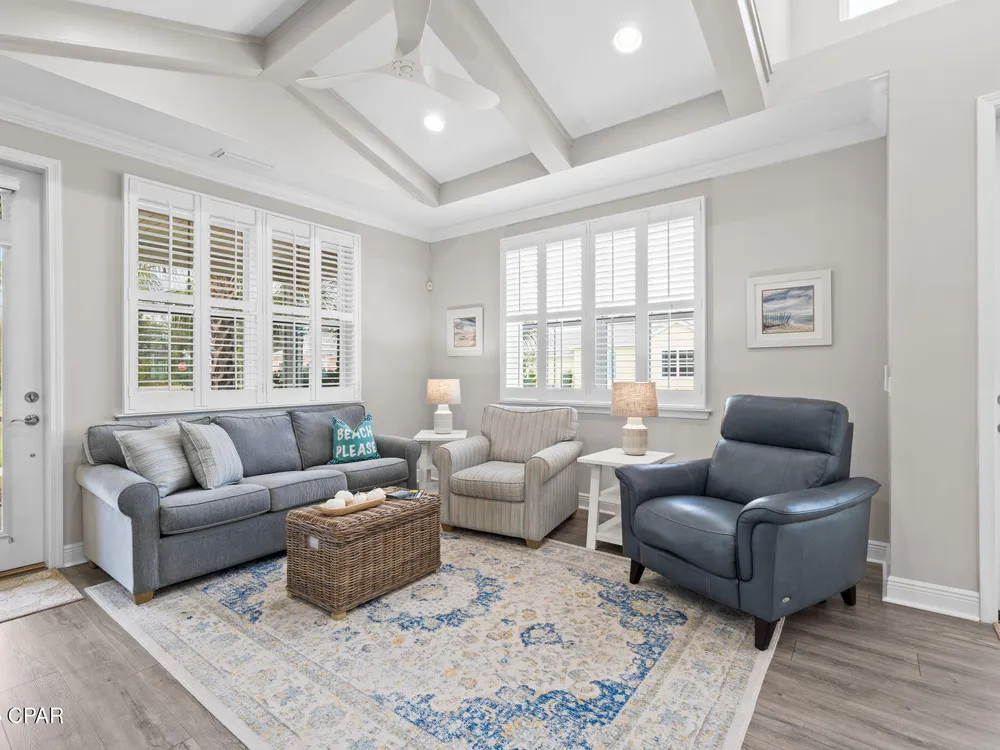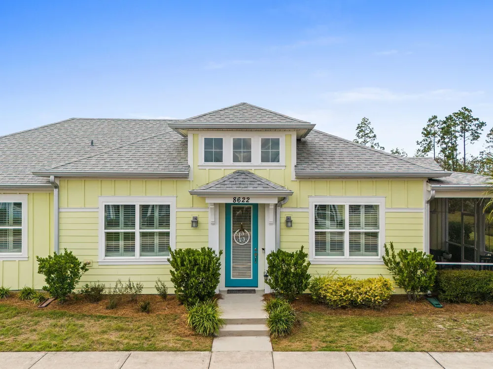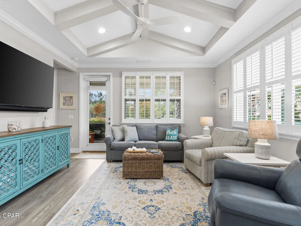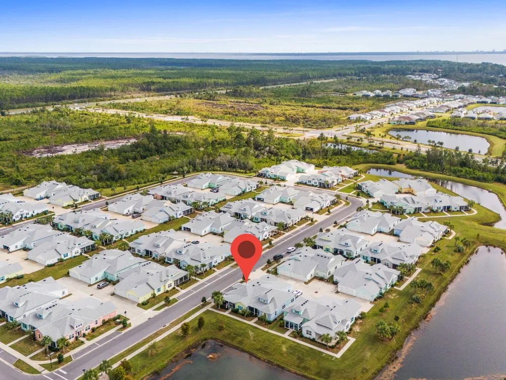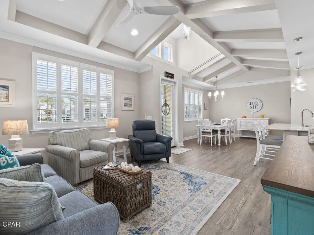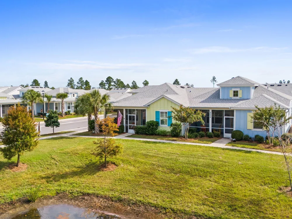 Latitude Margaritaville Watersound! ALOHA COTTAGE, perfectly located in the Phase 2 Cottages which are surrounded by ponds and preserves, its own cottage island oasis! All within walking distance to the amenities! Coastal living at its finest! Rare direct POND lot! Enjoy stunning sunsets and serene pond views from this beautifully upgraded Aloha Cottage in the sought-after Latitude Margaritaville Watersound 55+ coastal community. Step inside to an open-concept floor plan where the living and dining areas flow seamlessly into the chef's kitchen. The kitchen features upgraded 42'' soft-close cabinetry with pull-outs, under-cabinet lighting, quartz countertops, tile backsplash, and stainless KitchenAid appliances—perfect for entertaining or everyday living. The vaulted, beamed ceiling adds volume and character, while crown molding and Revwood by Mohawk laminate flooring carry a sense of quality throughout the home. The primary suite offers relaxing pond views and a luxurious bath with dual vanities, frameless shower enclosure and tile shower, upgraded fixtures, quartz countertops, and a large walk-in closet. The secondary bedroom sits adjacent to its own private tiled bath, and the den/office provides a flexible space for work or hobbies. Unwind on the screened porch overlooking the pond, the perfect spot to take in colorful sunset skies. Additional upgrades include plantation shutters throughout, 8-foot doors, laundry room with cabinetry, and a utility sink in the garage with epoxy-coated garage and porch floors. HOA Dues cover the landscaping, sprinklers, Roof replacement & Exterior repainting on a maintenance schedule, a 10 year Structural Home Buyers warranty from the original buyers close date. This home is being sold with an Icon golf cart, washer/dryer, refrigerator, TVs, and Wi-Fi booster. Furniture may be available for purchase. Enjoy Latitude Margaritaville Watersound's lifestyle with pools, fitness, restaurants, live music, and endless activities at your fingertips. It is more than just a home—it's a lifestyle inspired by fun, relaxation, and community. Residents enjoy world-class amenities designed for endless entertainment, wellness, and social connection, all just a golf cart ride away. Resort-Style Amenities Include: Spectacular Resort Pool Complex with lagoon-style pool and plenty of space for lounging under the Florida sun. Latitude Town Square - the heart of the community with live music, dancing, and year-round entertainment. Fins Up! Fitness Center - fully equipped with state-of-the-art cardio and strength training, plus a variety of fitness classes. Tennis & Pickleball Courts for friendly matches or competitive play. On-Site Restaurant & Bar offering delicious dining and island-inspired cocktails. Walking & Biking Trails winding through scenic preserves and natural beauty. Dog Park & Community Green Spaces perfect for four-legged friends and outdoor gatherings. Planned Social Clubs & Activities that make it easy to meet neighbors and stay active. From poolside afternoons and pickleball games to live music under the stars, Latitude Margaritaville Watersound is designed to deliver the ultimate in 55+ coastal living where every day feels like vacation.