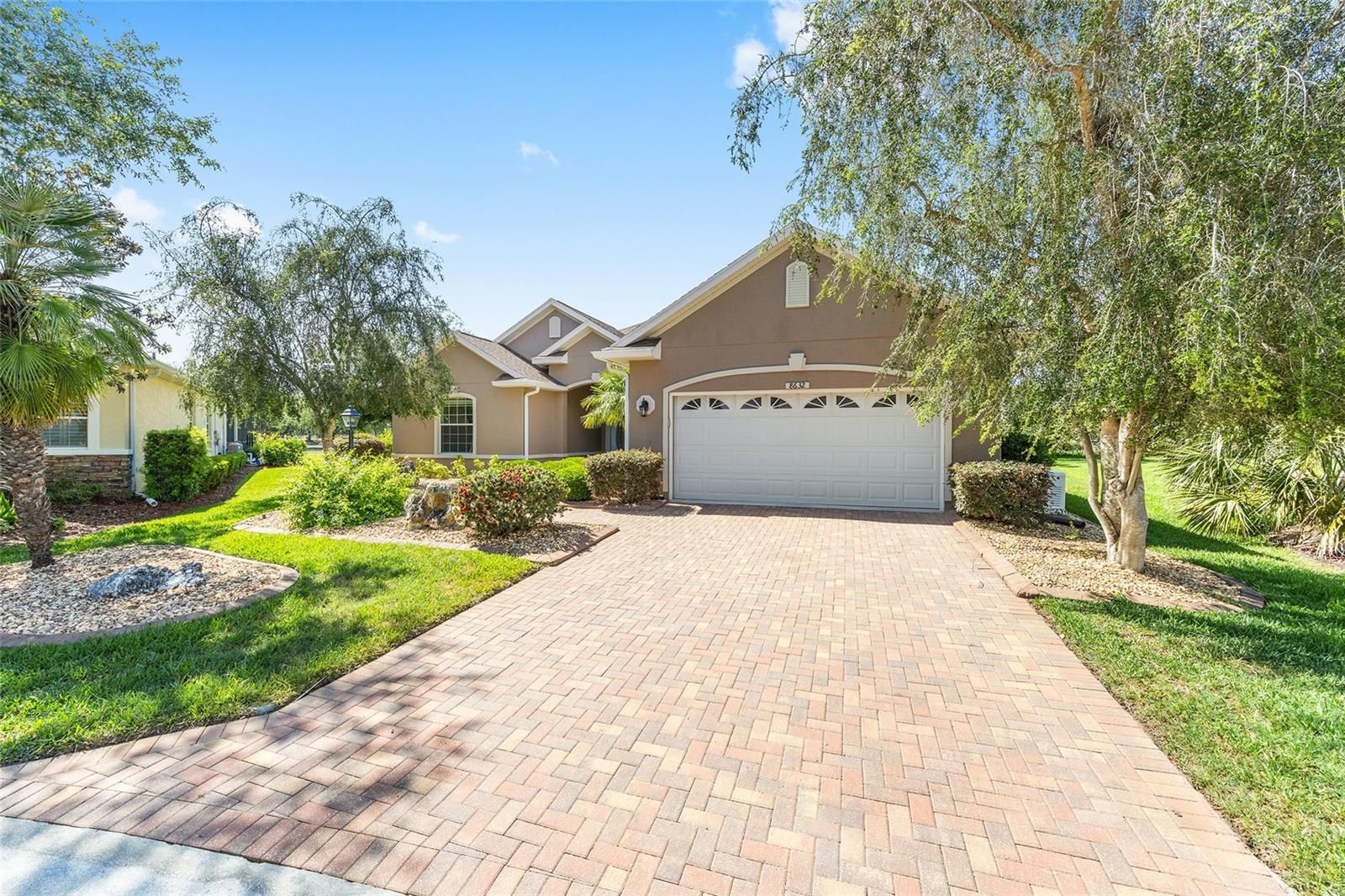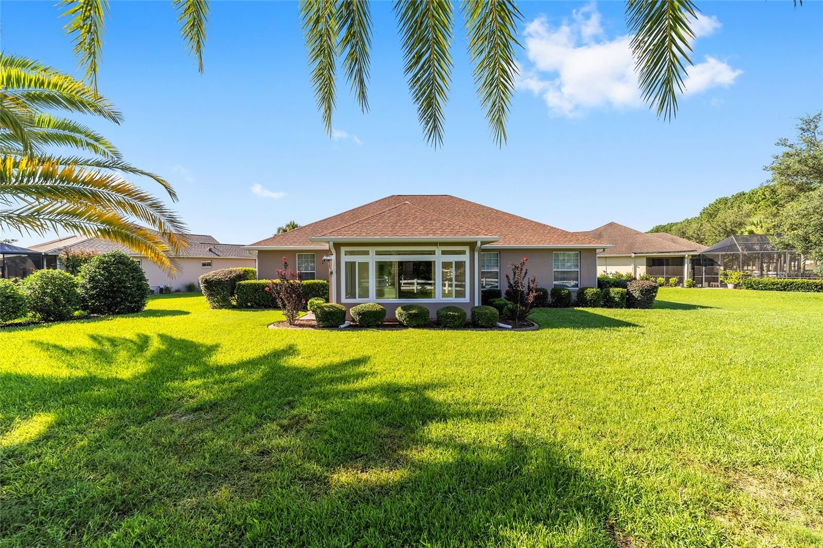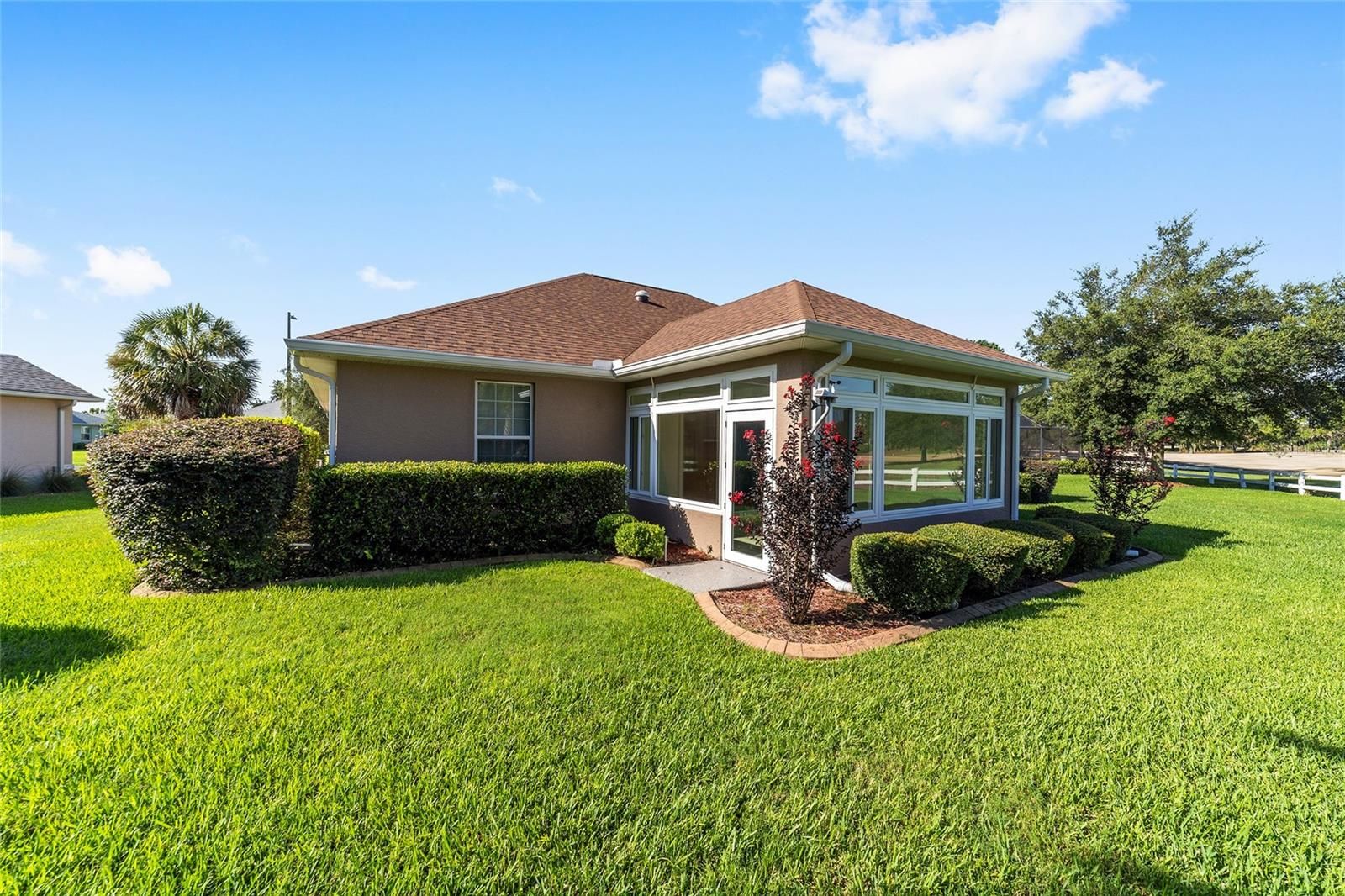 PREMIUM LOT and NO CDD. Garage has AC for your art studio, wood shop or hobby! This expanded Huntley model in Candler Hills East, located on the 11th fairway of Candler Hills Golf Course, has 3 Bedrooms, 2 baths, a 2-car garage and a premium lot with mature landscaping, fresh mulch and ornamental rocks. The lanai was converted to a glass sunroom with sliding windows. The home has many upgrades and features a new roof (2024), new interior paint, new GE stove cooktop, Bosch dishwasher, GE wall oven and garbage disposal plus a new washer and dryer, new 50 gallon hot water heater (2025), new ceiling fans, a mini-split air conditioning unit in the garage (2023), new ceiling lights, new blinds, 5 solar tubes, new AC in 2020, whole house generator installed in 2018, Ecobee thermostat, a built in surround sound system in the living room and luxury vinyl plank flooring in living room and wood plank floors in the 3 bedrooms. The garage floor has been upgraded by Innovative Coatings (2025). This home is in Ocala's premier active 55+ community, On Top of the World. Amenities include exclusive access to the Lodge and Candler Hills Community Center for Candler Hills Residents, as well as the Rec Center and Arbors, swimming, fitness centers, pickleball and tennis courts. Golf cart access to 3 shopping centers. This community is close to shopping, medical offices and hospitals.
