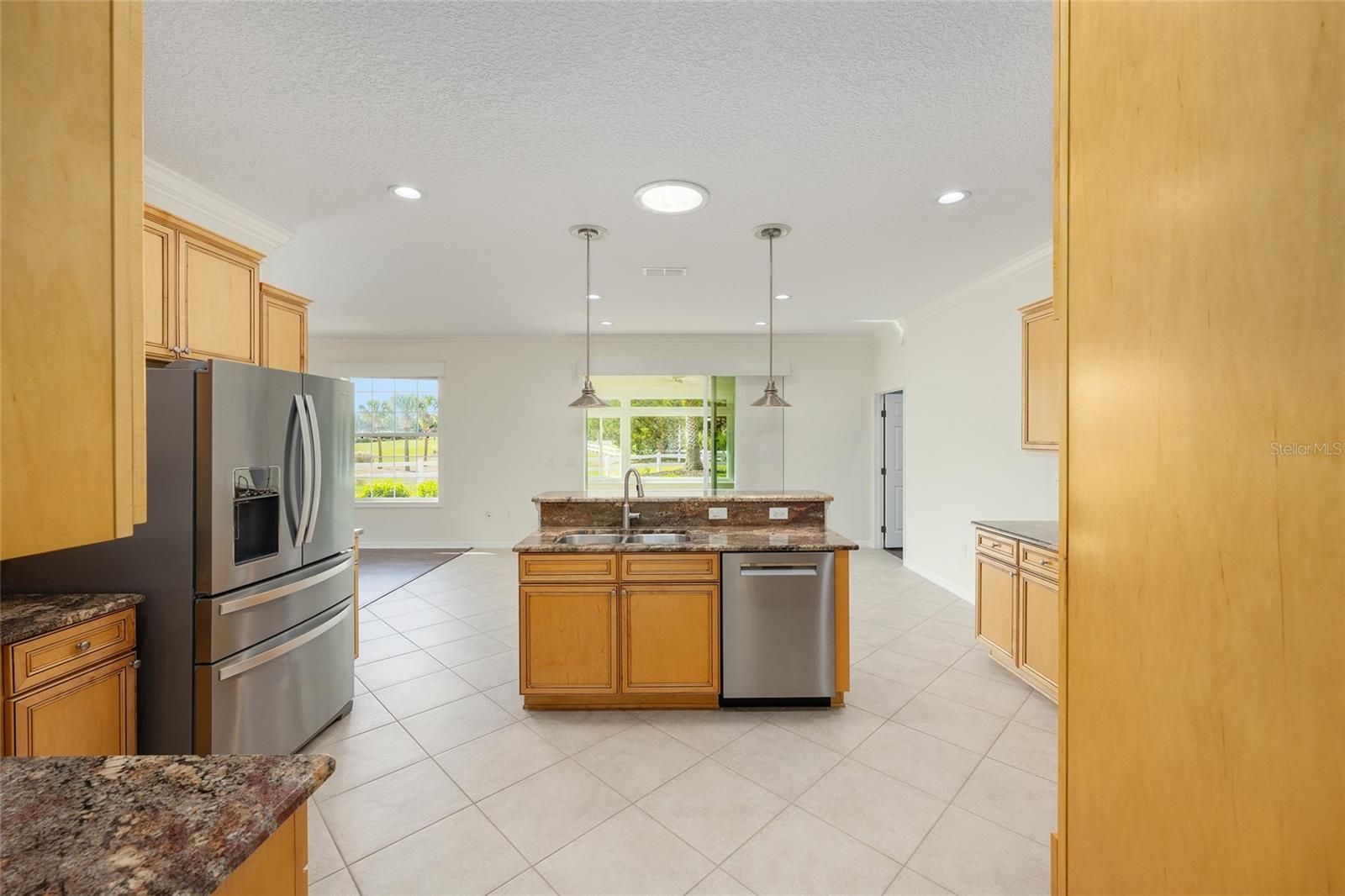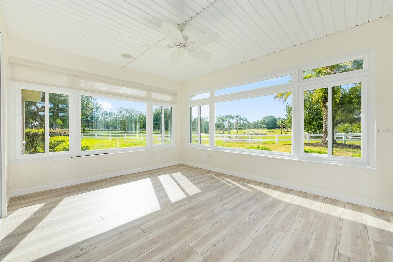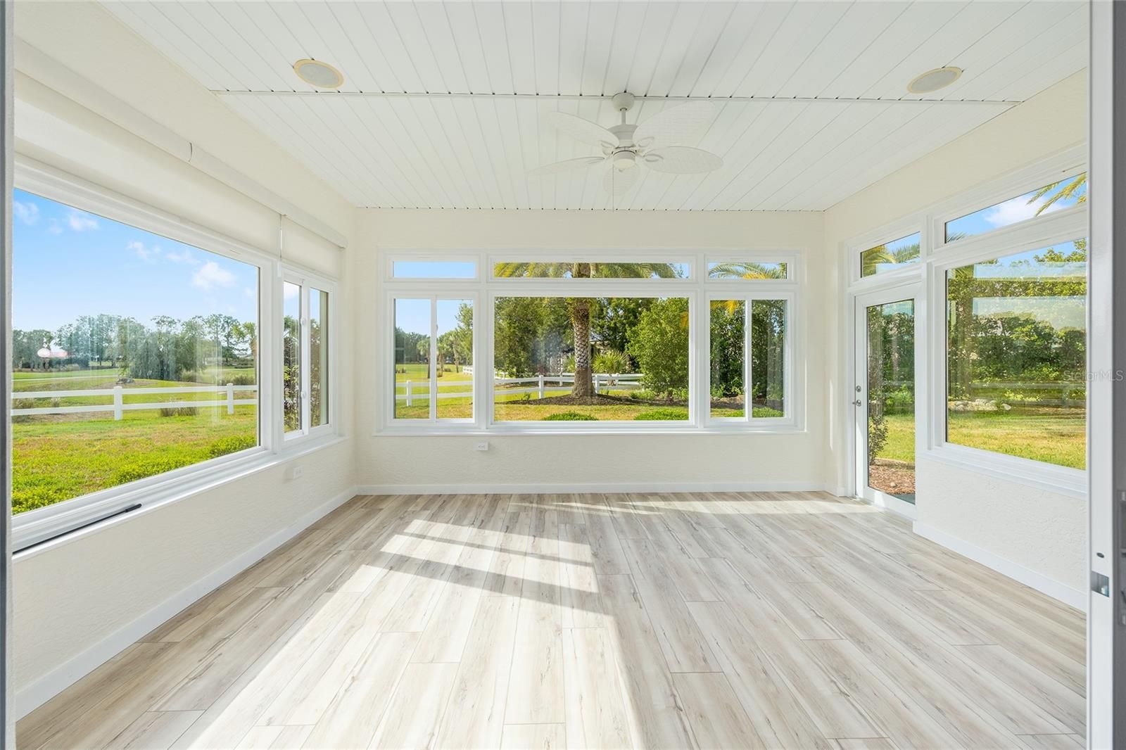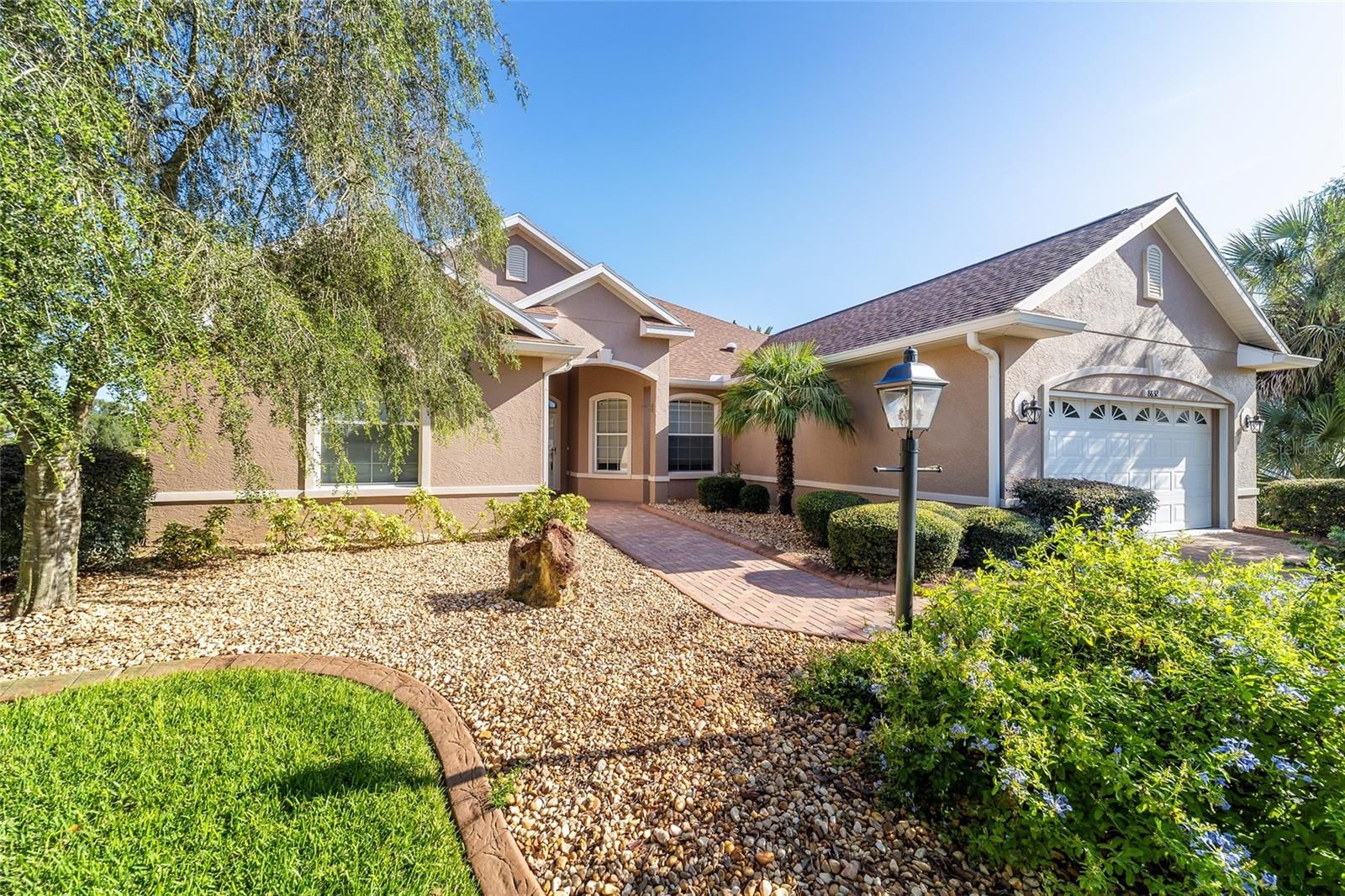PREMIUM LOT and NO CDD. Garage has AC for your art studio, wood shop or hobby! This expanded Huntley model in Candler Hills East, located on the 11th fairway of Candler Hills Golf Course, has 3 Bedrooms, 2 baths, a 2-car garage and a premium lot with mature landscaping, fresh mulch and ornamental rocks. The lanai was converted to a glass sunroom with sliding windows. The home has many upgrades and features a new roof (2024), new interior paint, new GE stove cooktop, Bosch dishwasher, GE wall oven and garbage disposal plus a new washer and dryer, new 50 gallon hot water heater (2025), new ceiling fans, a mini-split air conditioning unit in the garage (2023), new ceiling lights, new blinds, 5 solar tubes, new AC in 2020, whole house generator installed in 2018, Ecobee thermostat, a built in surround sound system in the living room and luxury vinyl plank flooring in living room and wood plank floors in the 3 bedrooms. The garage floor has been upgraded by Innovative Coatings (2025). This home is in Ocala's premier active 55+ community, On Top of the World. Amenities include exclusive access to the Lodge and Candler Hills Community Center for Candler Hills Residents, as well as the Rec Center and Arbors, swimming, fitness centers, pickleball and tennis courts. Golf cart access to 3 shopping centers. This community is close to shopping, medical offices and hospitals.