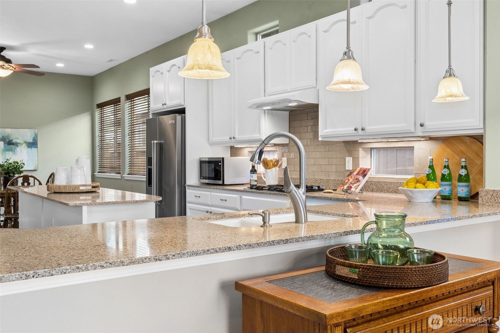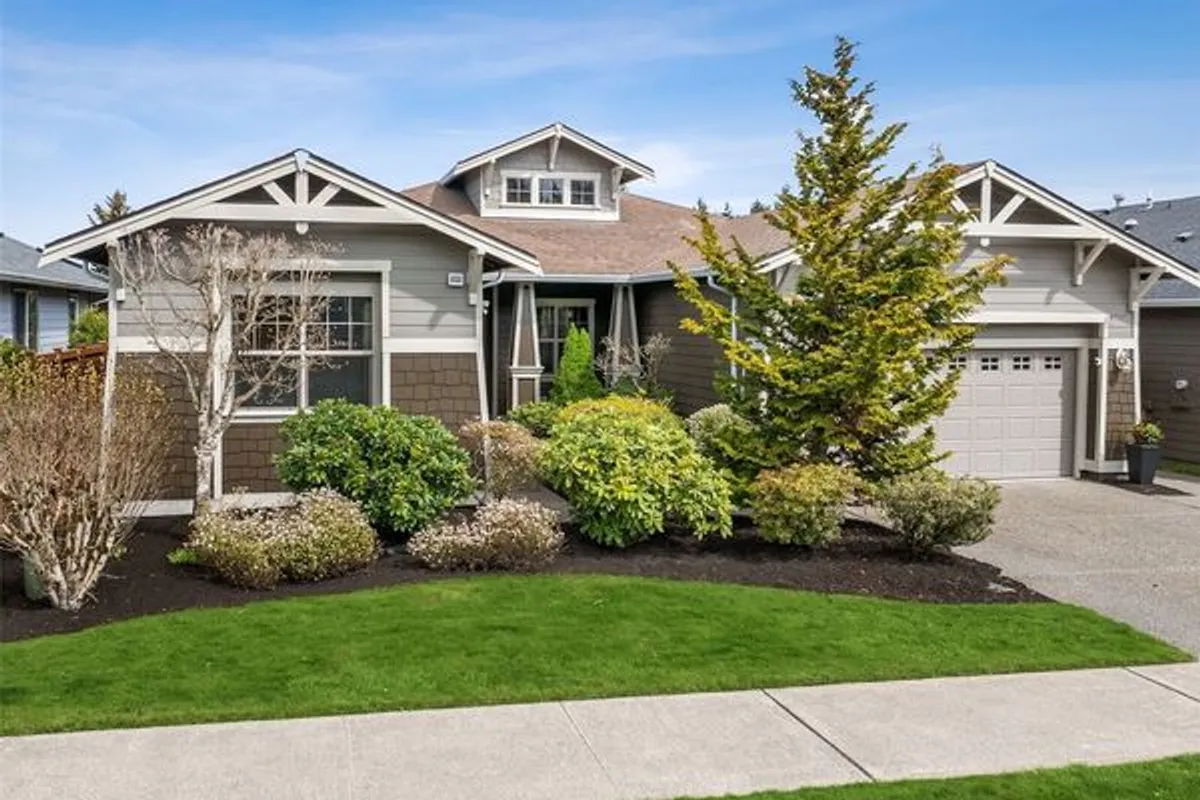 Elegant, timeless, and classic Canterwood floorplan ideally located near the Lodge and community amenities in the highly regarded Jubilee 55+ active adult community. Meticulously maintained by its original owner, this residence is beautifully positioned on a golf course lot with fully fenced and landscaped backyard. Custom built-ins thoughtfully frame the fireplace, anchor the dining area, and enhance the office, creating a cohesive and sophisticated interior. The well-designed layout offers exceptional separation between the spacious primary suite and guest wing. The open-concept kitchen is both functional and refined, featuring gleaming quartz counters, subway tile backsplash, gas range with hood vent, wall oven, stainless steel appliances, refrigerator (1 yr), dishwasher (18 mo), pull-out cabinetry, under-cabinet lighting, recipe windows, generous storage, and a large pantry. The expansive living area is well-suited for everyday living and entertaining, opening to a generous covered patio with golf course views. Additional features include tile entry, Olympic wood blinds, new slider blinds, ceiling fans, French doors, sprinkler system front and back, exterior paint within 2 years, and garage built-ins with workbench and new opener (Dec 2025). Conveniently located near Jubilee Lodge, community trails, Hawks Prairie shopping and dining, Costco, and I-5 access. Ask your agent for full list of special features.