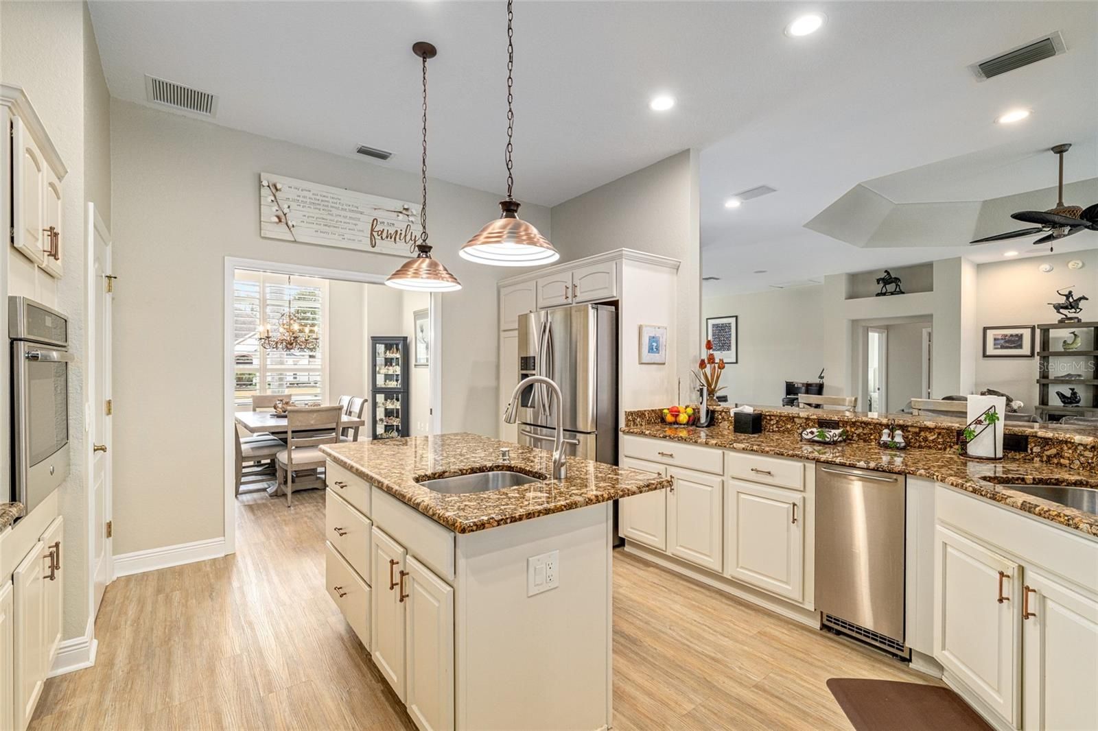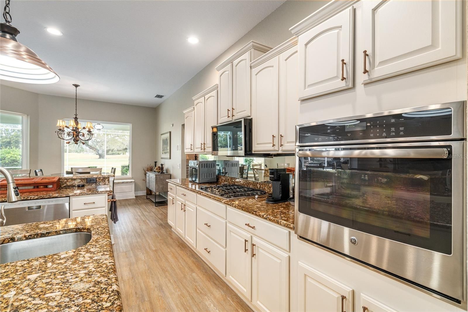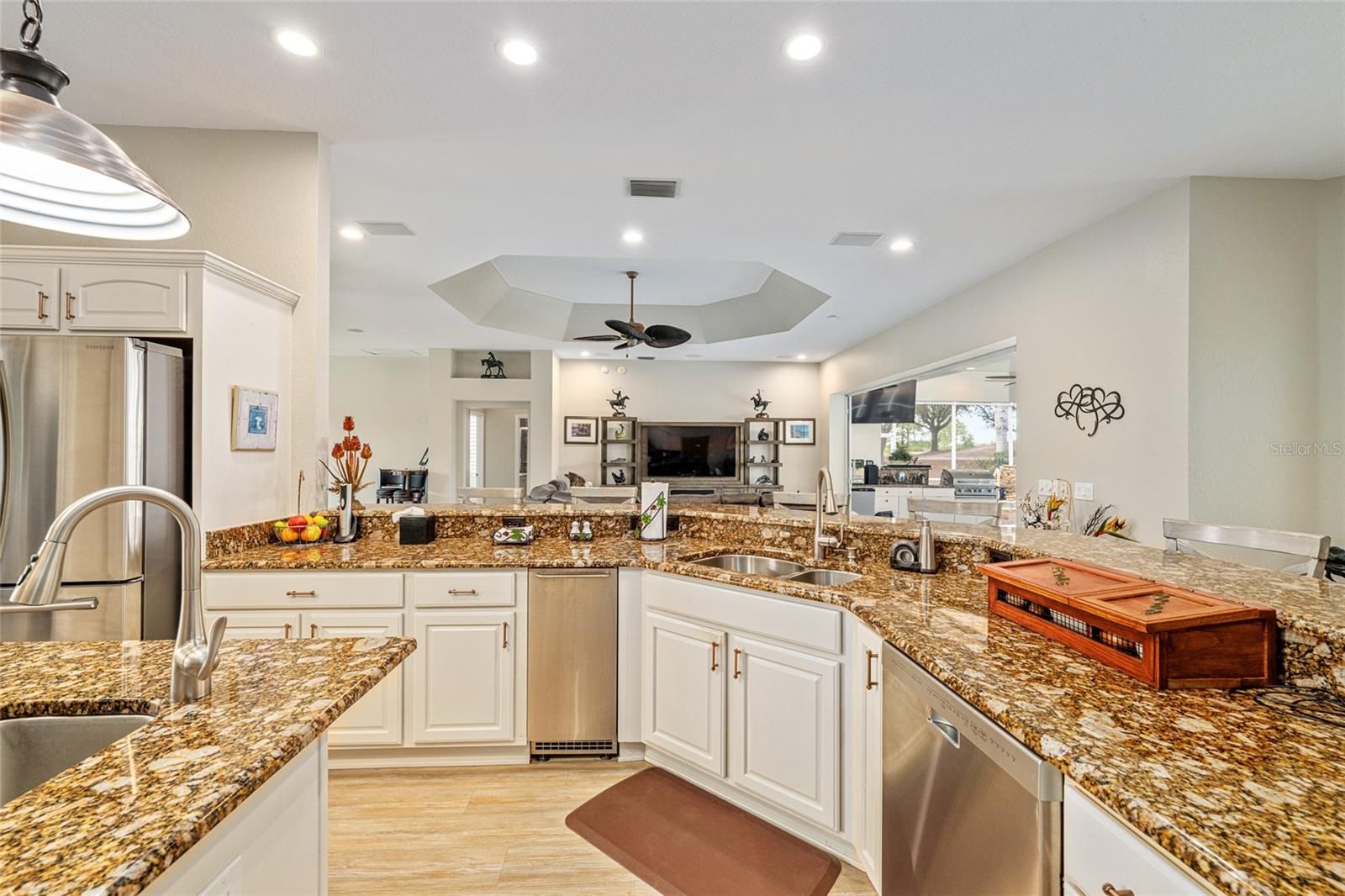BOND PAID! Stunning Sanibel Premier with spectacular pool, spa, and summer kitchen overlooking the Championship Nancy Lopez Golf Course in the highly sought-after Village of Royal Oak at Springdale! Tucked away on a quiet cul-de-sac, this exceptional home offers outstanding curb appeal with a stamped driveway and walkway, upgraded landscaping, and elegant leaded glass front door with sidelights. Inside, you’ll find beautiful new vinyl planking flowing through the foyer, living and dining rooms, kitchen, laundry, hallways, and baths, with vinyl planking flooring in the guest bedrooms, and engineered wood flooring in the primary bedroom The spacious open kitchen is truly a showpiece featuring: • White bay stair-step cabinetry with crown molding • Granite countertops • New stainless appliances • Wall oven and gas cooktop • Pot drawers and pull-out pantry shelving • Separate ice maker • Under- and over-cabinet lighting • Center island with pendant lighting The casual dining area offers charming custom window seats and peaceful views of the pool. The living room opens seamlessly with stack-back sliding glass doors to your private outdoor oasis — a gorgeous heated pool and spa with stunning water feature, resurfaced in 2019, along with newer LED lighting, pool pump, and gas heater. The fully equipped summer kitchen and expansive birdcage enclosure make this the perfect space for entertaining while enjoying sweeping golf course views. Just outside the enclosure, a paved side patio with privacy hedge creates an additional serene retreat. The oversized primary suite features a tray ceiling, wall-mounted TV, and a luxurious en-suite bath with dual sinks, garden tub, Roman shower, private water closet, and a huge walk-in closet. Guest accommodations are equally impressive: • Front guest room with plantation shutters (featured across the front of the home) • Expanded second guest room with sliding glass doors to the pool and a queen-size Murphy bed • Guest bath with solar tube, tile-surround tub/shower, and new walk in shower. The laundry room includes built-in sink, additional cabinetry, newer washer and dryer, and open shelving. Car enthusiasts and hobbyists will appreciate the expanded 2-car garage plus golf cart garage with epoxy flooring, workbench, storage closet, and incredible overhead storage accessed by a 250-lb capacity electric freight elevator and electric attic stairs. Additional premium features include: • Surround sound in living area and lanai • HVAC with surge protection • Whole-house water filtration system and water softener • Three solar attic fans • Lightning protection system • Hidden dog fence surrounding the property This is truly an exceptional, meticulously upgraded home in one of The Villages’ most desirable golf-front locations. And yes… THE BOND IS PAID!