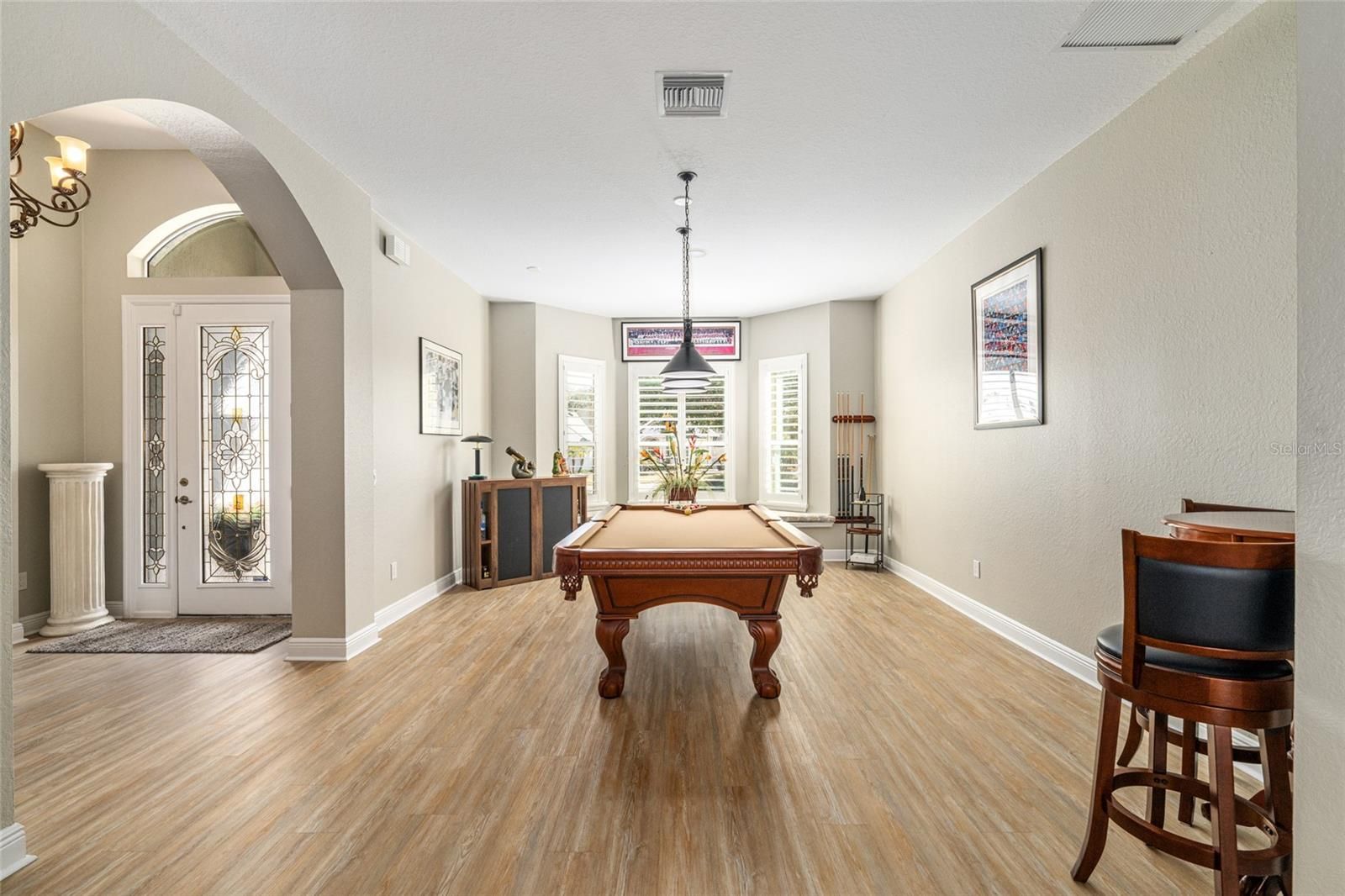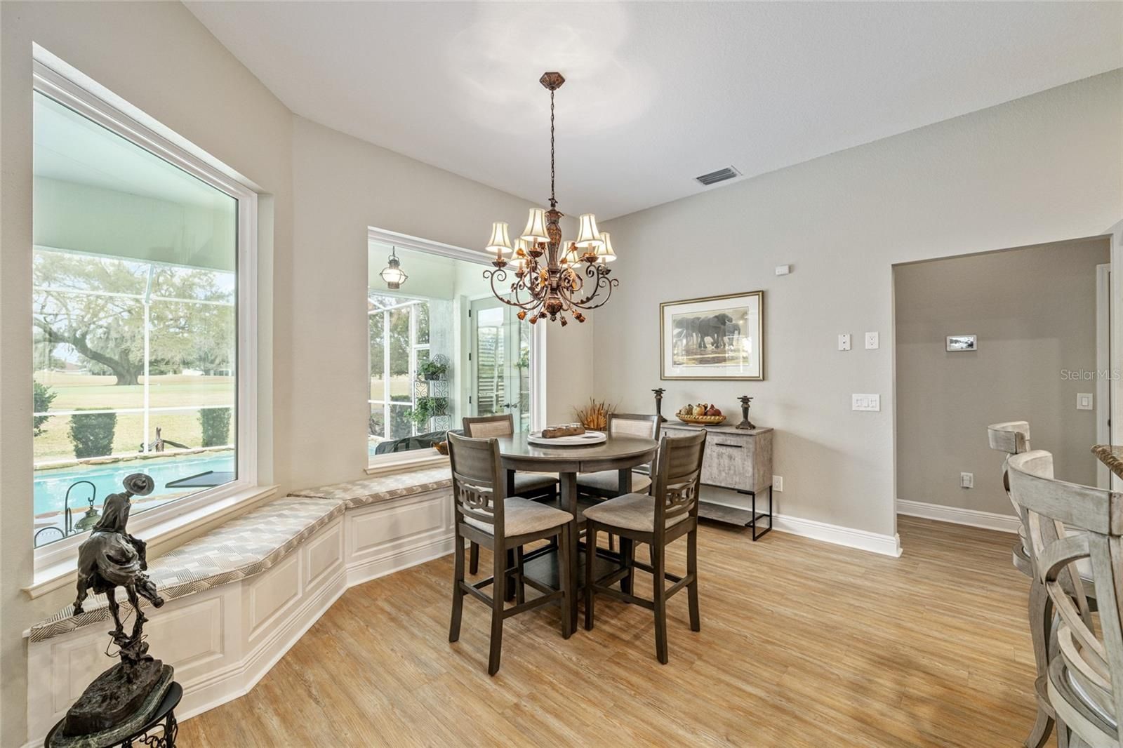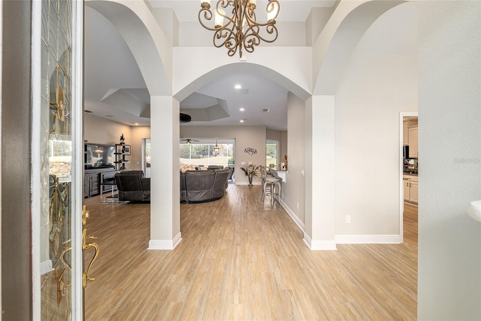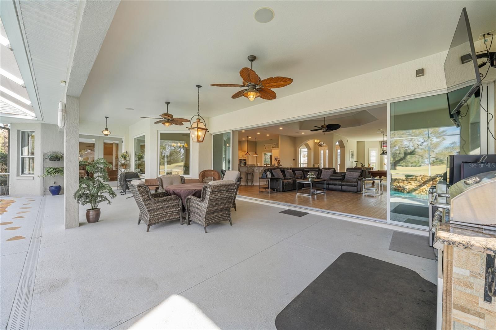 BOND PAID! Stunning Sanibel Premier with spectacular pool, spa, and summer kitchen overlooking the Championship Nancy Lopez Golf Course in the highly sought-after Village of Royal Oak at Springdale! Tucked away on a quiet cul-de-sac, this exceptional home offers outstanding curb appeal with a stamped driveway and walkway, upgraded landscaping, and elegant leaded glass front door with sidelights. Inside, you’ll find beautiful new vinyl planking flowing through the foyer, living and dining rooms, kitchen, laundry, hallways, and baths, with vinyl planking flooring in the guest bedrooms, and engineered wood flooring in the primary bedroom The spacious open kitchen is truly a showpiece featuring: • White bay stair-step cabinetry with crown molding • Granite countertops • New stainless appliances • Wall oven and gas cooktop • Pot drawers and pull-out pantry shelving • Separate ice maker • Under- and over-cabinet lighting • Center island with pendant lighting The casual dining area offers charming custom window seats and peaceful views of the pool. The living room opens seamlessly with stack-back sliding glass doors to your private outdoor oasis — a gorgeous heated pool and spa with stunning water feature, resurfaced in 2019, along with newer LED lighting, pool pump, and gas heater. The fully equipped summer kitchen and expansive birdcage enclosure make this the perfect space for entertaining while enjoying sweeping golf course views. Just outside the enclosure, a paved side patio with privacy hedge creates an additional serene retreat. The oversized primary suite features a tray ceiling, wall-mounted TV, and a luxurious en-suite bath with dual sinks, garden tub, Roman shower, private water closet, and a huge walk-in closet. Guest accommodations are equally impressive: • Front guest room with plantation shutters (featured across the front of the home) • Expanded second guest room with sliding glass doors to the pool and a queen-size Murphy bed • Guest bath with solar tube, tile-surround tub/shower, and new walk in shower. The laundry room includes built-in sink, additional cabinetry, newer washer and dryer, and open shelving. Car enthusiasts and hobbyists will appreciate the expanded 2-car garage plus golf cart garage with epoxy flooring, workbench, storage closet, and incredible overhead storage accessed by a 250-lb capacity electric freight elevator and electric attic stairs. Additional premium features include: • Surround sound in living area and lanai • HVAC with surge protection • Whole-house water filtration system and water softener • Three solar attic fans • Lightning protection system • Hidden dog fence surrounding the property This is truly an exceptional, meticulously upgraded home in one of The Villages’ most desirable golf-front locations. And yes… THE BOND IS PAID!