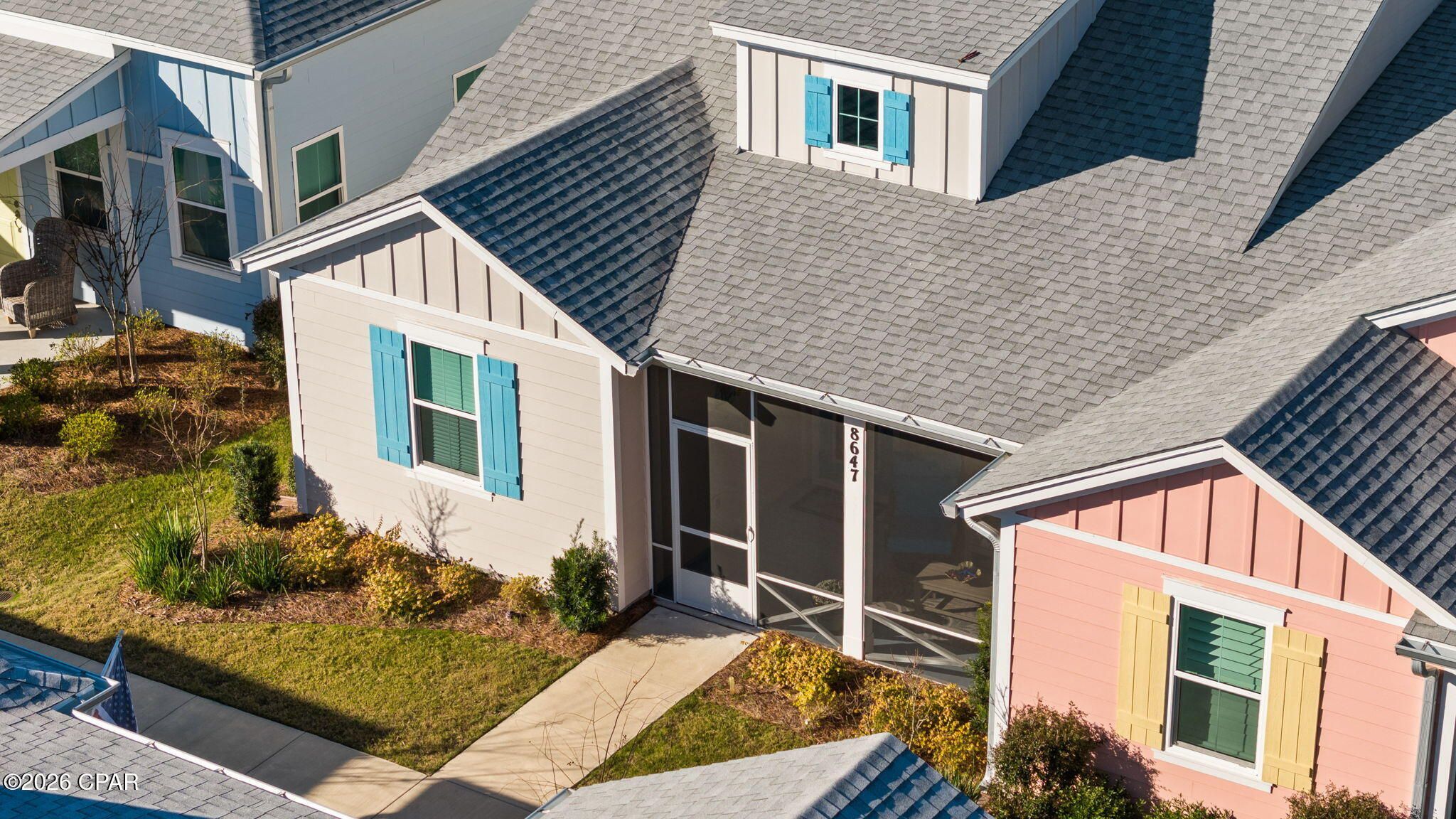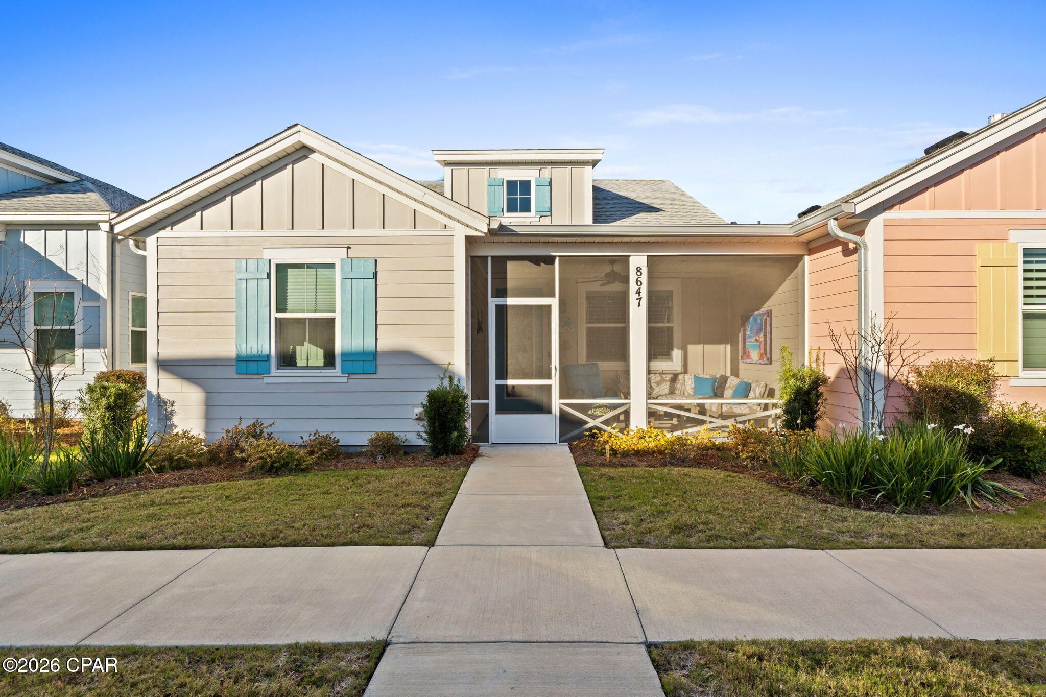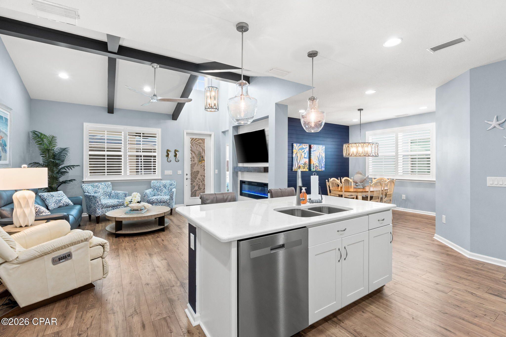 Welcome to this beautifully upgraded Camellia Cottage located in sought-after, close-in Phase 4 of Latitude Margaritaville Watersound—just steps from a picturesque pond with breathtaking sunset views. Meticulously maintained and thoughtfully designed, this home offers the perfect blend of comfort, style, and resort-style living. The light-filled great room features a vaulted ceiling with custom beams and a stunning custom built-in electric fireplace with shiplap surround, creating a warm and inviting space for relaxing or entertaining. The gourmet kitchen is a showstopper, boasting Level 4 cabinetry, Level 3 quartz countertops, a large island with custom shiplap, coffee bar, pot drawers, and pull-out shelving—perfect for both everyday living and hosting guests. A spacious dining area with a custom shiplap feature wall provides the ideal setting for gatherings. This home is enhanced with custom lighting and ceiling fans throughout, plantation shutters and designer shades, and Revwood by Mohawk laminate flooring throughout the entire home, offering durability and coastal style. The primary suite includes an upgraded en-suite bath, while the laundry room is complete with added cabinetry for extra storage. Enjoy Florida living year-round on the screened porch with a painted floor, ideal for morning coffee or evening sunsets. Additional features include washer, dryer, and refrigerator conveying, a 10-year structural warranty, and impeccable care throughout the home. Latitude Margaritaville Watersound amenities include a vibrant Town Square, 2-story private restaurant, resort-style pool, state-of-the-art fitness center with an indoor lap-pool, pickleball and tennis courts, walking and biking trails, live music, clubs and social activities. Conveniently located near shopping, dining, medical facilities, and only 7 miles from the sugar-white sands of the Emerald Coast, this home offers an unmatched 55+ active-adult lifestyle. Come experience the Latitude Margaritaville lifestyle—where every day feels like a vacation.