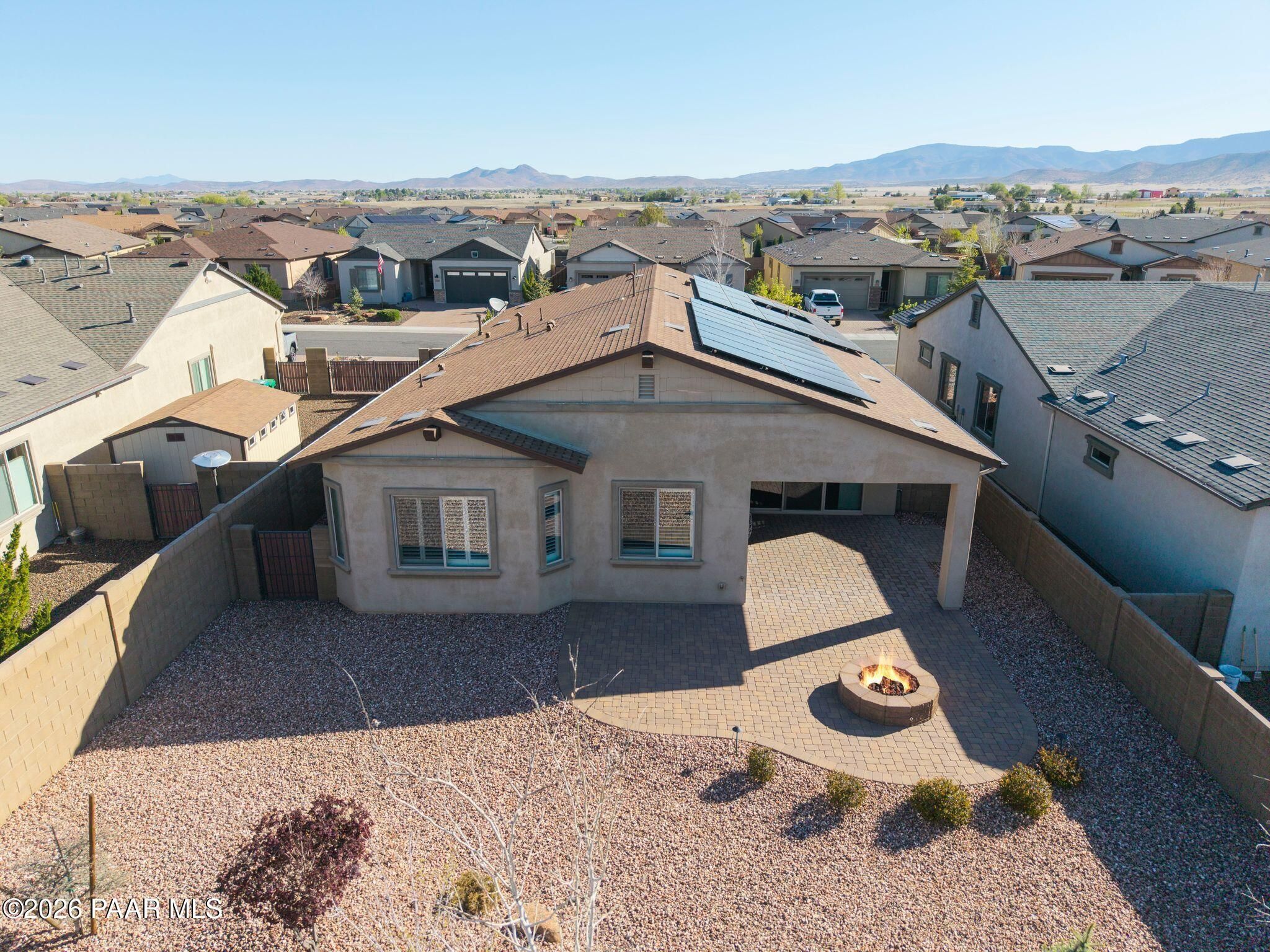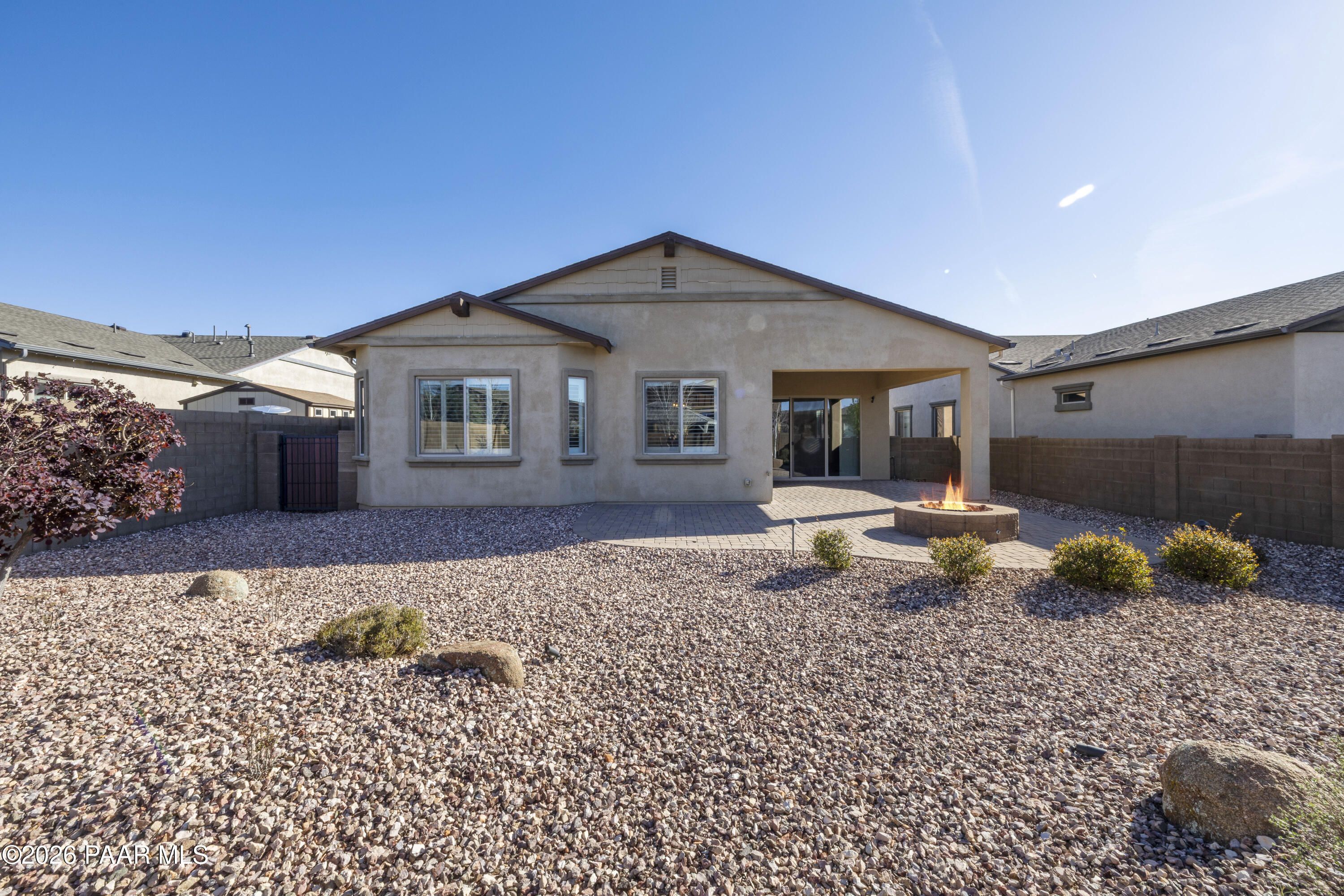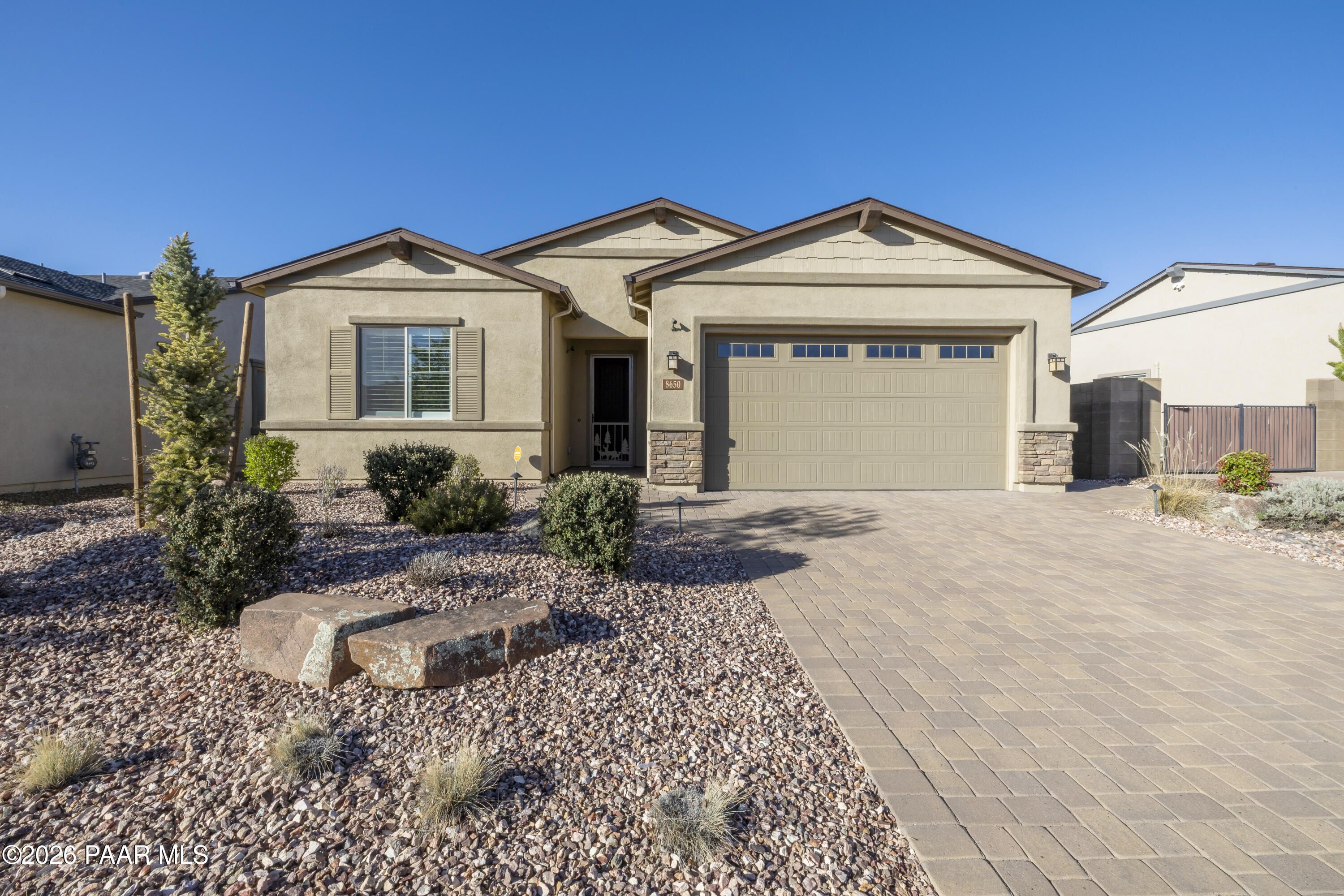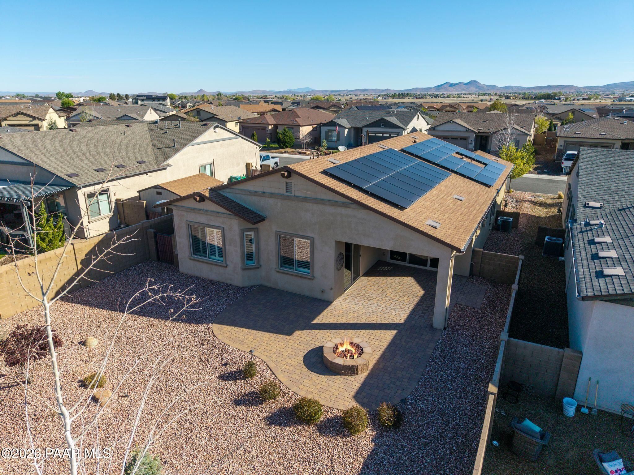 Tucked within the sought-after Pronghorn Ranch community, this 2019-built residence offers a refined blend of comfort, efficiency, and low-maintenance living.Thoughtfully designed for ease and everyday enjoyment, this 2-bedroom, 2-bath home features 1,943 square feet of well-appointed space with luxury vinyl tile flooring throughout and an open, inviting layout. The kitchen is both functional and polished, showcasing quartz countertops, a spacious island, tile backsplash across two walls, built-in desk, and under-cabinet lighting.The primary suite is a quiet retreat with a beautifully tiled walk-in shower featuring a pebbled floor and an expansive walk-in closet. A dedicated den/office with custom built-in cabinetry and shelving offers flexibility for work or hobbies.Step outside to a covered patio with an outdoor fireplace--perfect for entertaining and enjoying Prescott Valley's crisp evenings--while the fully landscaped and fenced backyard provides privacy and ease. Additional highlights include an epoxy-coated garage floor, laundry room with utility sink, gas fireplace in the living room, and solar panels ensuring a tiny electric bill and monthly credits at times.Residents of Pronghorn Ranch enjoy access to a clubhouse, fitness center, pool and spa, tennis courts, and more--creating a lifestyle that's both active and relaxed.A quietly exceptional home designed for those who appreciate quality, comfort, and simplicity.