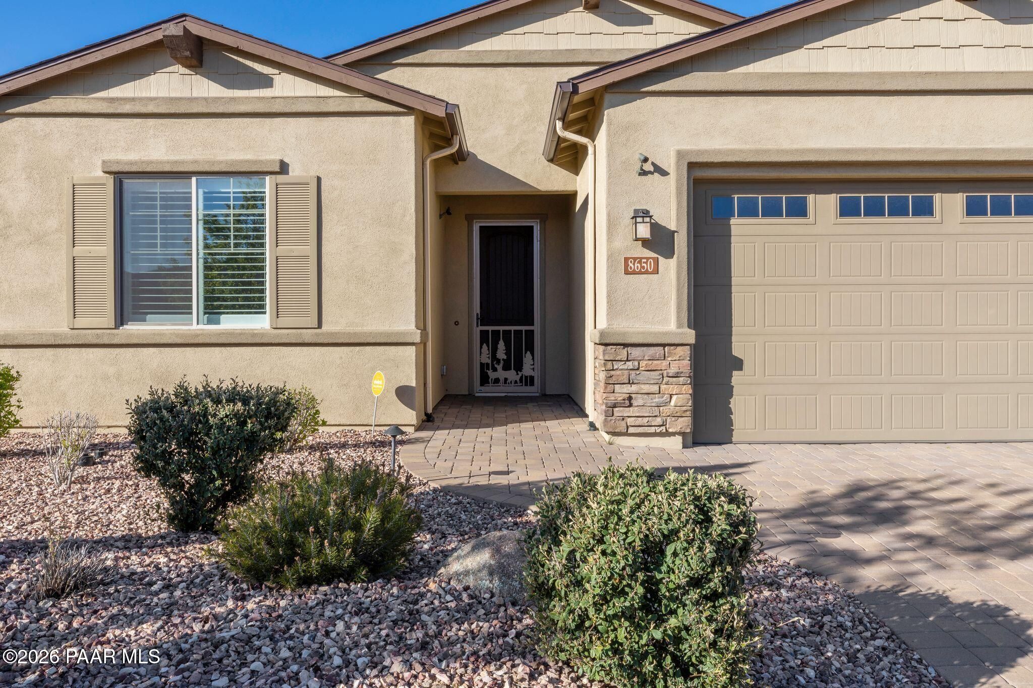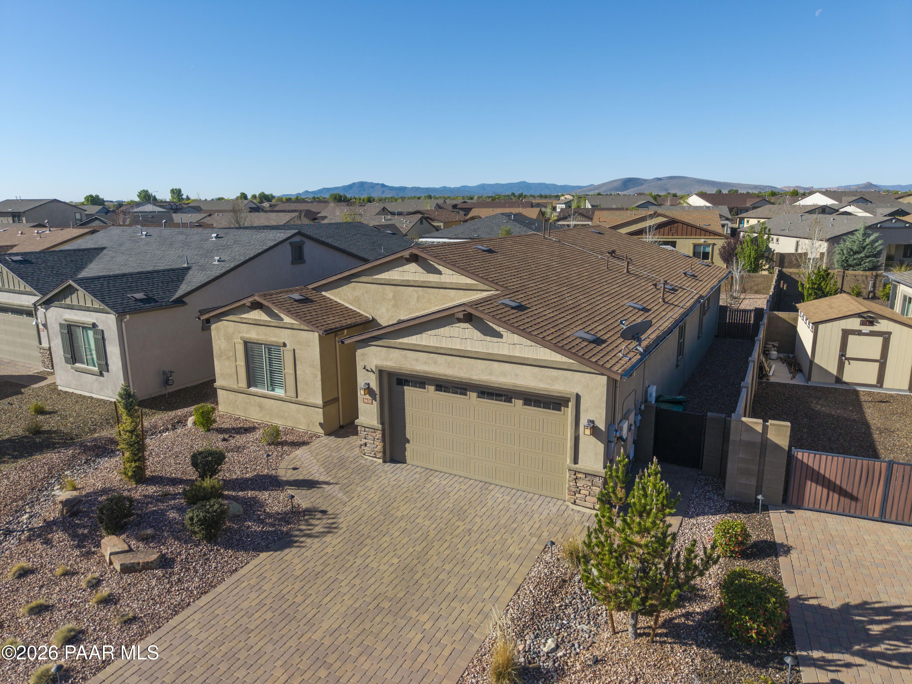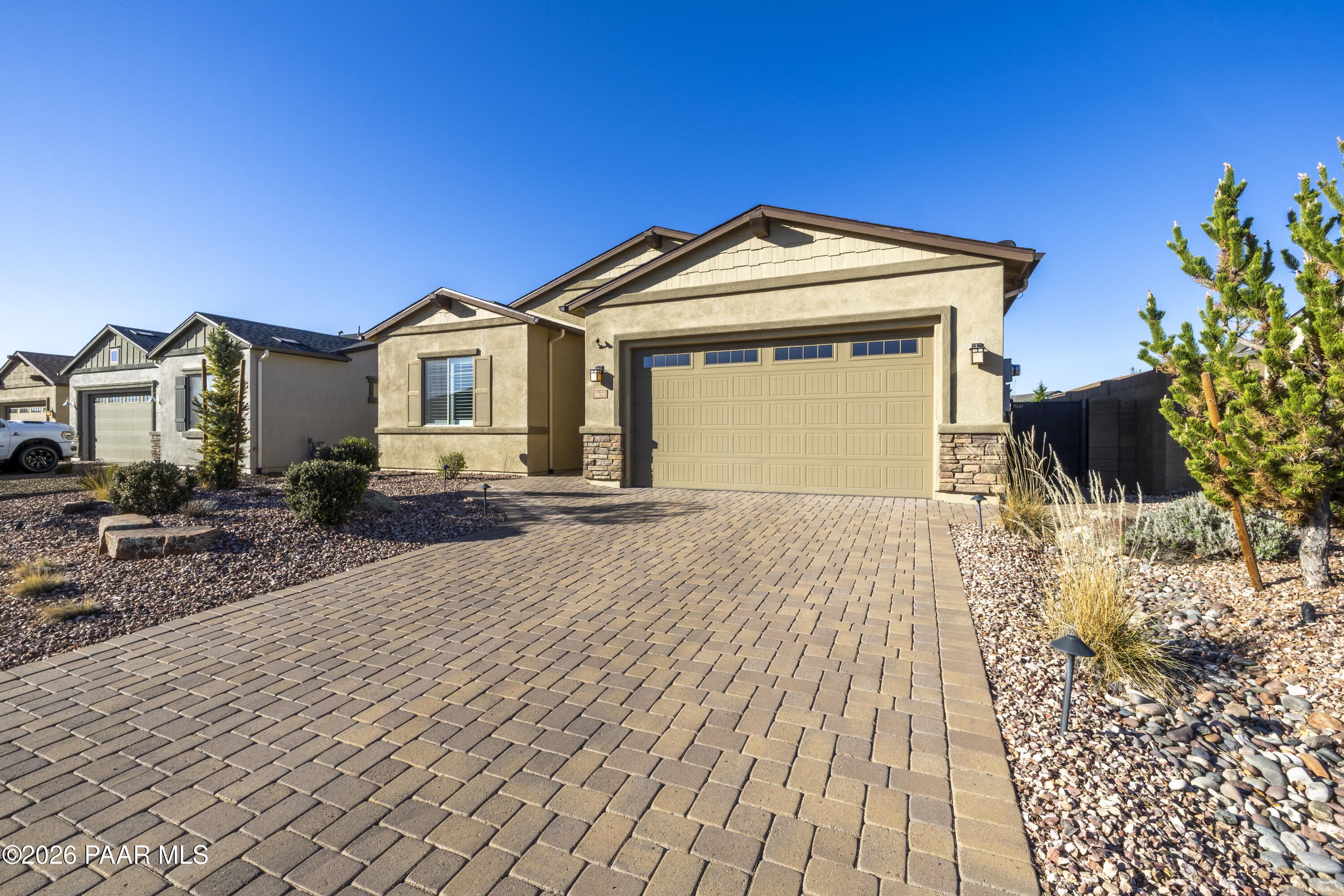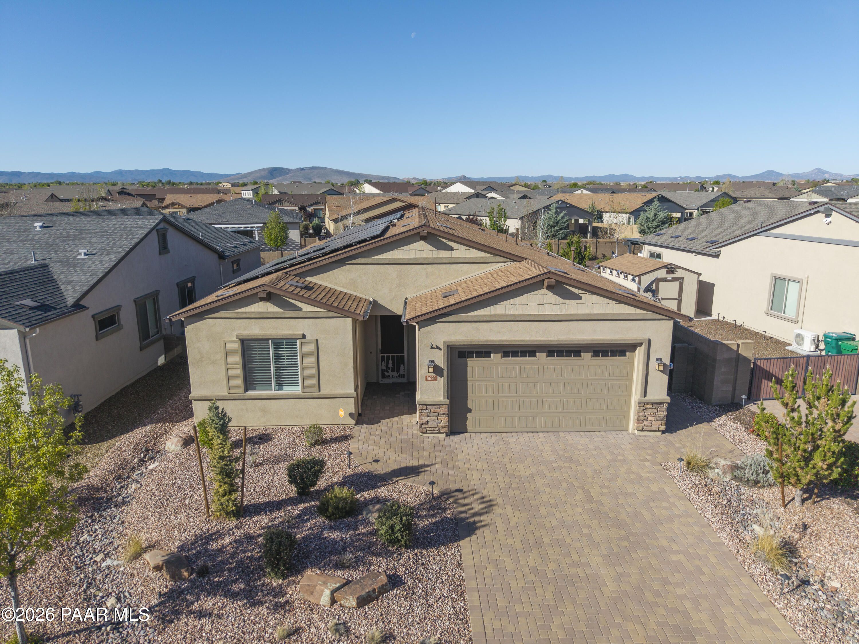 Tucked within the sought-after Pronghorn Ranch community, this 2019-built residence offers a refined blend of comfort, efficiency, and low-maintenance living.Thoughtfully designed for ease and everyday enjoyment, this 2-bedroom, 2-bath home features 1,943 square feet of well-appointed space with luxury vinyl tile flooring throughout and an open, inviting layout. The kitchen is both functional and polished, showcasing quartz countertops, a spacious island, tile backsplash across two walls, built-in desk, and under-cabinet lighting.The primary suite is a quiet retreat with a beautifully tiled walk-in shower featuring a pebbled floor and an expansive walk-in closet. A dedicated den/office with custom built-in cabinetry and shelving offers flexibility for work or hobbies.Step outside to a covered patio with an outdoor fireplace--perfect for entertaining and enjoying Prescott Valley's crisp evenings--while the fully landscaped and fenced backyard provides privacy and ease. Additional highlights include an epoxy-coated garage floor, laundry room with utility sink, gas fireplace in the living room, and solar panels ensuring a tiny electric bill and monthly credits at times.Residents of Pronghorn Ranch enjoy access to a clubhouse, fitness center, pool and spa, tennis courts, and more--creating a lifestyle that's both active and relaxed.A quietly exceptional home designed for those who appreciate quality, comfort, and simplicity.