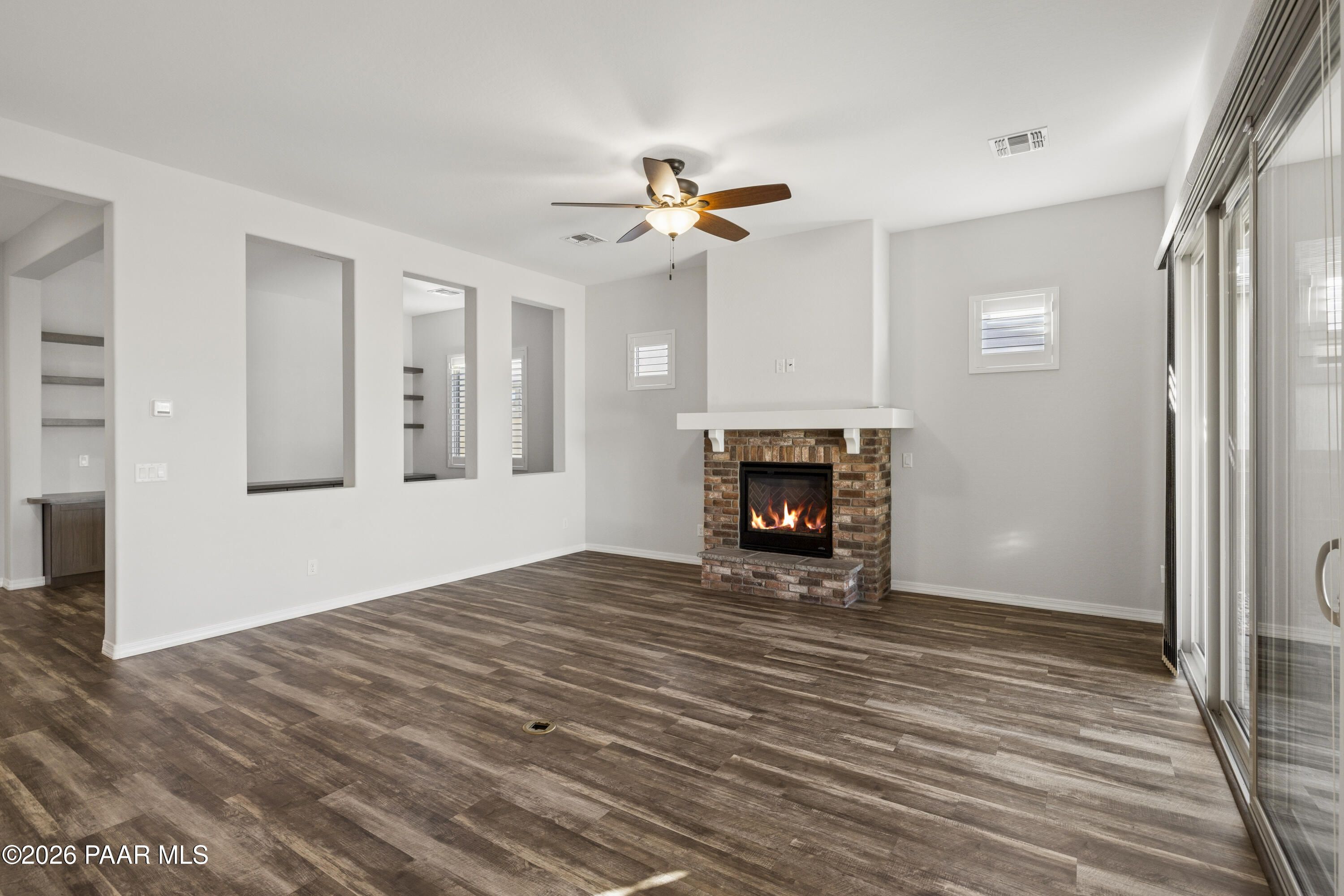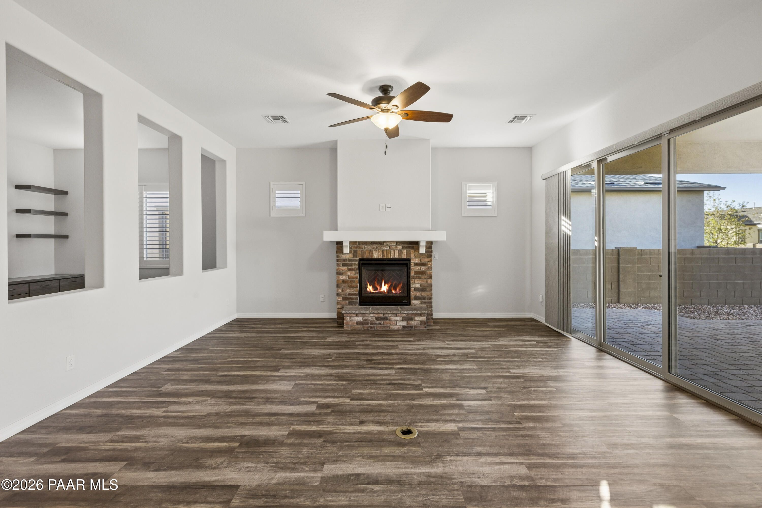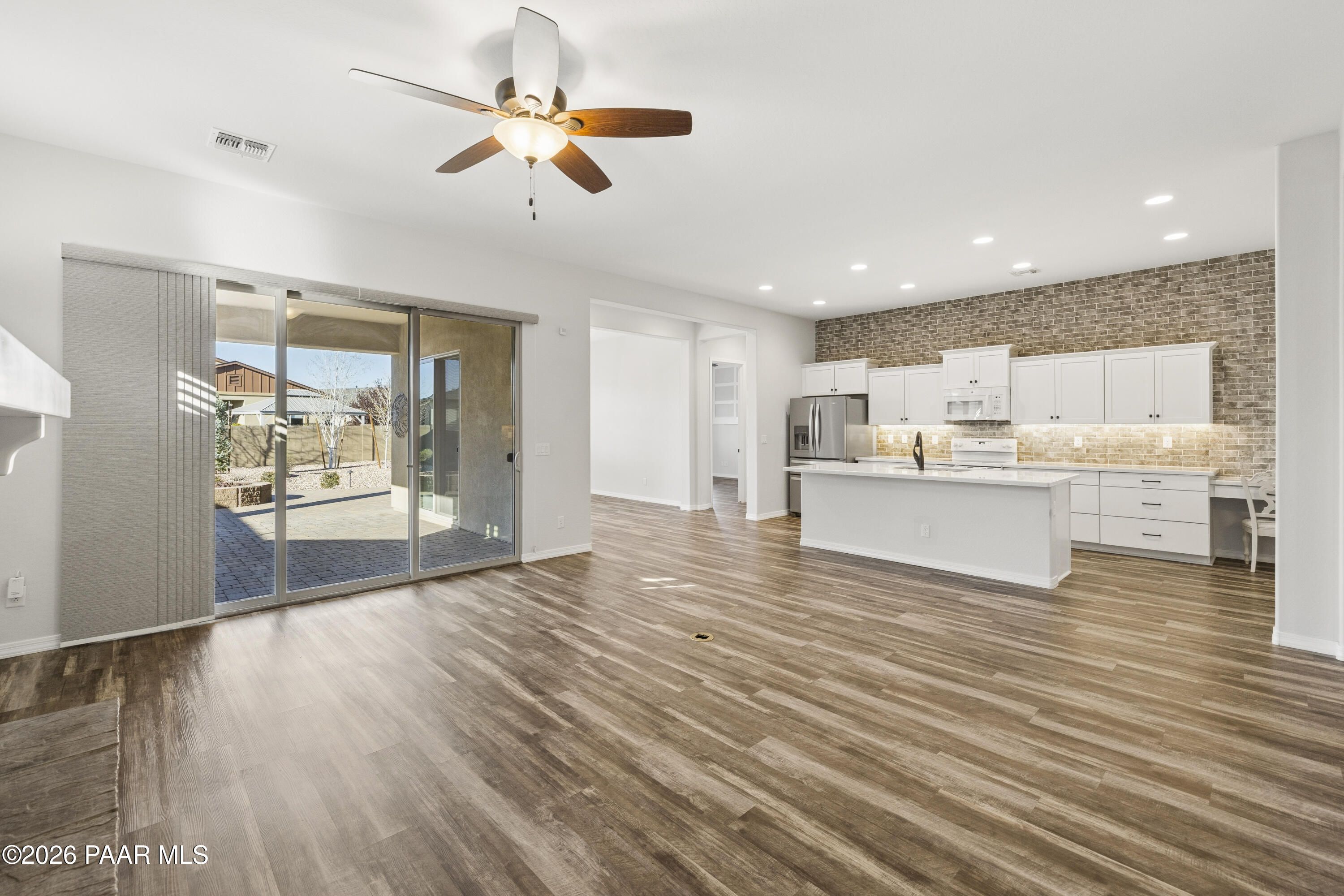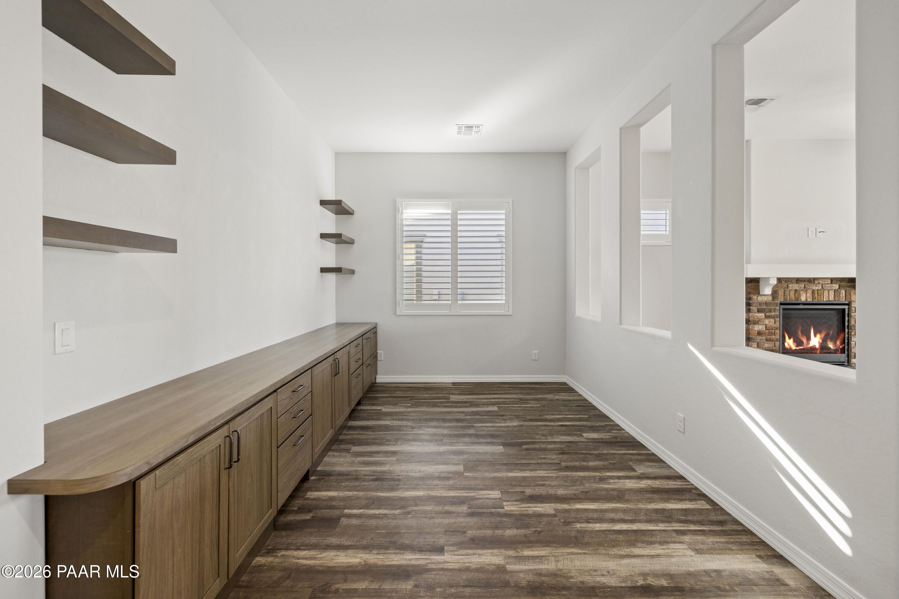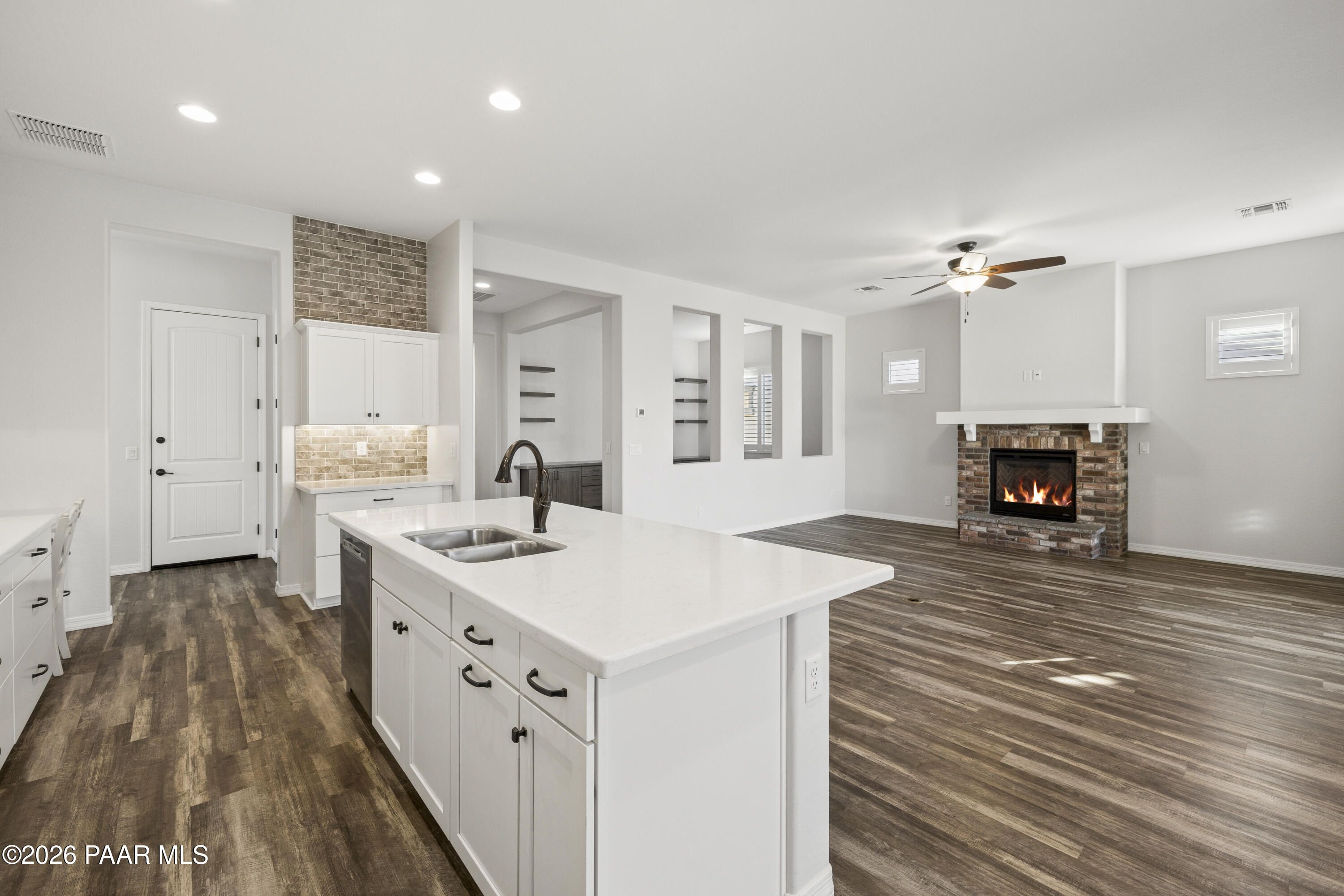Tucked within the sought-after Pronghorn Ranch community, this 2019-built residence offers a refined blend of comfort, efficiency, and low-maintenance living.Thoughtfully designed for ease and everyday enjoyment, this 2-bedroom, 2-bath home features 1,943 square feet of well-appointed space with luxury vinyl tile flooring throughout and an open, inviting layout. The kitchen is both functional and polished, showcasing quartz countertops, a spacious island, tile backsplash across two walls, built-in desk, and under-cabinet lighting.The primary suite is a quiet retreat with a beautifully tiled walk-in shower featuring a pebbled floor and an expansive walk-in closet. A dedicated den/office with custom built-in cabinetry and shelving offers flexibility for work or hobbies.Step outside to a covered patio with an outdoor fireplace--perfect for entertaining and enjoying Prescott Valley's crisp evenings--while the fully landscaped and fenced backyard provides privacy and ease. Additional highlights include an epoxy-coated garage floor, laundry room with utility sink, gas fireplace in the living room, and solar panels ensuring a tiny electric bill and monthly credits at times.Residents of Pronghorn Ranch enjoy access to a clubhouse, fitness center, pool and spa, tennis courts, and more--creating a lifestyle that's both active and relaxed.A quietly exceptional home designed for those who appreciate quality, comfort, and simplicity.