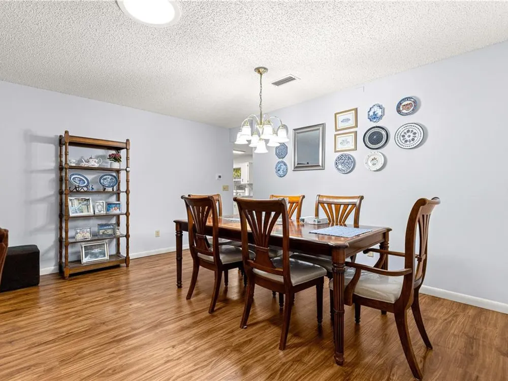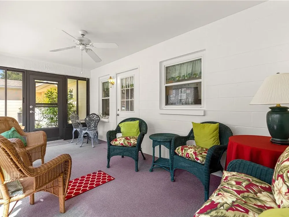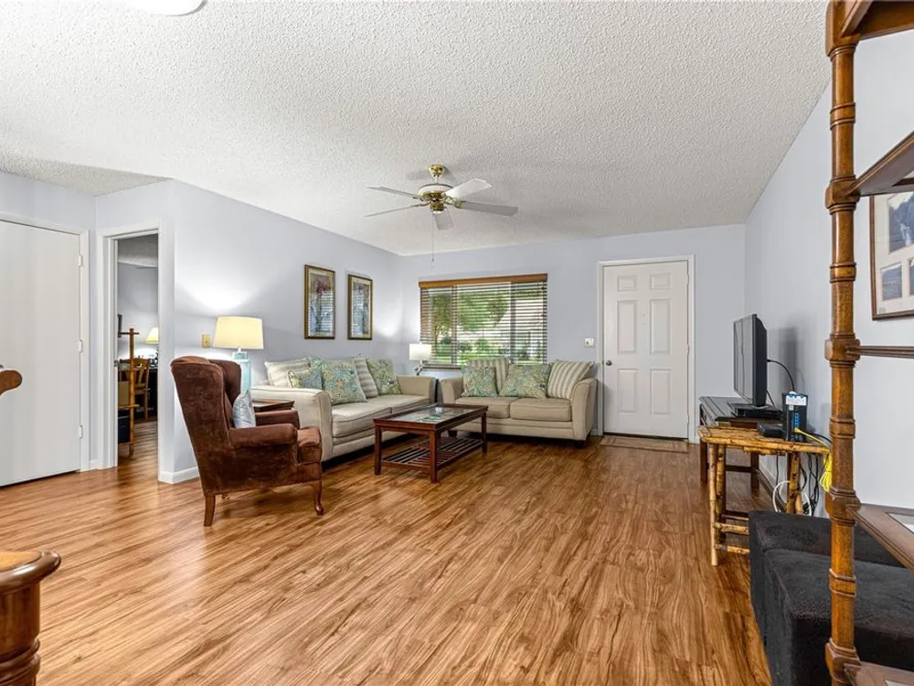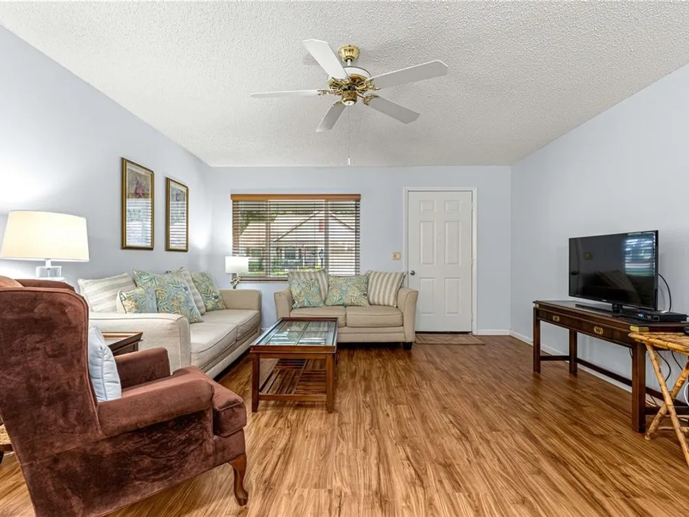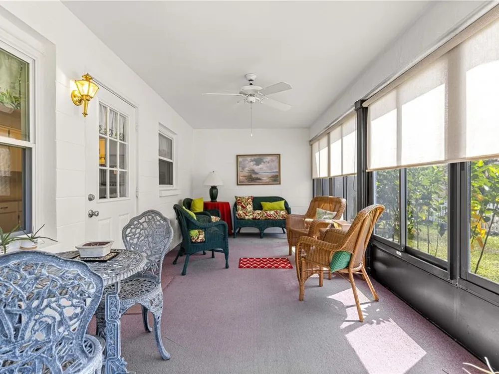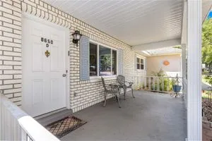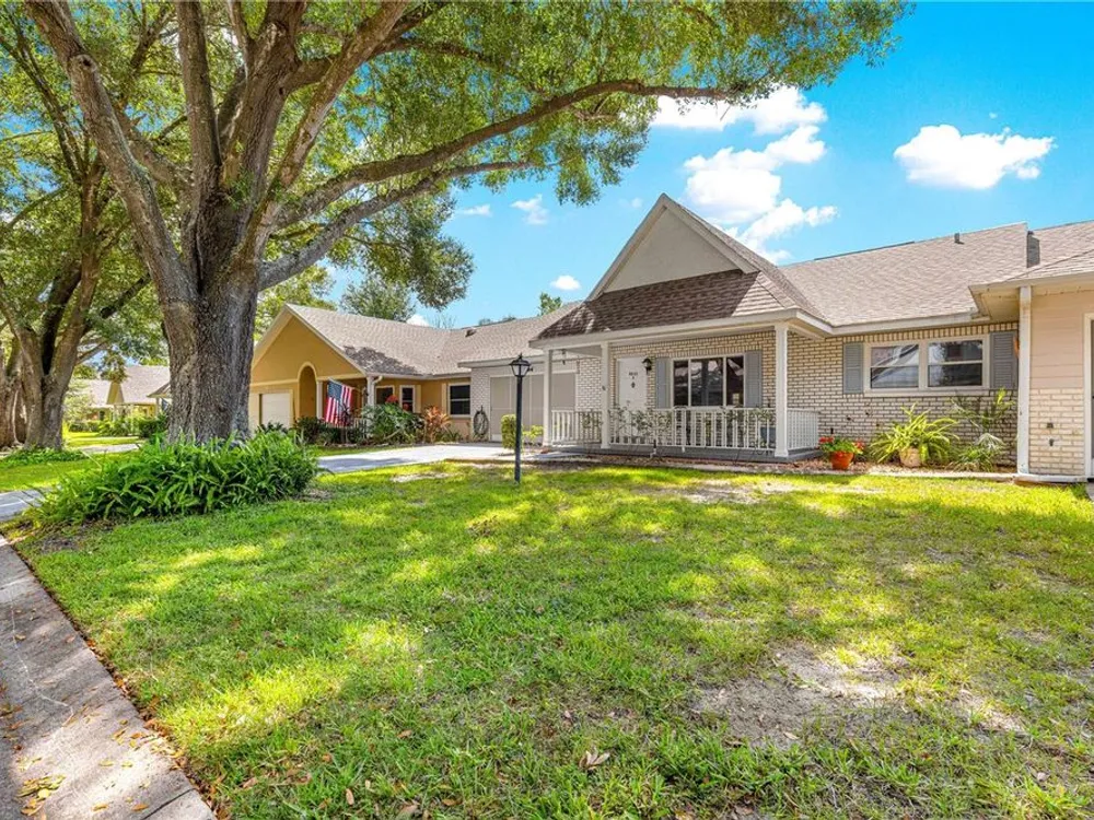 Stunning Philadelphian model across from designated wooded park lot. Lovely quiet street. Note full width front porch for 5:00 somewhere visits with the neighbors! Poured concrete bed borders make a striking statement as you enter this lovely home. Dark wood laminate flooring highlighted by large skylight fills the great room and dining area with light. Another solar tube fills the kitchen with light. All new stainless appliances make entertaining a pleasure! The glass enclosed lanai overlooks tailored flower beds--a great retreat for cool evening card games. The primary suite offers deep walk in closet, custom blinds and a stone-finish walk-in shower and vanity sink. One and a half car garage with plenty of storage space. Laundry center in garage with full screens. Great location close to everything! All furniture is available.