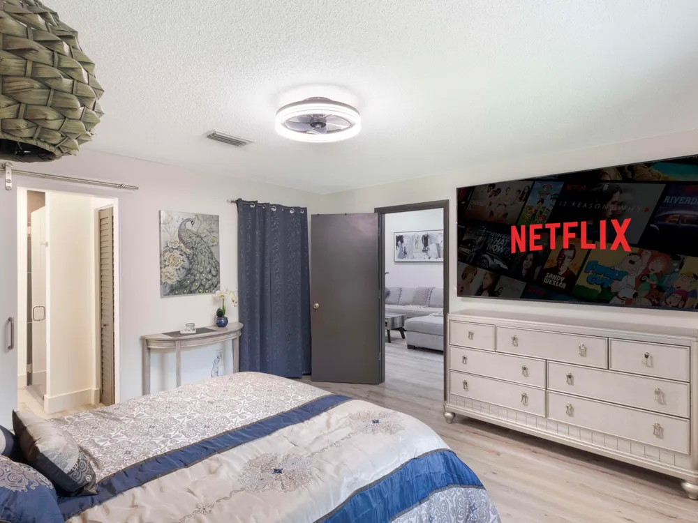 - Custom Mirrors, Decorative Fireplace, Entry Level Living Area, Pantry, Split Bedrooms, High Ceilings, Walk-In Closet(s), Storage, Blinds, Impact Glass, Primary Downstairs