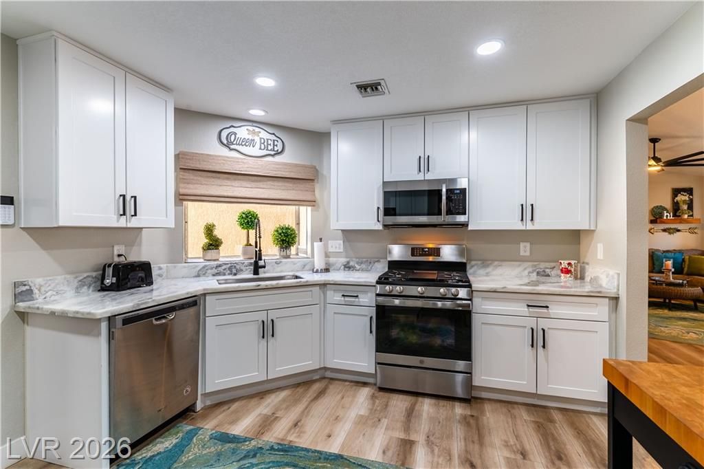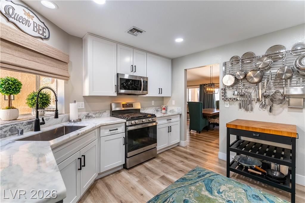 Fully remodeled and upgraded 1-story townhouse in Sun City Summerlin! This complete remodel is floor to ceiling and includes new paint, stainless steel appliances, luxury vinyl plank flooring, modern cabinets, quartz countertops, high-end light and plumbing fixtures, and custom window coverings! The open, bright, airy floor plan is extremely efficient, featuring split bedrooms, vaulted ceilings, a very open and social living and dining area, and a beautifully remodeled kitchen with extra storage! The fridge, washer, and dryer are included in the sale, and all of the professional furnishings and decorations are negotiable. The HVAC, furnace, and water heater are only 2 years old! Please contact Billy O'Keefe for a full list of community and area features! This community offers an incredibly enriching lifestyle, as well as the Summerlin master-planned community in its entirety!