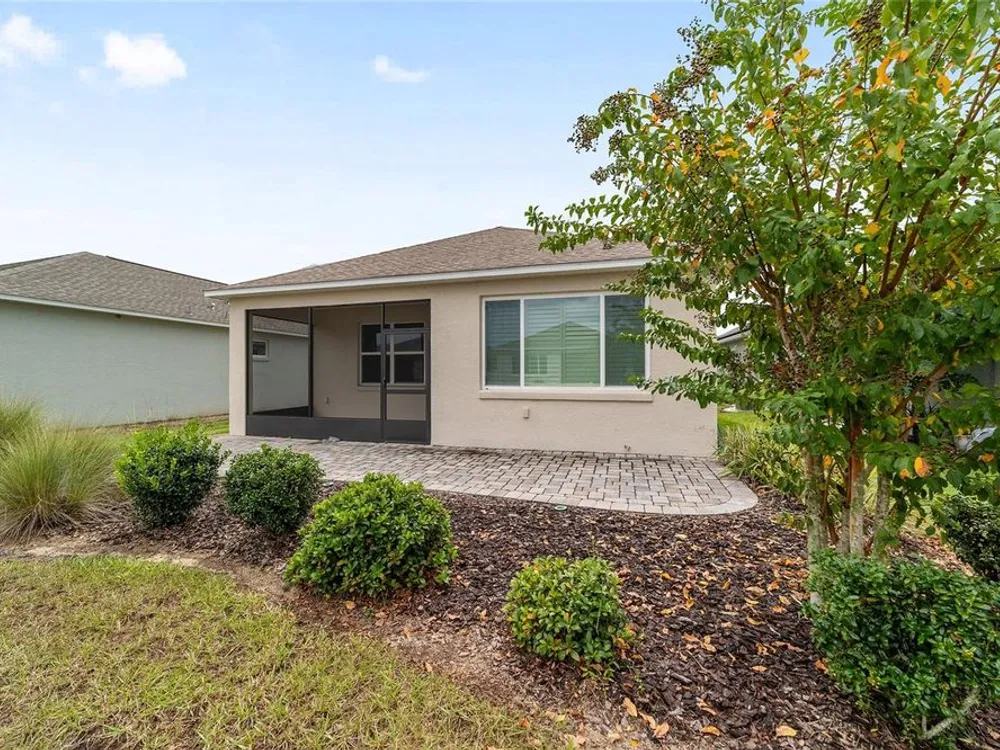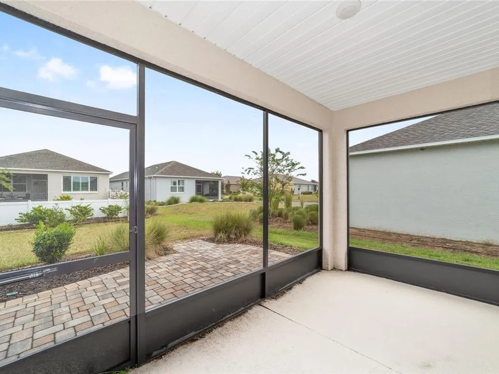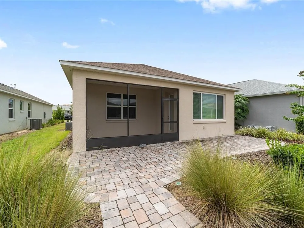 Move-in ready Elon model located in the desirable Weybourne Landing community within On Top of the World. This 2-bedroom, 2-bath home offers bright natural light, ceramic tile in main living areas, carpeted bedrooms, and walk-in closets in all bedrooms. The master suite features a custom elegant stone walk-in shower. The kitchen includes bar seating for four and flows into the open living and dining areas. A screened lanai with ample seating and a small brick patio provide perfect outdoor living space. Some furniture is available for separate purchase as well as a 2016 Club Car golf cart with lithium battery.