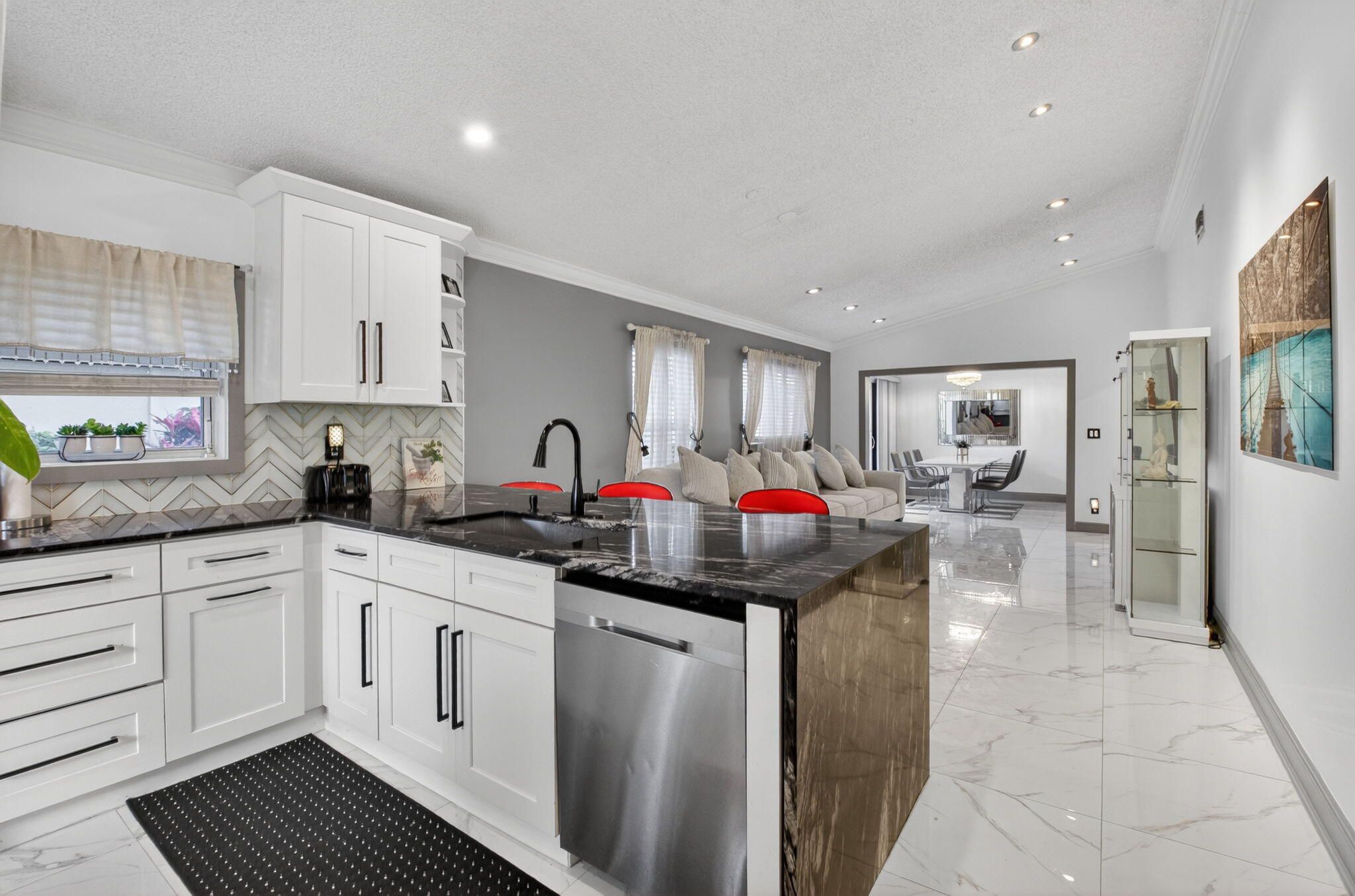 A true piece of paradise for retirees and empty nesters seeking an elegant Boca Raton lifestyle. This exquisitely renovated 2-bedroom, 2-bath end-unit home features VAULTED ceilings and a bright open-concept design. All IMPACT WINDOWS throughout, BRAND-NEW ROOF (2025), new porcelain tile floors, a luxury kitchen with top-of-the-line waterfall granite countertops, newer stainless steel appliances, and an elegant dining area perfect for entertaining. The Florida room is enclosed with IMPACT SLIDERS and opens to a breathtaking, tranquil patio ideal for unwinding or hosting friends and family. Newer AC and water heater. 14 functioning Spa-like primary shower bath, Modern