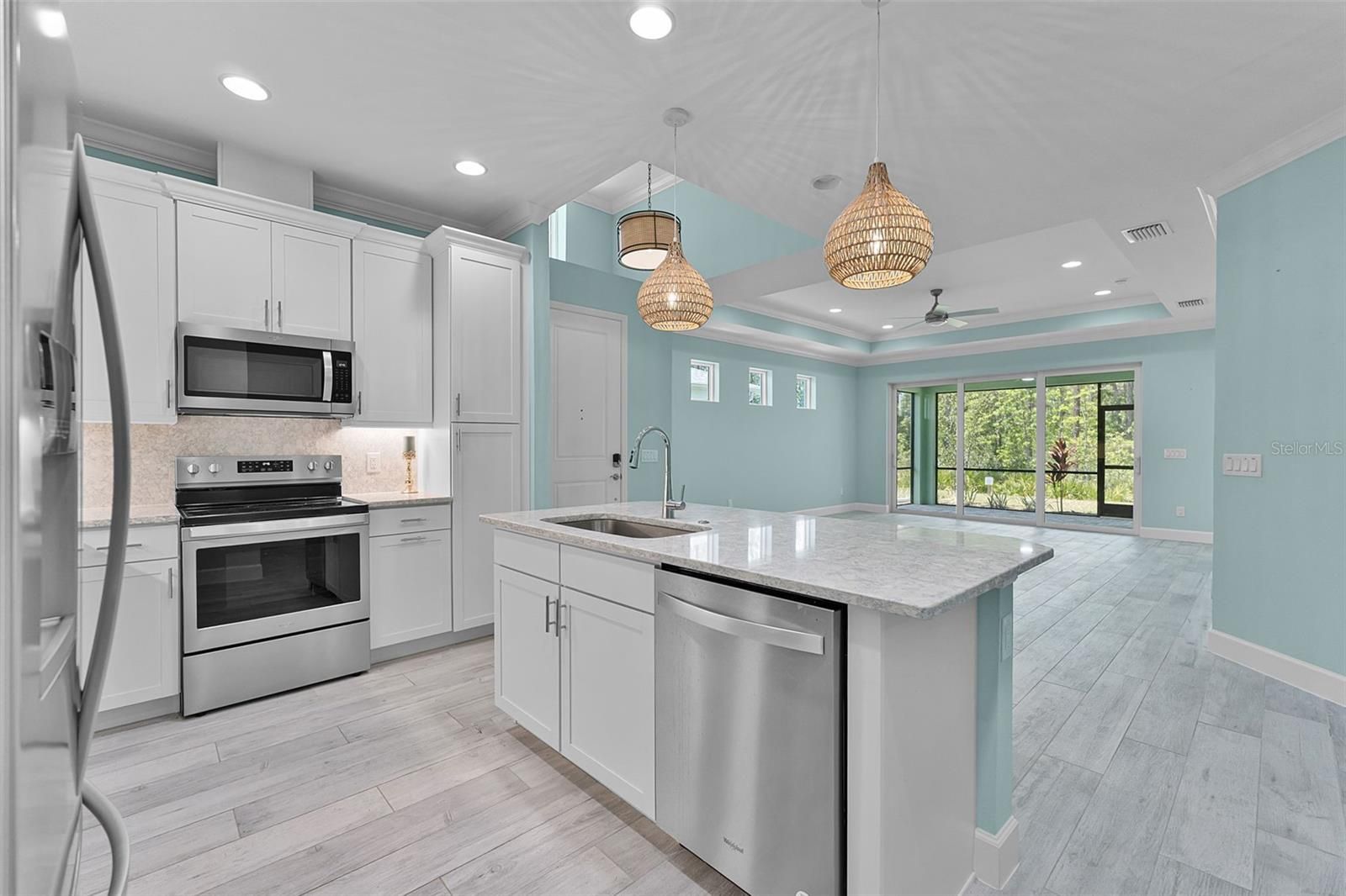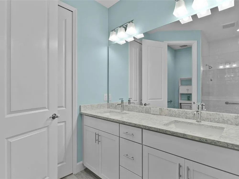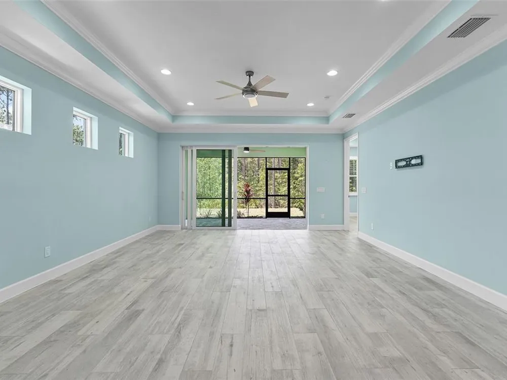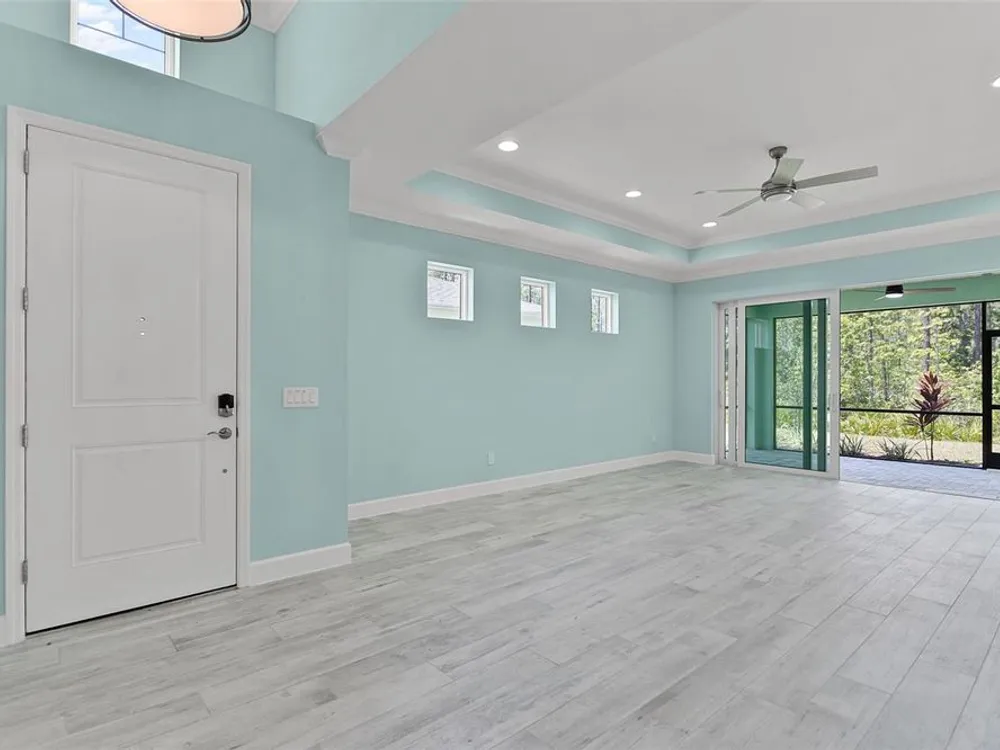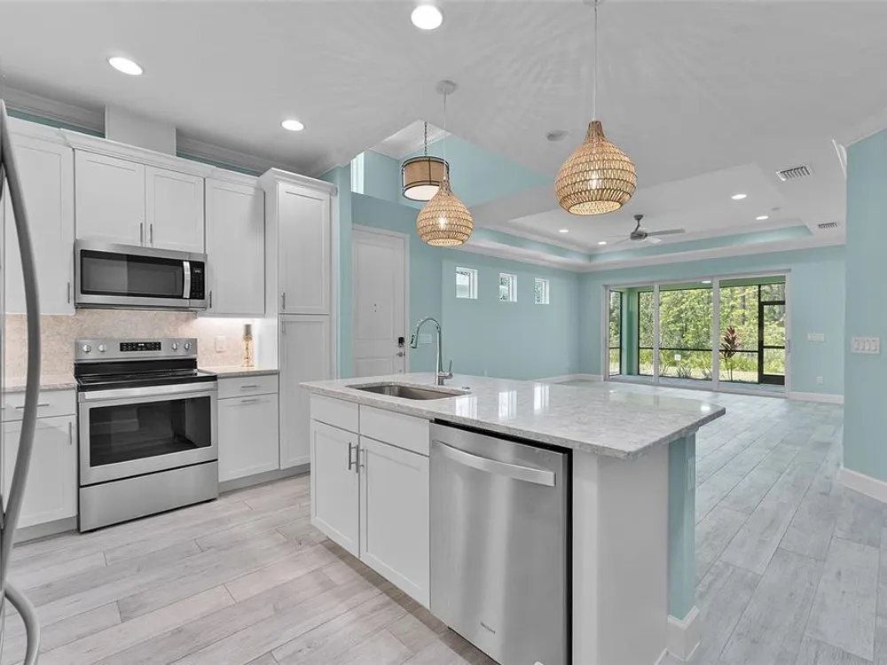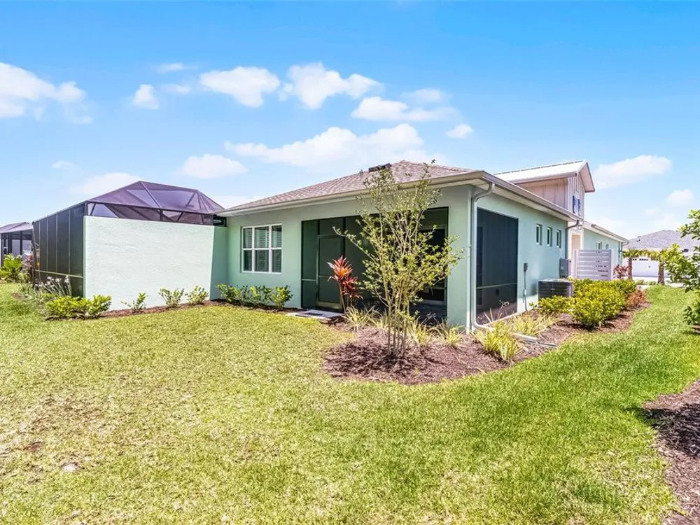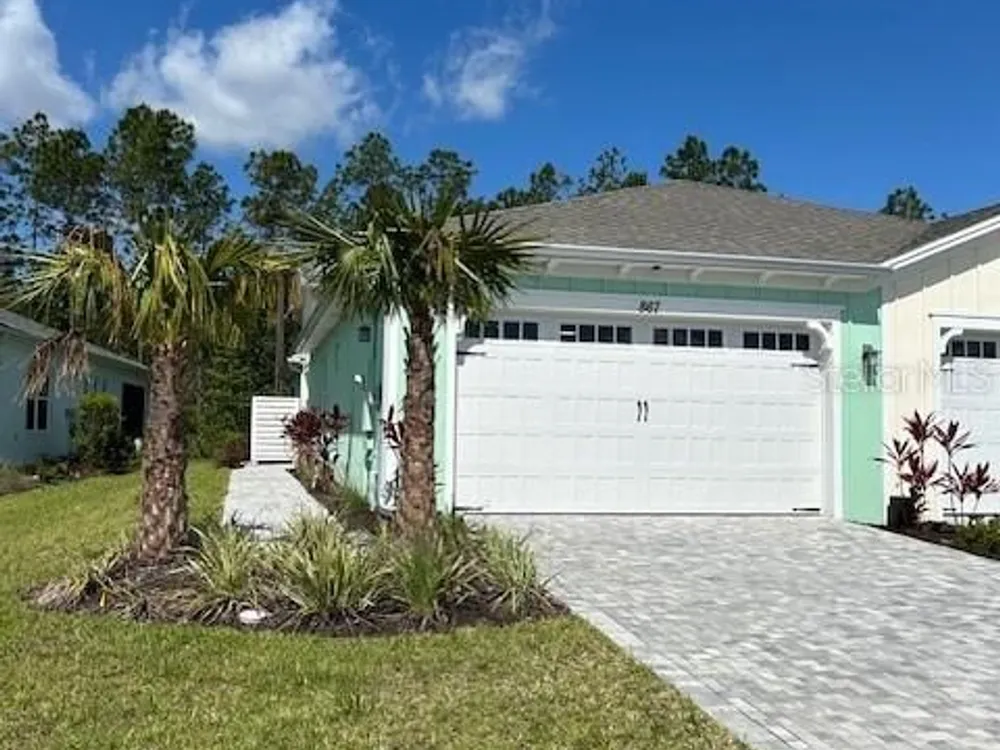 In the sought-after community of Latitude Margaritaville in Daytona, this Tortola Villa is the largest villa model available, offering 1,748 square feet of meticulously upgraded living space. Built in 2023 and thoughtfully enhanced with over $30,000 in custom features, the residence showcases the Meander Blue design palette with striking white and blue-accented quartz countertops, upgraded appliances, soft-close cabinetry with pullout inserts, and an eye-catching backsplash. Crown molding adds architectural refinement, while the thoughtfully designed layout includes two primary bedrooms, each with its en-suite bath and expansive walk-in closet featuring premium wood shelving systems. A beautifully appointed half bath provides added convenience for guests, bringing the total to three baths. A bonus feature is a versatile flex space that functions as an open-concept office or a separate sitting area—ideal for remote work or relaxation. Just beyond, a private backyard retreat offers tranquil views of a protected conservation area—creating a serene and secluded setting rarely found in active lifestyle communities. The high-efficiency HVAC system was upgraded for maximum performance and comfort. Residents enjoy access to a wealth of amenities, including indoor and outdoor pools, a full-service fitness center, spa, sauna, yoga and aerobics studio, and a restaurant called The Grill. The community features vibrant social programming with live music every weekend in the outdoor pavilion, along with a theater, craft room, dog spa and more. For those seeking the coastal lifestyle, a private community shuttle provides effortless transportation to an exclusive beachfront pool and pavilion, offering the luxury of oceanfront leisure without the need to drive. Latitude Margaritaville delivers the ultimate in active adult living.