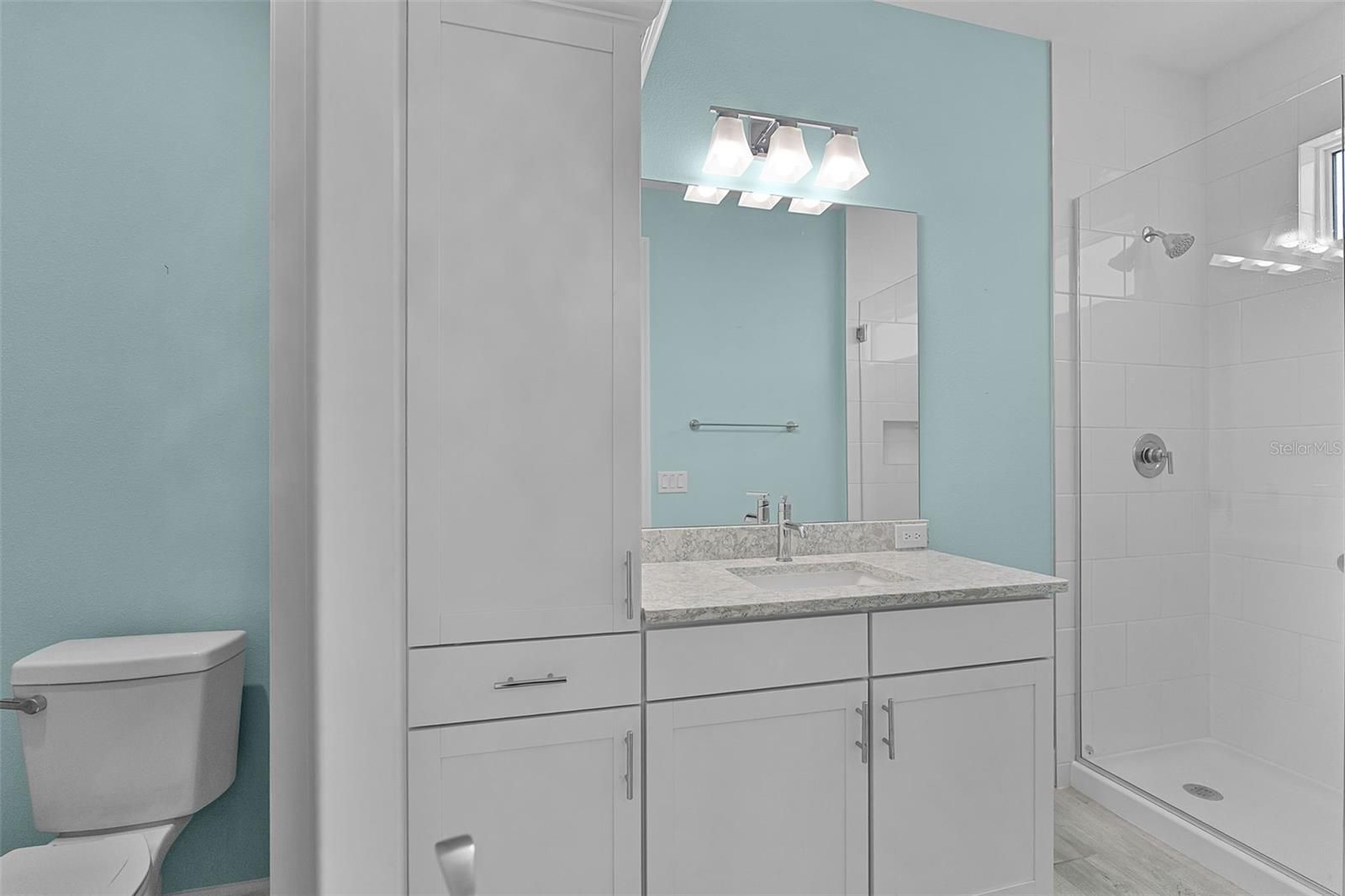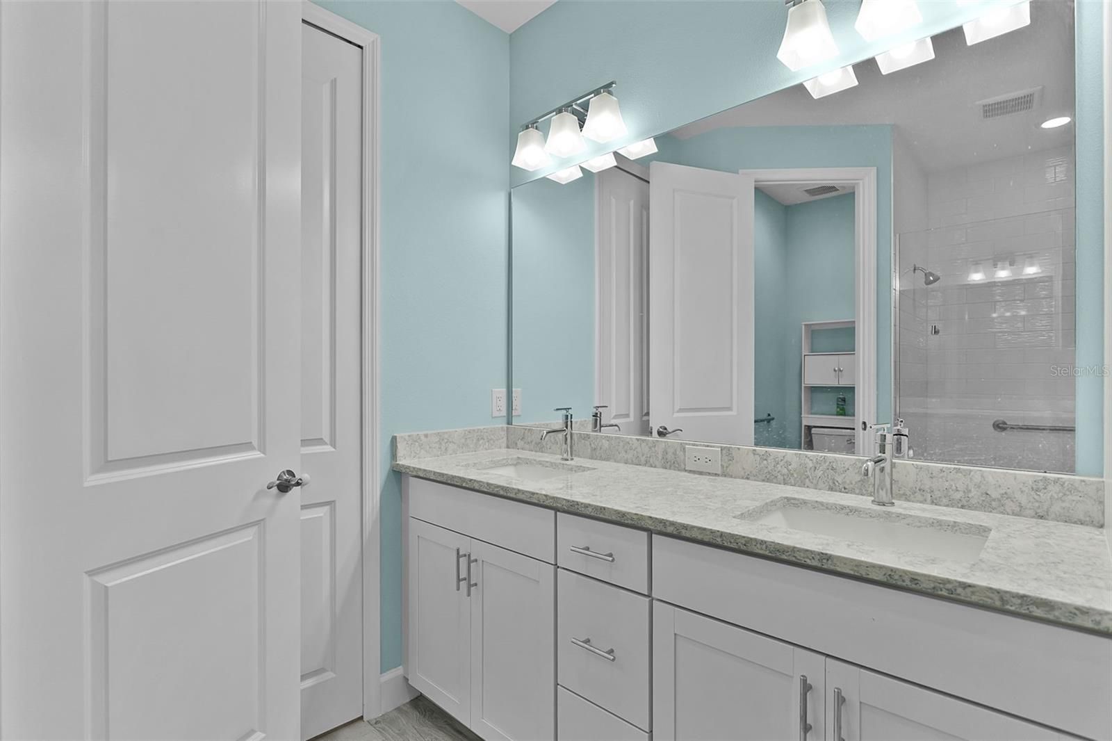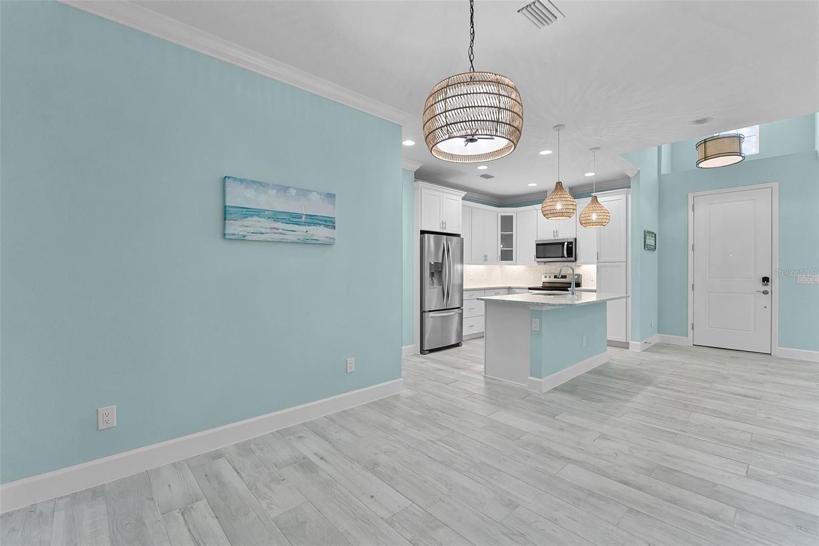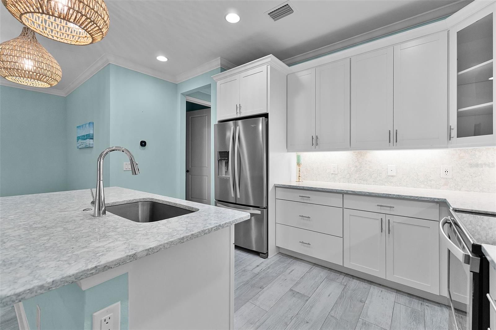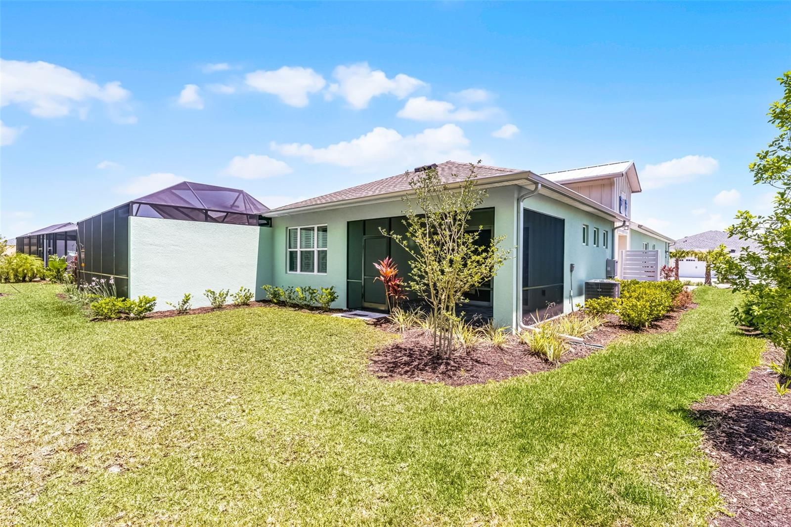 In the sought-after community of Latitude Margaritaville in Daytona, this Tortola Villa is the largest villa model available, offering 1,748 square feet of meticulously upgraded living space. Built in 2023 and thoughtfully enhanced with over $30,000 in custom features, the residence showcases the Meander Blue design palette with striking white and blue-accented quartz countertops, upgraded appliances, soft-close cabinetry with pullout inserts, and an eye-catching backsplash. Crown molding adds architectural refinement, while the thoughtfully designed layout includes two primary bedrooms, each with its en-suite bath and expansive walk-in closet featuring premium wood shelving systems. A beautifully appointed half bath provides added convenience for guests, bringing the total to three baths. A bonus feature is a versatile flex space that functions as an open-concept office or a separate sitting area—ideal for remote work or relaxation. Just beyond, a private backyard retreat offers tranquil views of a protected conservation area—creating a serene and secluded setting rarely found in active lifestyle communities. The high-efficiency HVAC system was upgraded for maximum performance and comfort. Residents enjoy access to a wealth of amenities, including indoor and outdoor pools, a full-service fitness center, spa, sauna, yoga and aerobics studio, and a restaurant called The Grill. The community features vibrant social programming with live music every weekend in the outdoor pavilion, along with a theater, craft room, dog spa and more. For those seeking the coastal lifestyle, a private community shuttle provides effortless transportation to an exclusive beachfront pool and pavilion, offering the luxury of oceanfront leisure without the need to drive. Latitude Margaritaville delivers the ultimate in active adult living.
