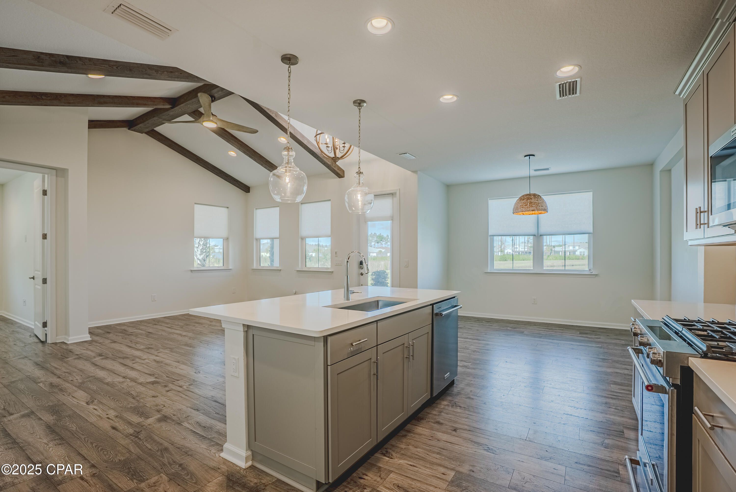 Location, Location, Location Discover your Dreamsicle cottage in Latitude Watersound, a premier 55+ community that offers the perfect blend of relaxation and adventure! This charming 2BR/2BA + Den features an open-concept layout that flows seamlessly from room to room. The kitchen boasts stunning quartz countertops with matching backsplash, a gas range, stainless steel appliances, 42'' upper cabinetry, ideal for cooking and entertaining. This home features a spacious wraparound screened porch, vaulted ceiling with beams in great room & recessed lighting throughout. Additional highlights include 8-ft interior doors, laminate & tile flooring in baths. Set in a prime sought-after location this cottage offers a perfect blend of facing a peaceful pond and gorgeous sunsets. Location is close to the world-class amenities, including resort-style pool, delicious on-site restaurant Bar & Chill, state-of-the-art fitness center with a 75-foot indoor lap pool. The Workin' and Play Center includes: The Hangar, The Clayground, Barkaritaville Spa, and the Last Mango Theatre and of course live entertainment multiple times each week at the bandshell. There are also pickleball courts, tennis courts, and bocce ball. Your fur babies will enjoy fun times at Barkaritaville Dog park. With a full social calendar of events, the fun never stops. Location will also be close to the groundbreaking Publix grocery store, and other business being built along Hwy 79. There is also a public marina in the future that will be conveniently located on the Intercoastal Water way. Everything is just a golf cart ride away. Tankless hot water heater 2023 HVAC 2023 Roof 2023.