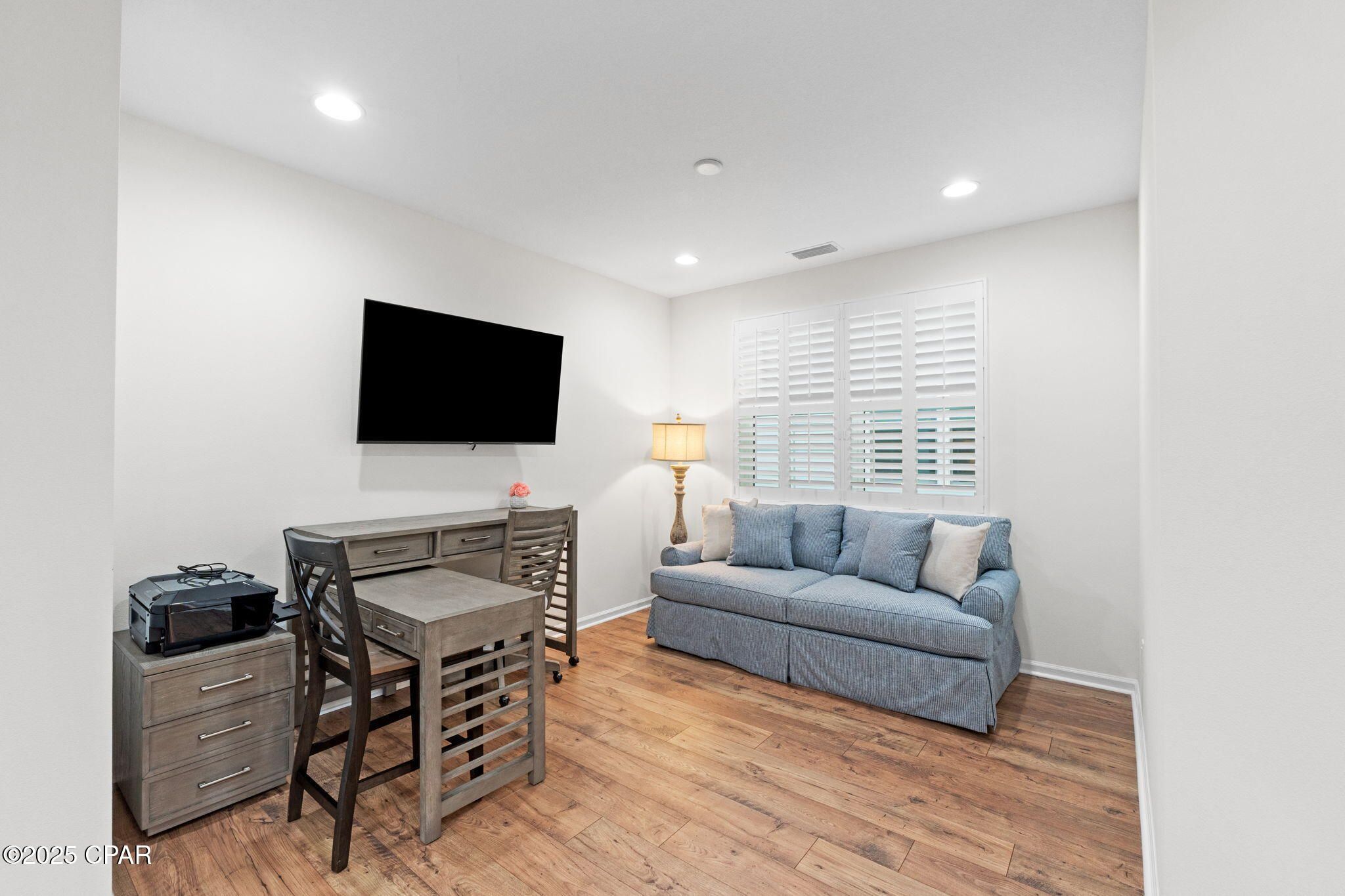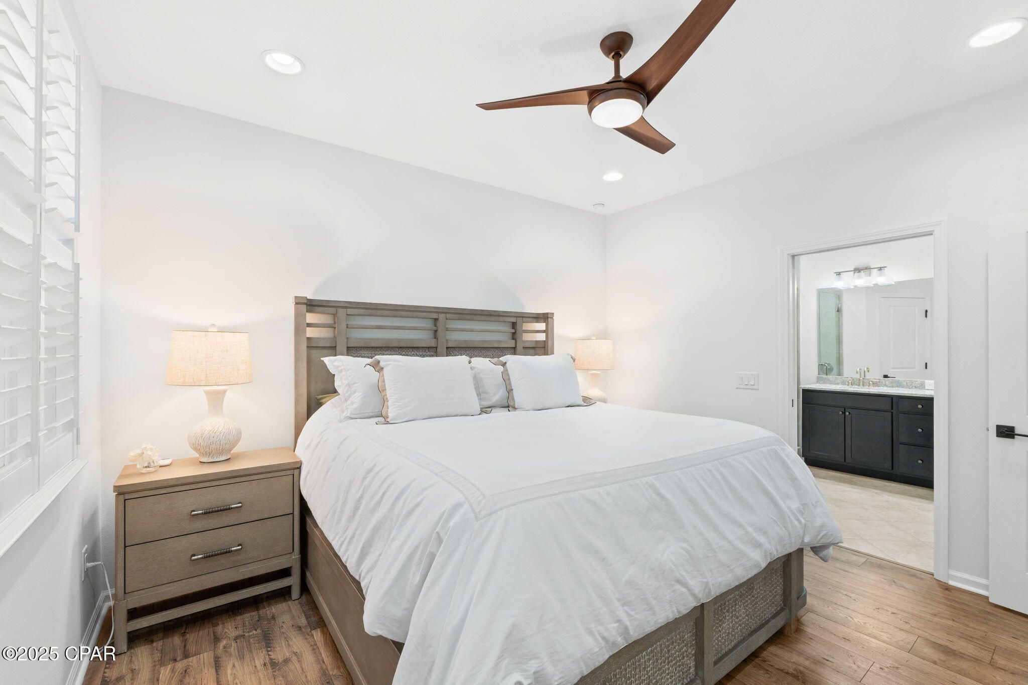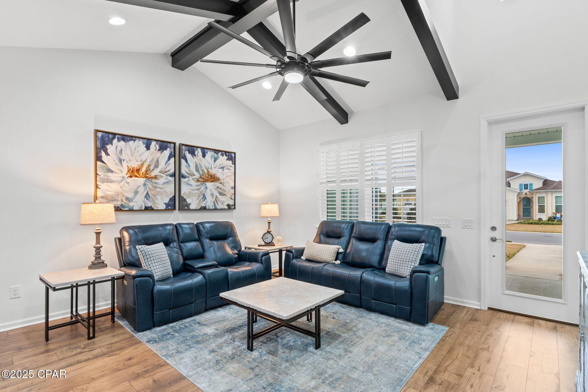 Kick off your flip-flops and step into island living with this fully furnished, nearly new 2-bedroom, 2-bath Camellia Cottage in Phase 4 of Latitude Margaritaville Watersound, a premier 55+ active adult community known for its vibrant lifestyle and world-class amenities. Thoughtfully designed and beautifully upgraded, this home offers the perfect blend of luxury, comfort, and the signature ''no worries'' Margaritaville state of mind. From the moment you enter through the upgraded glass front door, you're welcomed by bright, breezy interiors featuring plantation shutters, recessed lighting, designer paint, tasteful furnishings and upgraded laminate flooring, setting the tone for relaxed coastal living. The open-concept layout creates an inviting flow between the kitchen, dining, and living areas, ideal for entertaining, casual meals, or simply soaking in the laid-back island atmosphere. The kitchen is an island lover's dream, showcasing Level 5 cabinetry with pull-out shelves, a pots-and-pans drawer, crown molding, and an extended island accented by upgraded pendant lighting, perfect for conversations and a little cheeseburger in paradise. Matte black fixtures and hardware add a modern touch, while the gas range, undermount single-bowl sink, Advantage French-door refrigerator, and charming coffee/wine bar make everyday living a pleasure. The living area features decorative ceiling beams and a stylish ceiling fan, creating a cozy retreat after a day of sun and fun. The primary suite is a true sanctuary, complete with a custom built-in closet system and a spa-inspired bathroom featuring floor-to-ceiling tile shower with a seamless glass shower enclosure, cabinet stack drawers, and upgraded Level 5 cabinetry. The guest bedroom is perfectly positioned near a full bath with upgraded cabinetry and tile flooring, so your visitors have a taste of paradise too. Additional highlights include a well-appointed laundry room with cabinetry above the included Whirlpool washer and dryer (with pedestals), a garage laundry sink, TVs in every room, and the home is being sold fully furnished, allowing you to move right in and start living the Margaritaville lifestyle from day one. Life in Latitude Margaritaville Watersound revolves around the vibrant Town Square, the heart of the community where neighbors gather, music fills the air, and every day feels like a celebration. At its center is the stunning Paradise Pool, a resort-style oasis with sparkling waters, shady tiki huts, and plenty of space to relax while visiting with neighbors. Residents enjoy an unmatched amenity lineup, including an indoor lap pool, a state-of-the-art fitness center, spa services, pickleball, tennis and basketball courts, miles of walking and golf-cart trails, a kayak launch, and lush green spaces. Entertainment thrives at the Last Mango Theater, while creative spaces like the ''Clayground'' pottery studio and woodworking shop offer opportunities to learn, create, and connect. Even four-legged family members are pampered with an on-site pet groomer and the popular Barkaritaville Dog Park. Live music, outdoor activities and a lively monthly farmer's market bring island energy right to your doorstep, and best of all, no yard maintenance; with the HOA covering exterior painting and roof replacement. That means more time to relax and enjoy the good life. Just outside the neighborhood, convenience continues with a new Publix grocery store currently breaking ground, additional retail coming soon, a future marina under development, and a new hospital being built nearby for easy access to top-tier medical care. In Margaritaville, everything you need—fun, relaxation, convenience, and community is right at your fingertips. With shopping, dining, and entertainment just moments away, this home offers the perfect blend of luxury, convenience, and island inspired living, just bring your flip-flops!