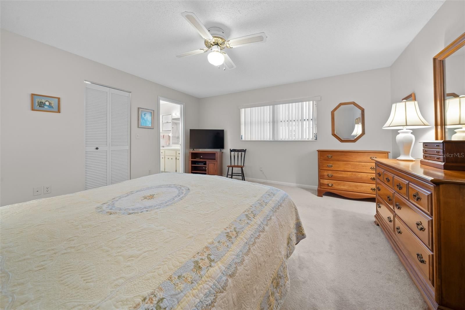 - Ceiling Fan(s), Eat-in Kitchen, Main Level Primary, Solid-Wood Cabinets, Thermostat, Walk-In Closet(s)